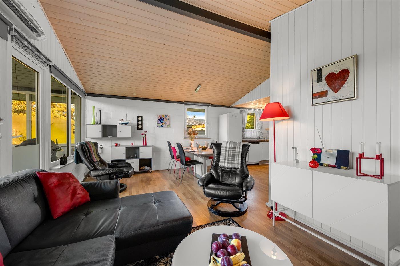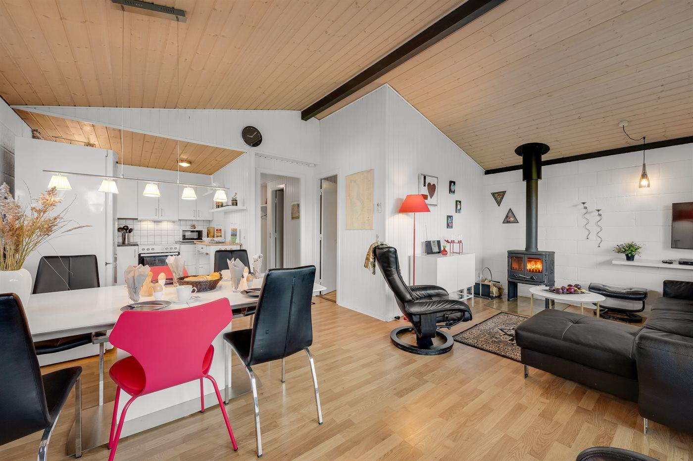 Her får du de perfekte rammer til hyggelige stunder med familie og venner – hvad enten det er foran den lune brændeovn, med en spændende bog i sofaen eller til en sjov spilleaften i den varme, indbydende atmosfære. Hunden kan også trygt være med, da en del af grunden er indhegnet.