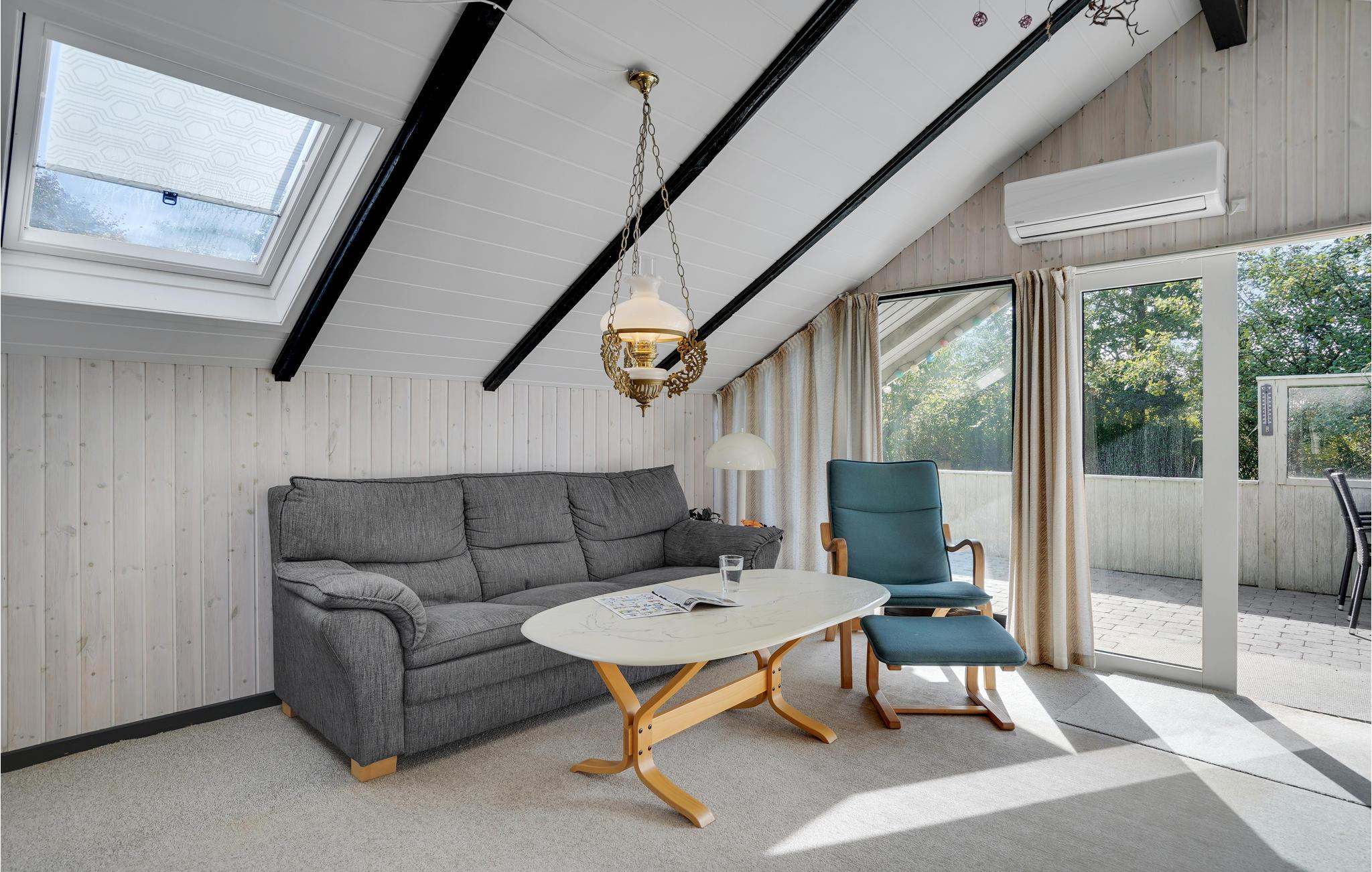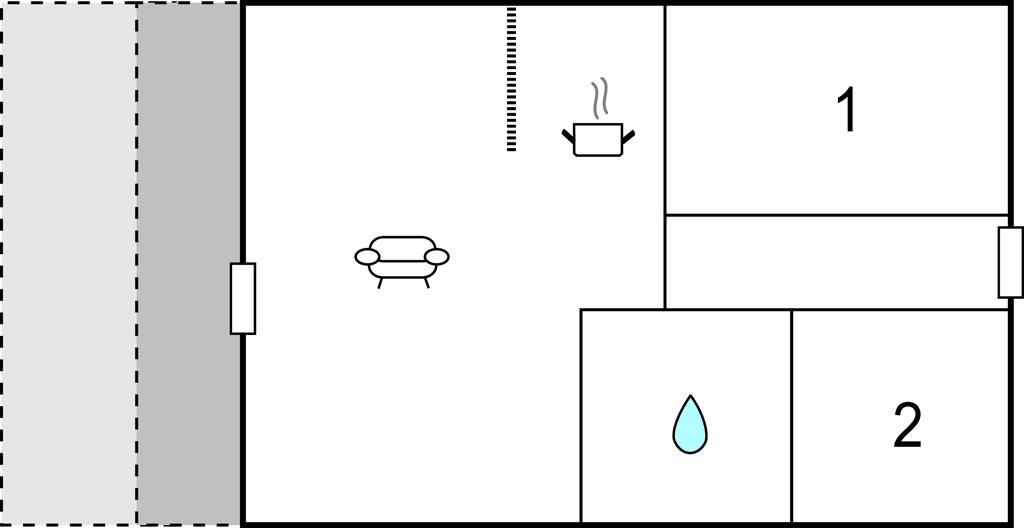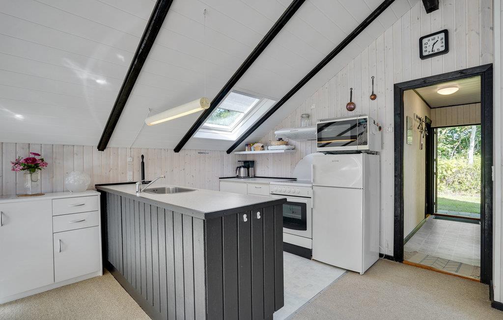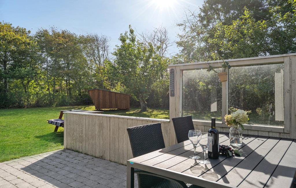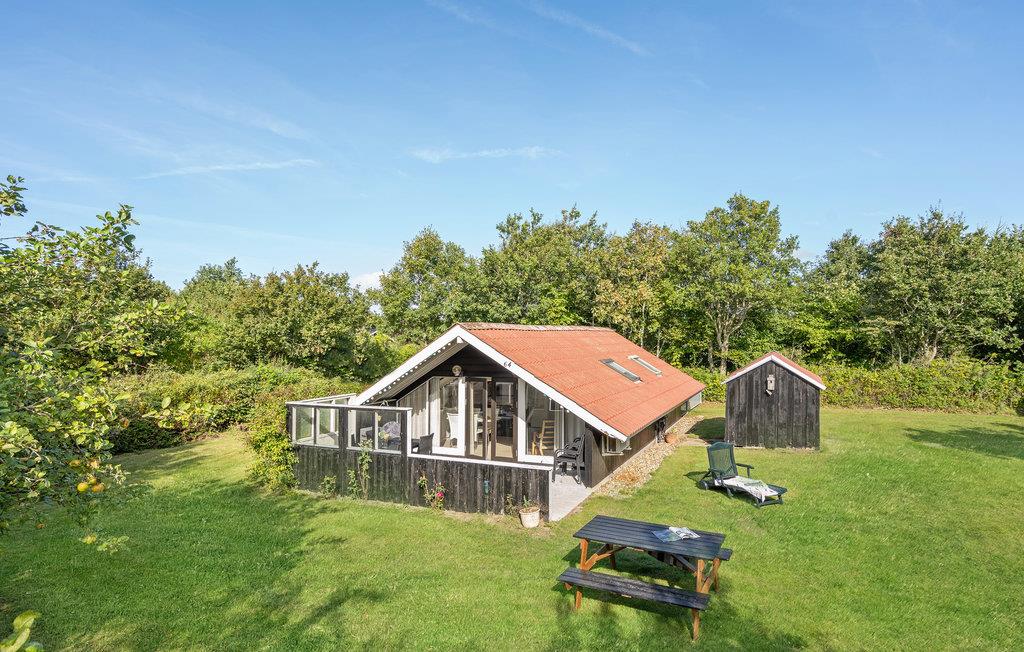 Huset er lyst og velindrettet med et køkken, der ligger i åben forbindelse til stuen, 2 soveværelser og badeværelse med bruser. Fra stuen er der udgang til den delvis overdækkede terrasse, og på den store grund er der god plads til leg og boldspil. I hjørnet af haven er der opsat shelter og bålpads.