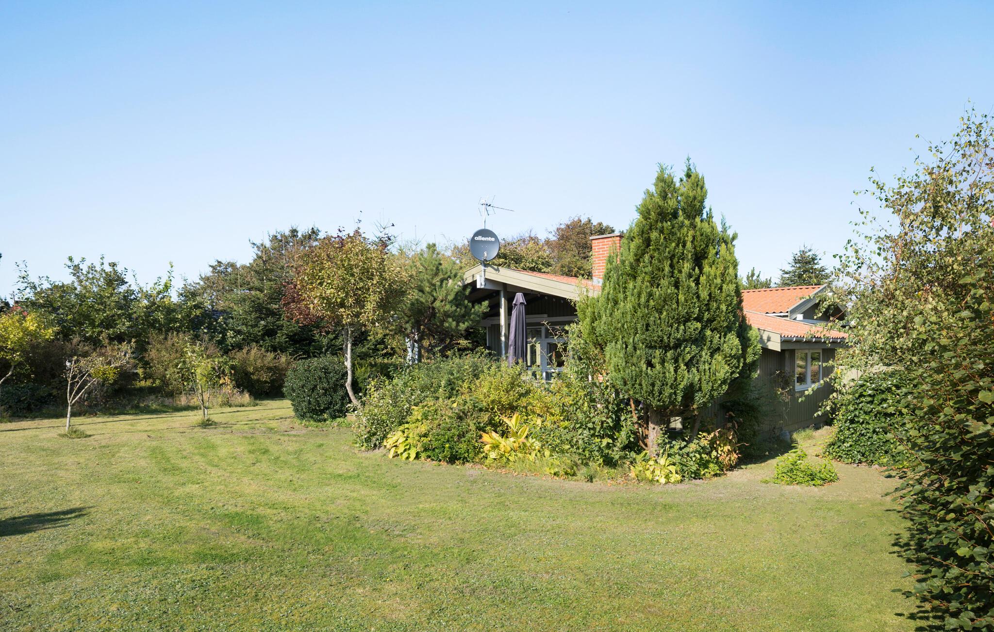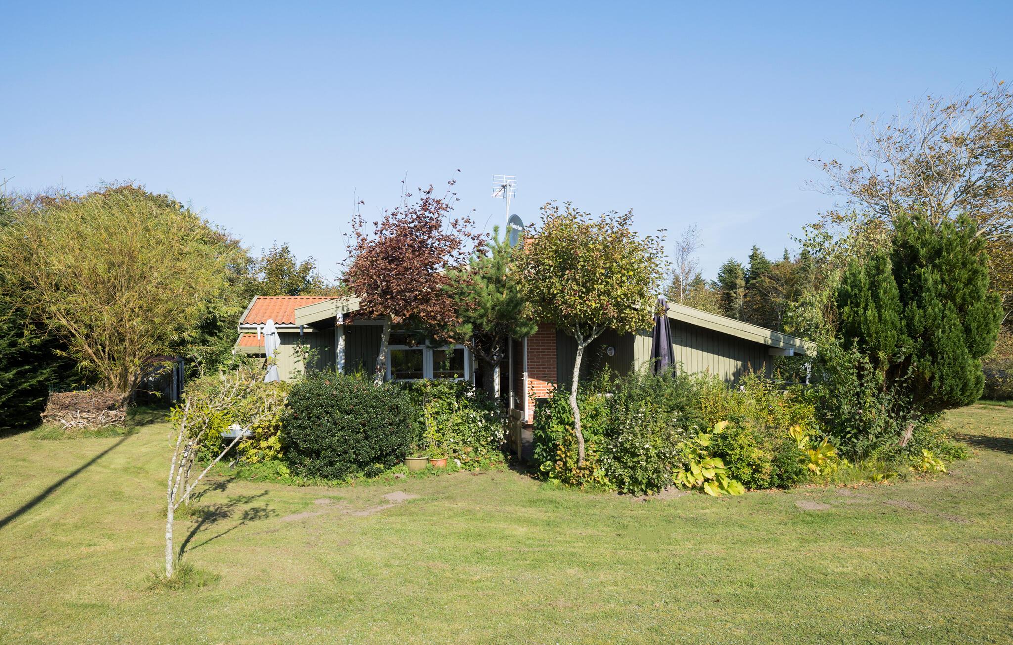 Hyggeligt træsommerhus nær Ringkøbing Fjord med stor have og plads til afslapning og leg.