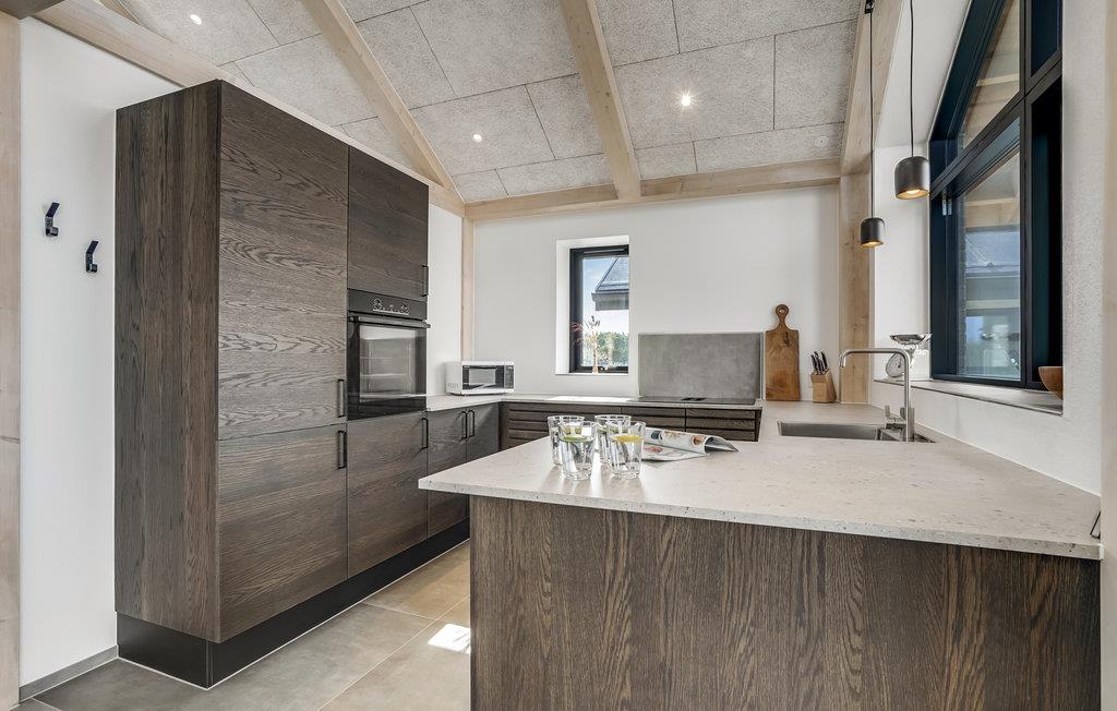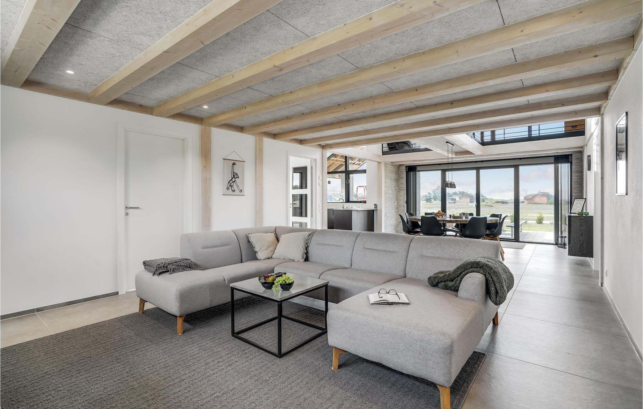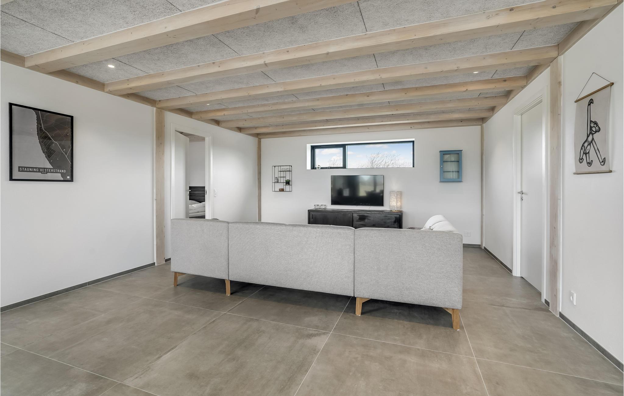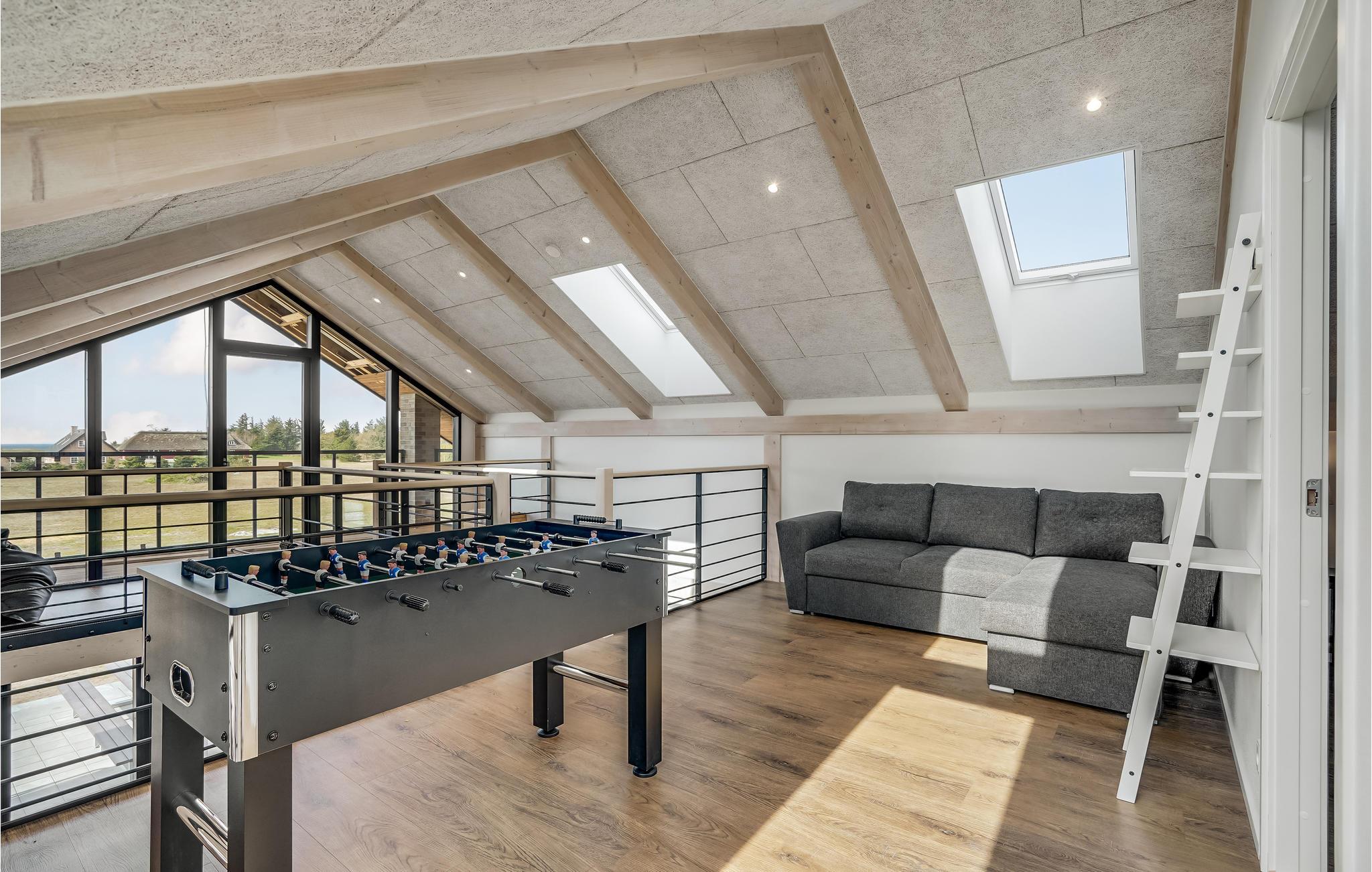 Velkommen til Stauning og dette fantastiske hus, som fremviser et væld af flotte stilvalg og elegante løsninger. Her har I gode rammer til at samles og nyde jeres feriedage ud til et smukt, åbent landskab, der fortsætter ned til vandet. Efter en lang dag på farten kan I læne jer tilbage med bøger og brætspil i stuen, udfordre hinanden til en dyst i aktivitetsrummet, hvor der er dart og airhockey eller snuppe et spil bordfodbold på 1. sal. Herfra er der desuden en fantastisk udsigt over fjorden, som også kan nydes husets skønne balkon.