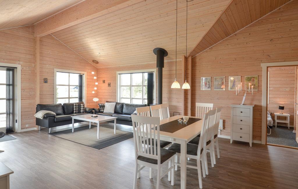 Flot sommerhus tæt på Ringkøbing Fjord med åben stue, terrasse og spabad i smukke naturomgivelser.