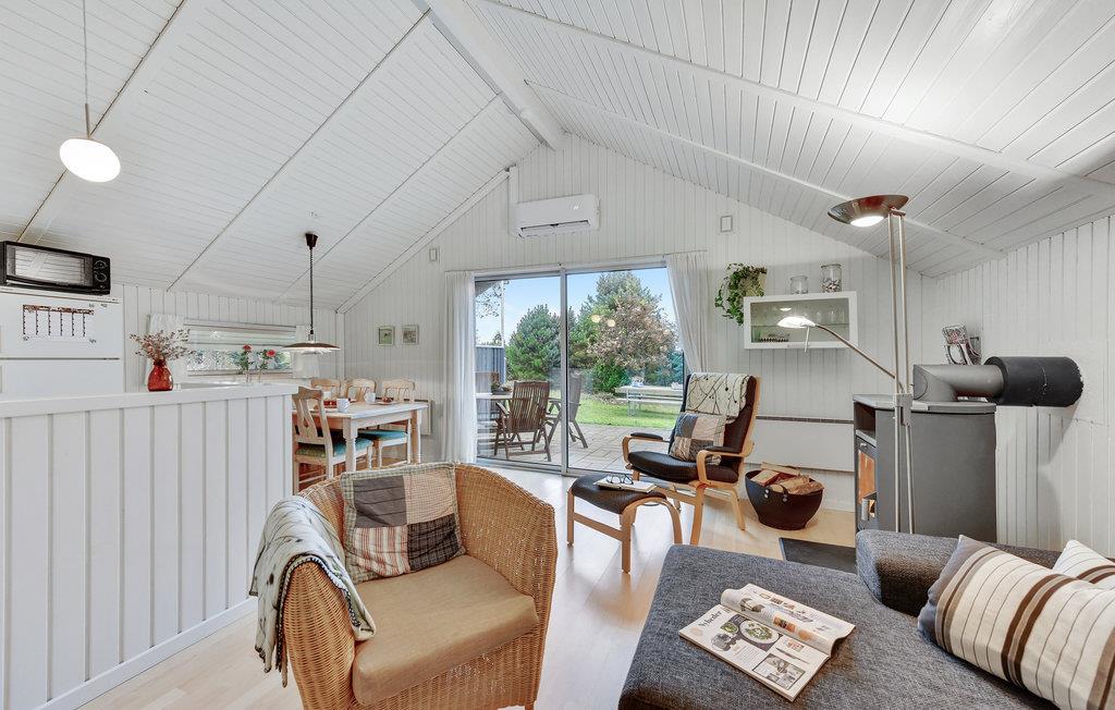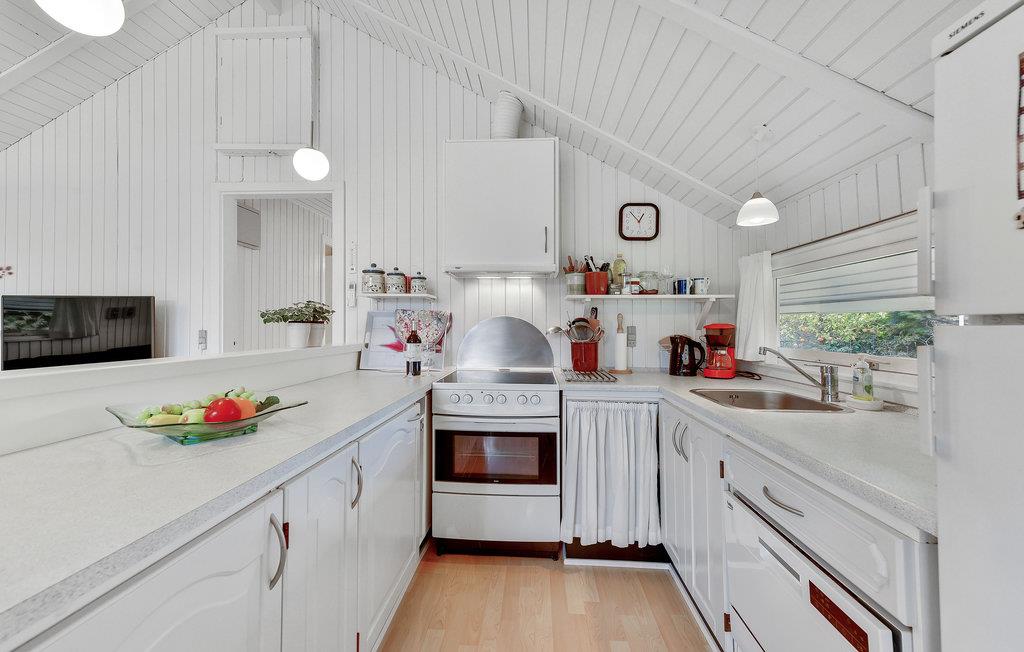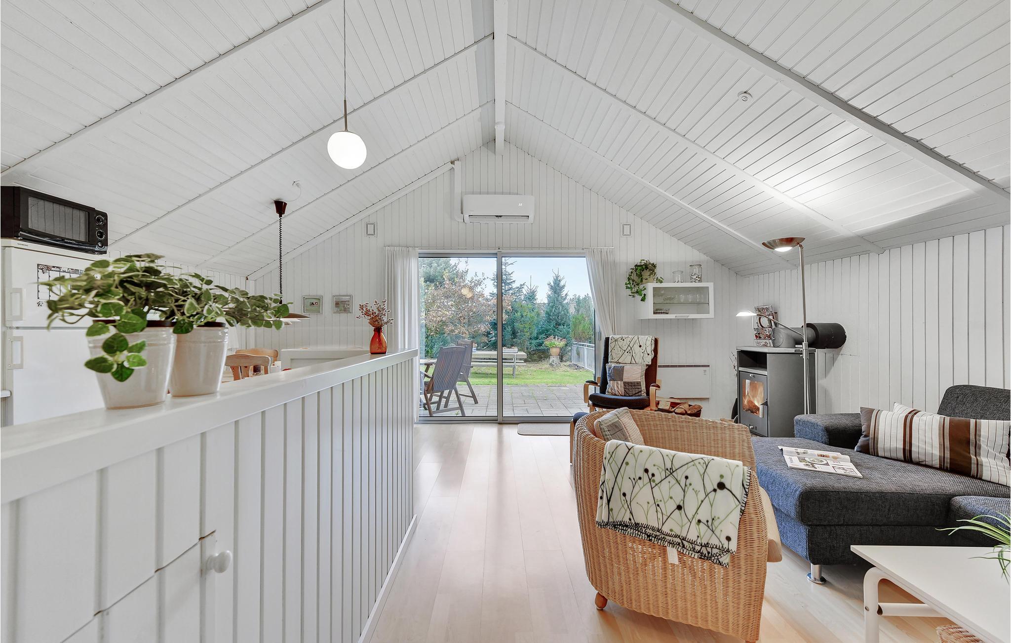 Grunden er komplet indhegnet og dermed perfekt, hvis du har hund eller små børn med. Huset er godt indrettet med 3 soveværelser, 2 med dobbeltseng og 1 med en enkeltseng. Her er et lyst badeværelse med bruser og et køkken, der ligger i åben forbindelse til spiseområdet og stuen. Fra stuen er der udgang til terrassen. I køkkenet er der opvaskemaskine, og som supplerende varmekilde findes både varmepumpe og brændeovn.