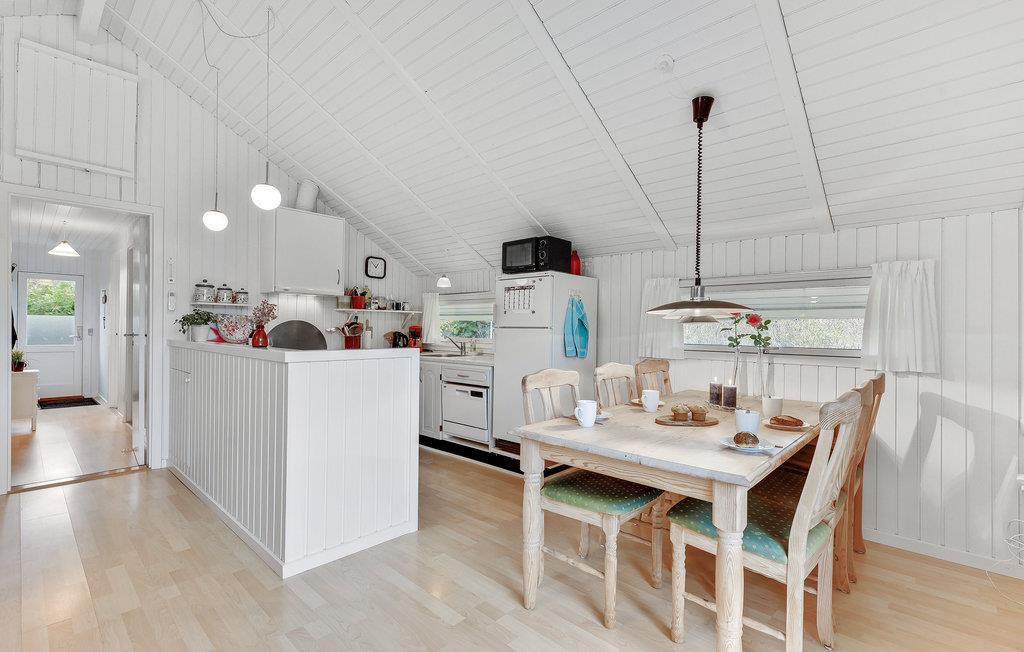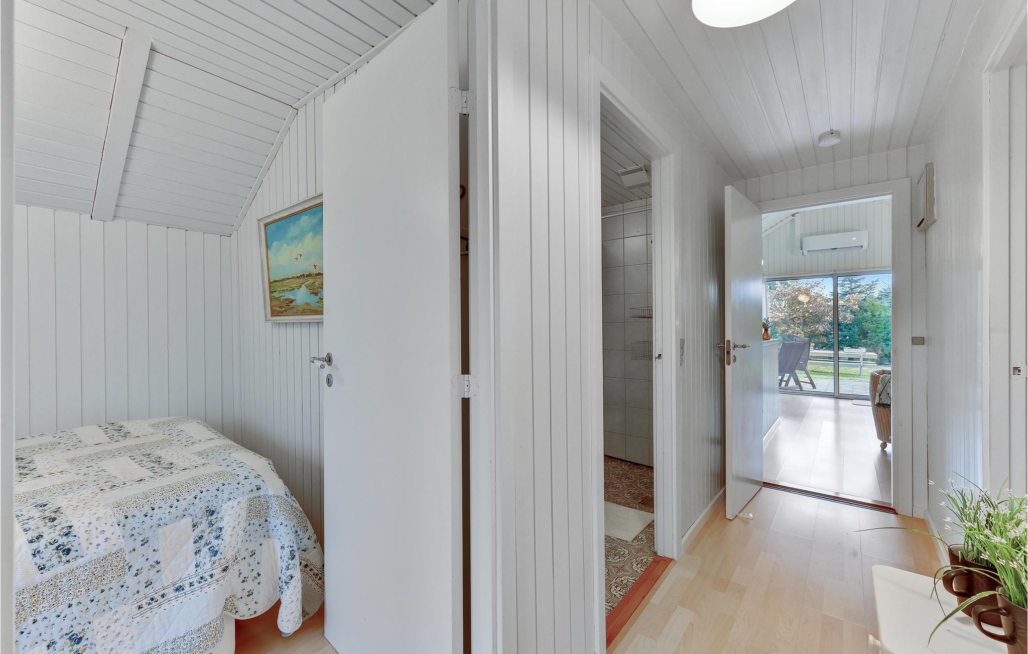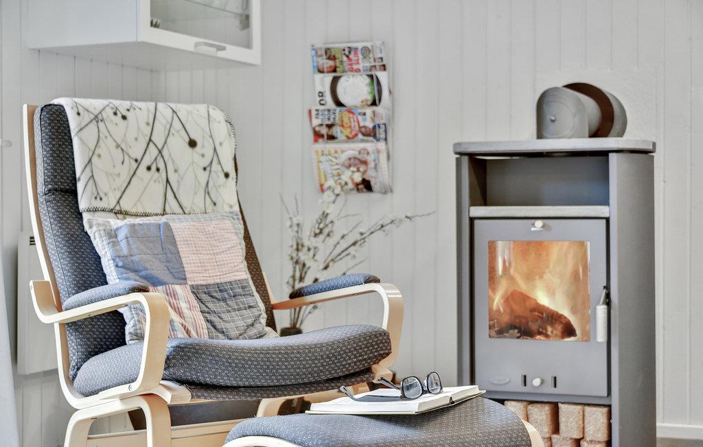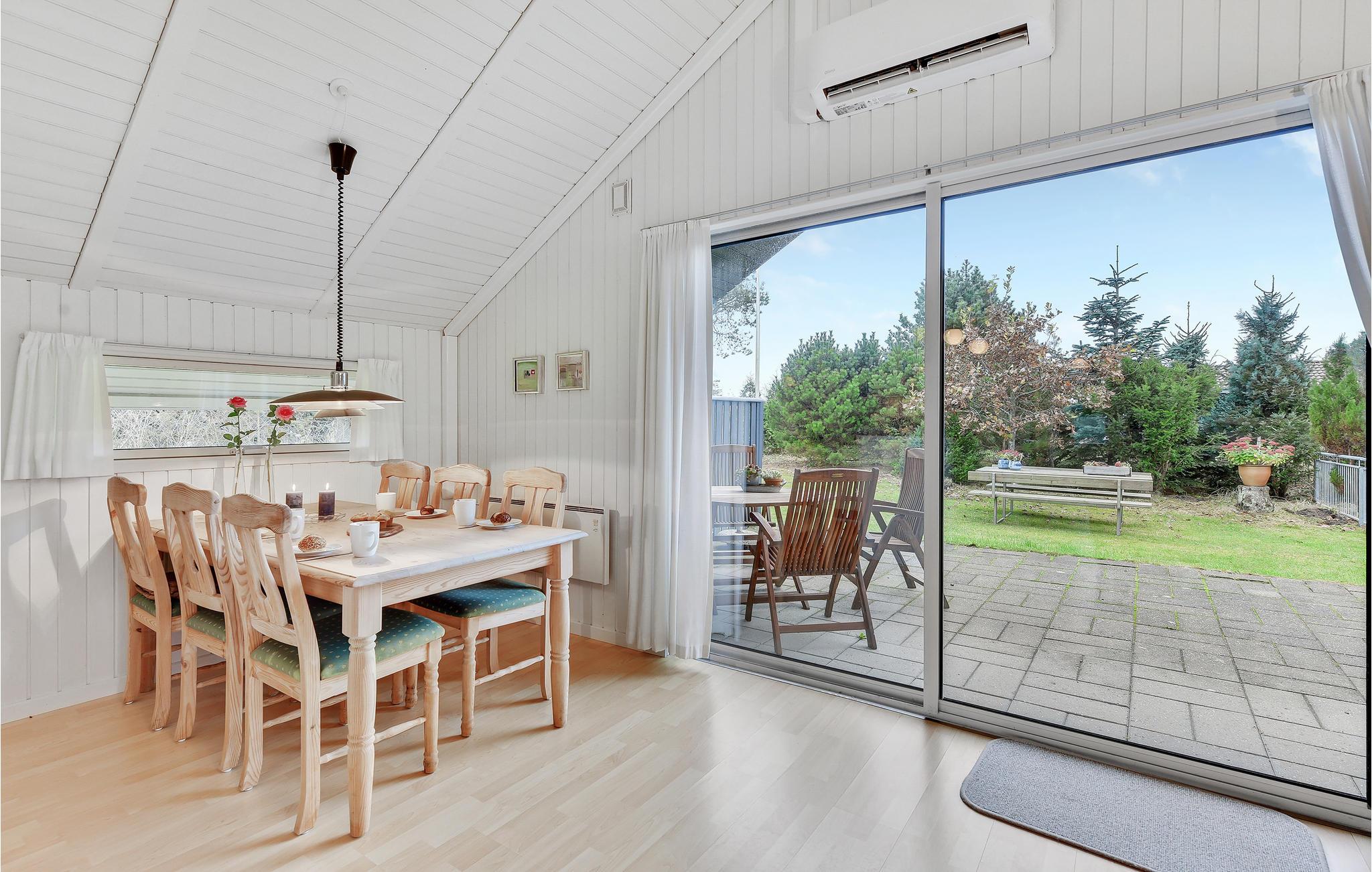Grunden er komplet indhegnet og dermed perfekt, hvis du har hund eller små børn med. Huset er godt indrettet med 3 soveværelser, 2 med dobbeltseng og 1 med en enkeltseng. Her er et lyst badeværelse med bruser og et køkken, der ligger i åben forbindelse til spiseområdet og stuen. Fra stuen er der udgang til terrassen. I køkkenet er der opvaskemaskine, og som supplerende varmekilde findes både varmepumpe og brændeovn.