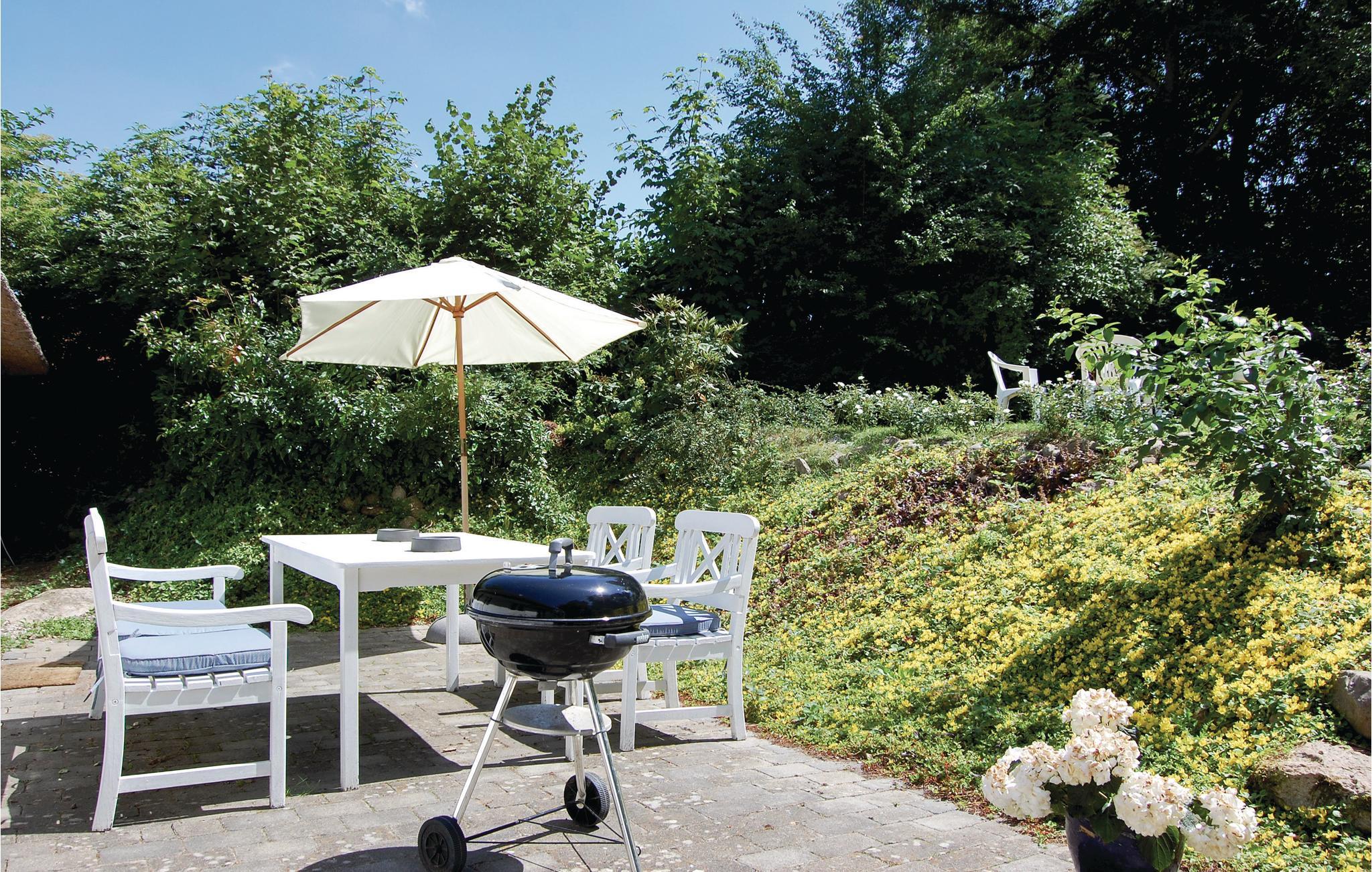 Charmerende stråtækt sommerhus i idyllisk landsby med stor have og moderne faciliteter, ideelt for naturelskere og hundeejere.