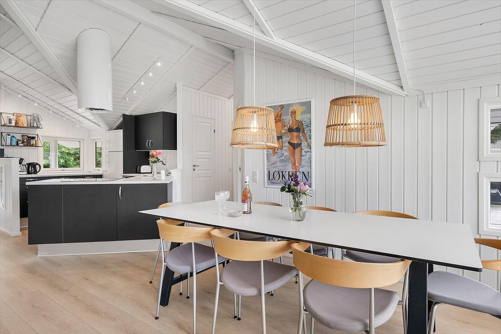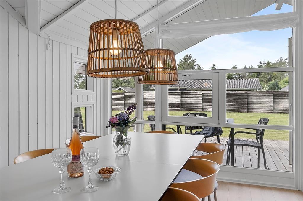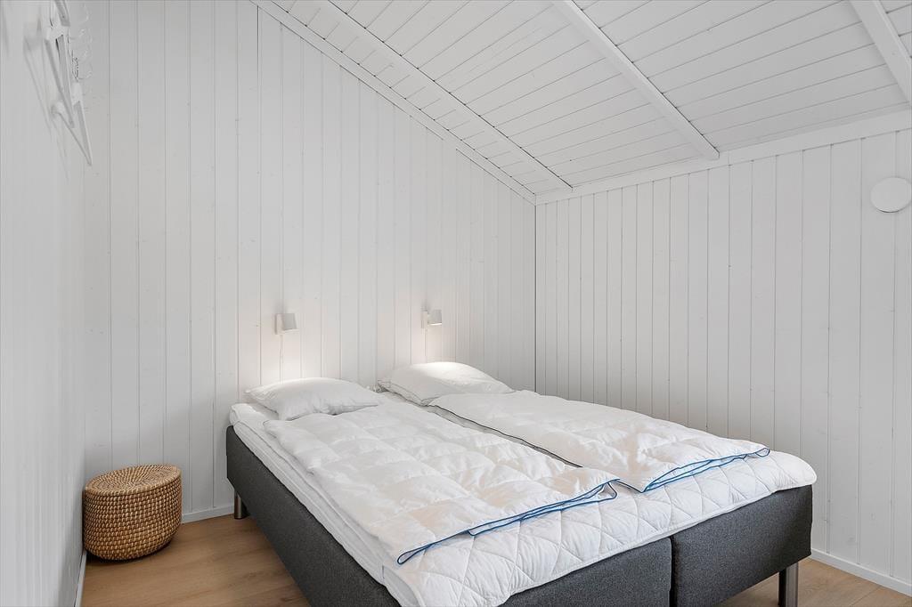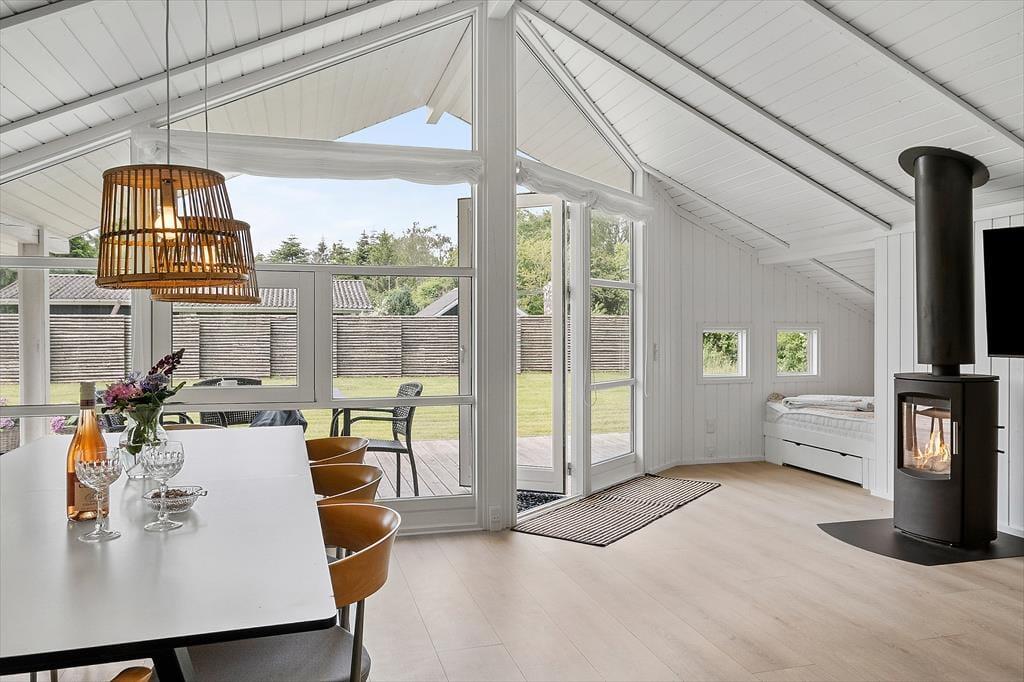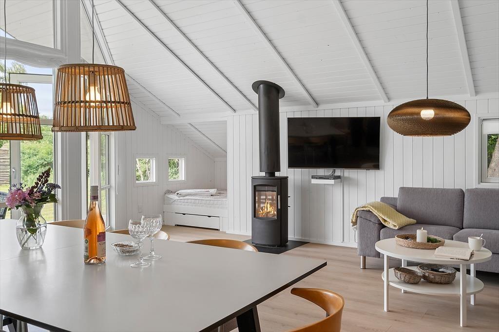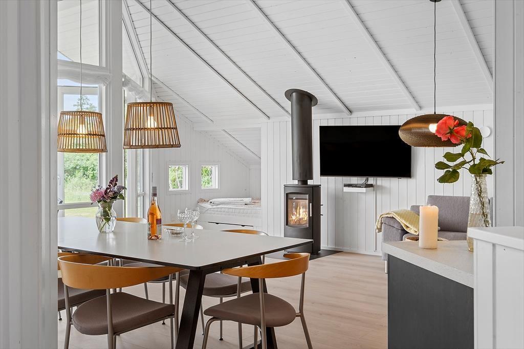 Feriehuset som er nyrenoveret i 2023 er velholdt og velindrettet. Der er loft til kip i alle rum. Feriehuset er indrettet med kombineret køkken og opholdsstue. Lækkert funktionelt køkken som indeholder kogeplader, indbygget ovn, emhætte, mikroovn, opvaskemaskine, køleskab og fryser. Opholdsstue med store vinduespartier, hvilket giver et godt lysindfald i huset. Fra opholdsstuen er der udgang til en delvis overdækket terrasse. I stuen er der god spiseplads, hjørnesofa, brændeovn, TV med danske DR kanaler, parabol med tyske kanaler, og Chromecast med mulighed for streaming (kræver eget login). To badeværelser med brusenicher, klinkegulv, og gulvvarme. I det ene badeværelse er der desuden SPA-bad og vaskemaskine. Fire soveværelser, alle med dobbeltsenge (2 enkeltsenge som er sat sammen). Herudover er der en alkove i opholdsstuen med mulighed for to sovepladser. Der er desuden både barneseng og barnestol til rådighed. Opvarmning af huset foregår via varmepumpe, brændeovn og elvarme.