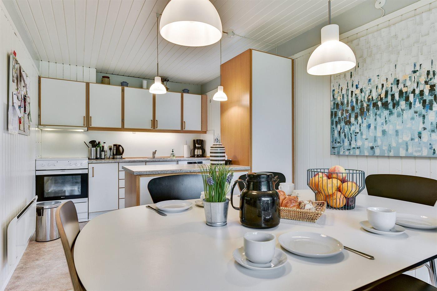 Køkkenet er udstyret med 1 køleskab. Der er 4 keramiske kogeplader, varmluftovn, mikrobølgeovn samt opvaskemaskine.