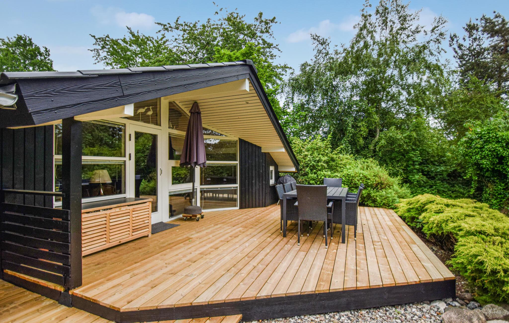 Hyggeligt træhus med sauna, spabad og stor terrasse nær havet på Langeland.
