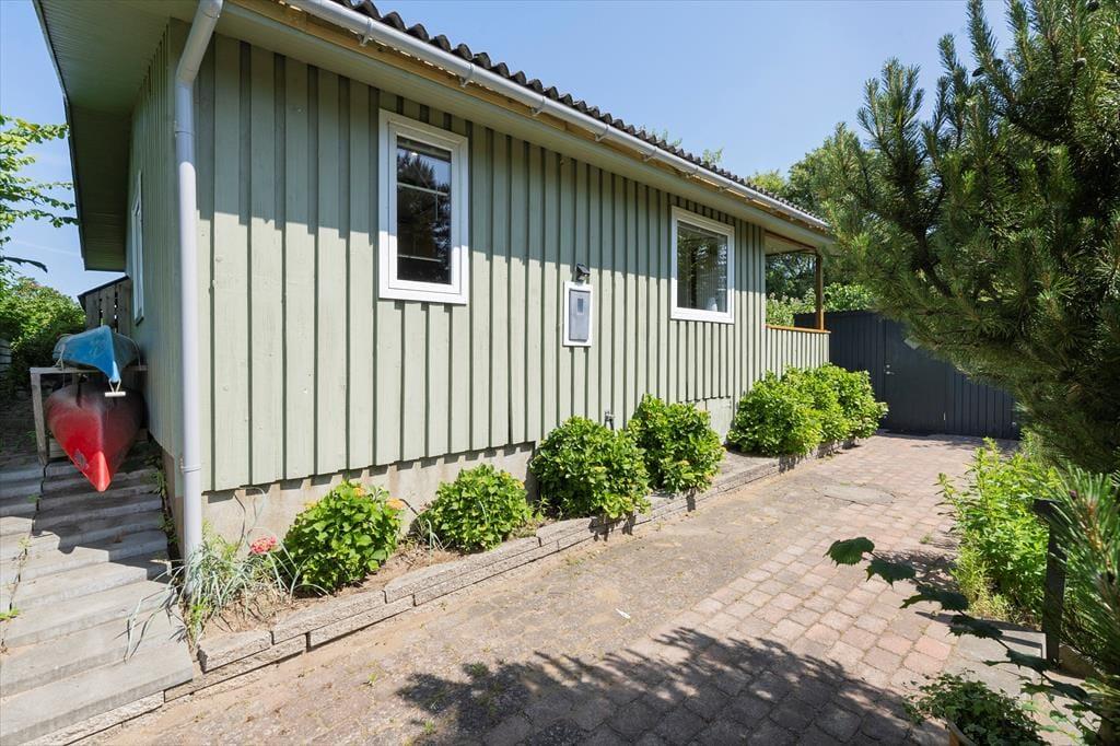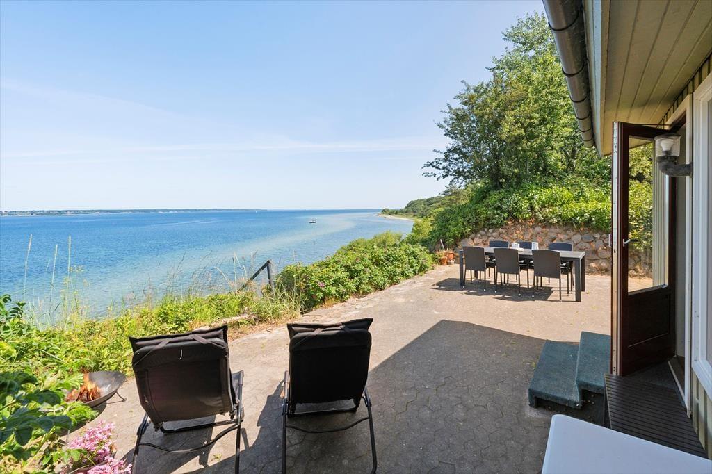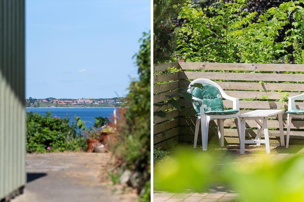Sommerhuset har to skønne terrasser – en foran og en bagved huset. Især den bagerste terrasse er et helt kapitel for sig selv med sin panoramaudsigt over havet. Her kan du sidde og lade dig fascinere af solnedgangen, mens du lytter til bølgernes sagte brusen. Trappen fører dig direkte fra terrassen ned til stranden via en lille sti – en oplevelse i sig selv, men vær opmærksom på, at den kan være udfordrende for gangbesværede. Foran huset er der en lille græsplæne, hvor du kan nyde morgenkaffen i ro og mag, og på de lune aftener kan du tænde grillen og tilberede en lækker middag i det fri.