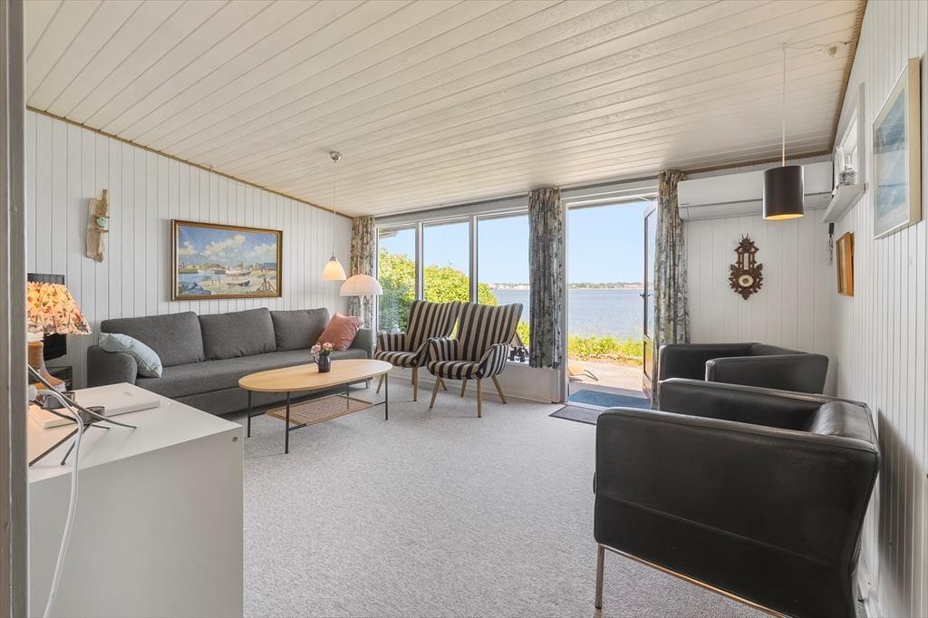 Sommerhuset byder dig velkommen med en varm og indbydende atmosfære. Det autentiske interiør er hyggeligt indrettet, og køkkenet med spiseplads ligger i åben forbindelse med stuen. Her kan du tilberede måltider, mens du stadig er en del af fællesskabet. Stuen har en varmepumpe, der sikrer en behagelig temperatur året rundt, og den store vinduesfront inviterer dagslyset indenfor og giver en betagende udsigt over havet. Her kan du sidde med en god bog, eller blot lade blikket vandre over bølgerne i Lillebælt.