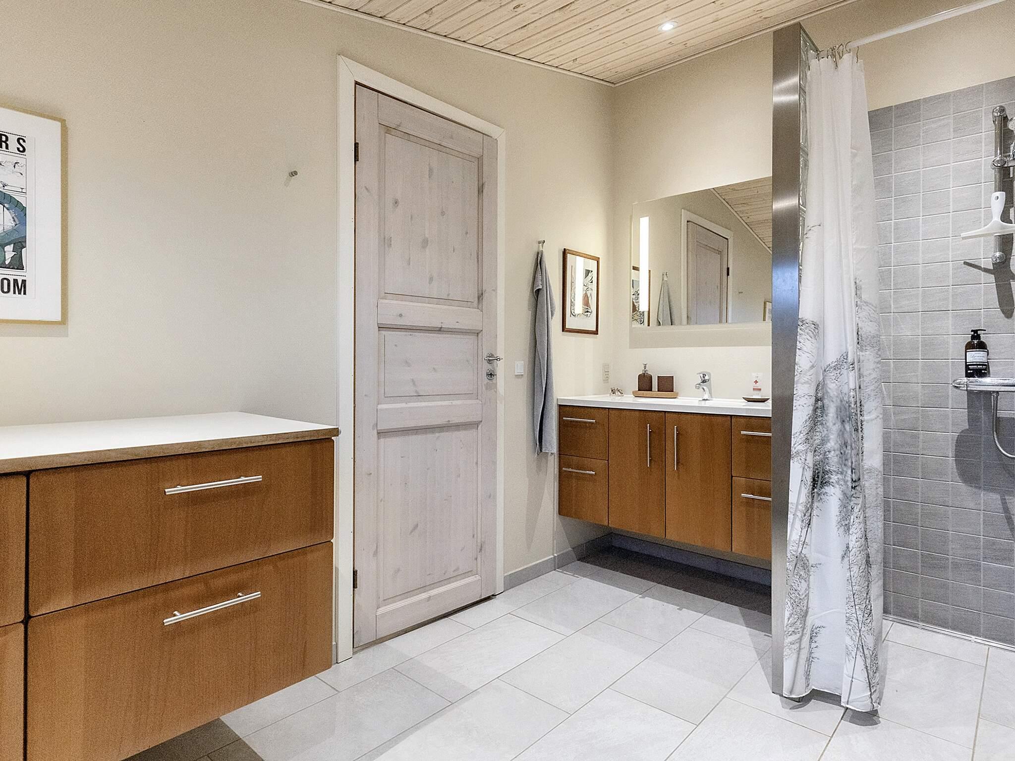 Køkken: Brændeovn, køleskab, fryser 60 - 99 l, mikroovn, induktionskomfur, kaffemaskine, opvaskemask.