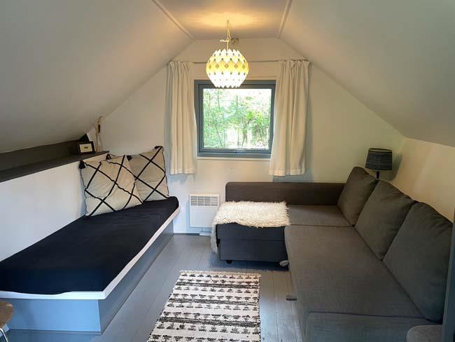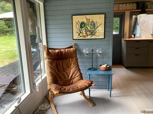 Den fantastisk dejlige stue har mange mange hyggelige siddepladser i forskellige varianter, - således er der rig mulighed for at læse, spille spil eller ”bare” sidde/ligge og nyde de dejlige omgivelser og skønne lysindfald.