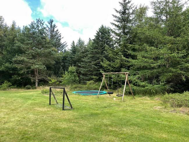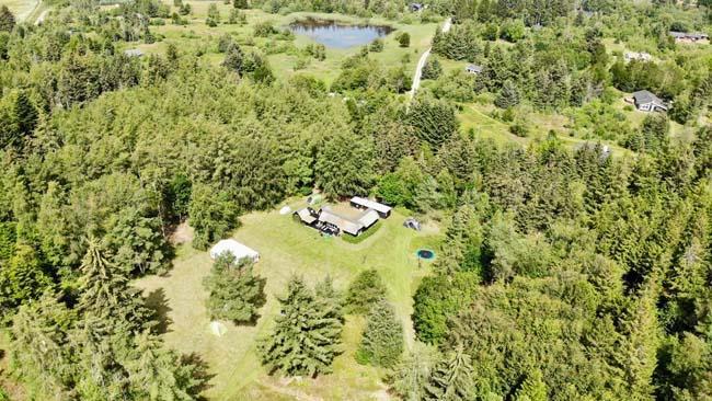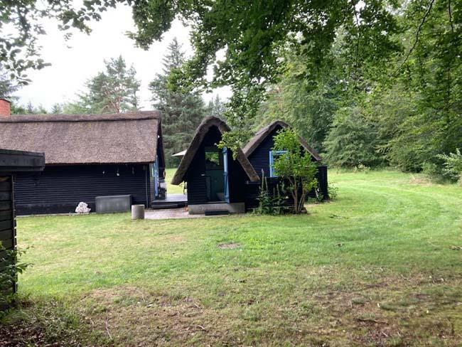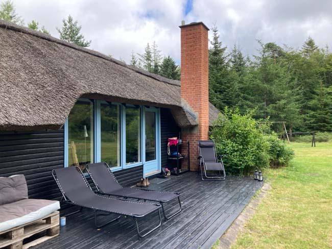 Ude midt i skoven, på en stor lysning ligger dette eventyrligt spændende stråtækte sommerhus. Huset ligger på 65.000 m naturgrund, hvoraf et stort område foran huset er græs, hvor der en stille aften græsser rådyr. Der er ”ud i grunden” mange slåede stier, så man kan blive ledt rundt mellem lyng, enebær, bjergfyr og høje træer, - måske møde nogle af skovens dyr. Nær huset er det bygget et TRÆTOPHUS hvor der også er 2 sovepladser samt et shelter med plads til 3-4 personer, - således er der rig mulighed for hele familien kan overnatte ude, - - - eller hygge omkring bålplads, trampolin, gynge osv.