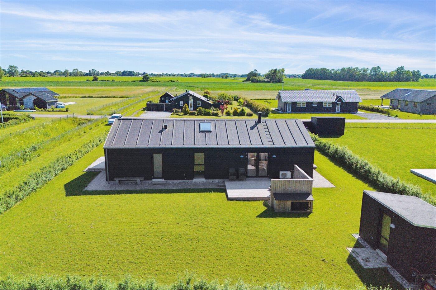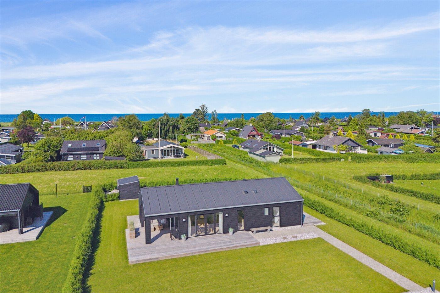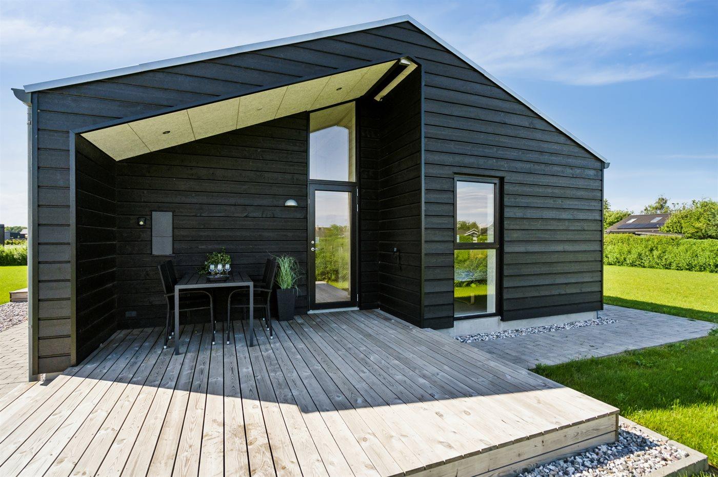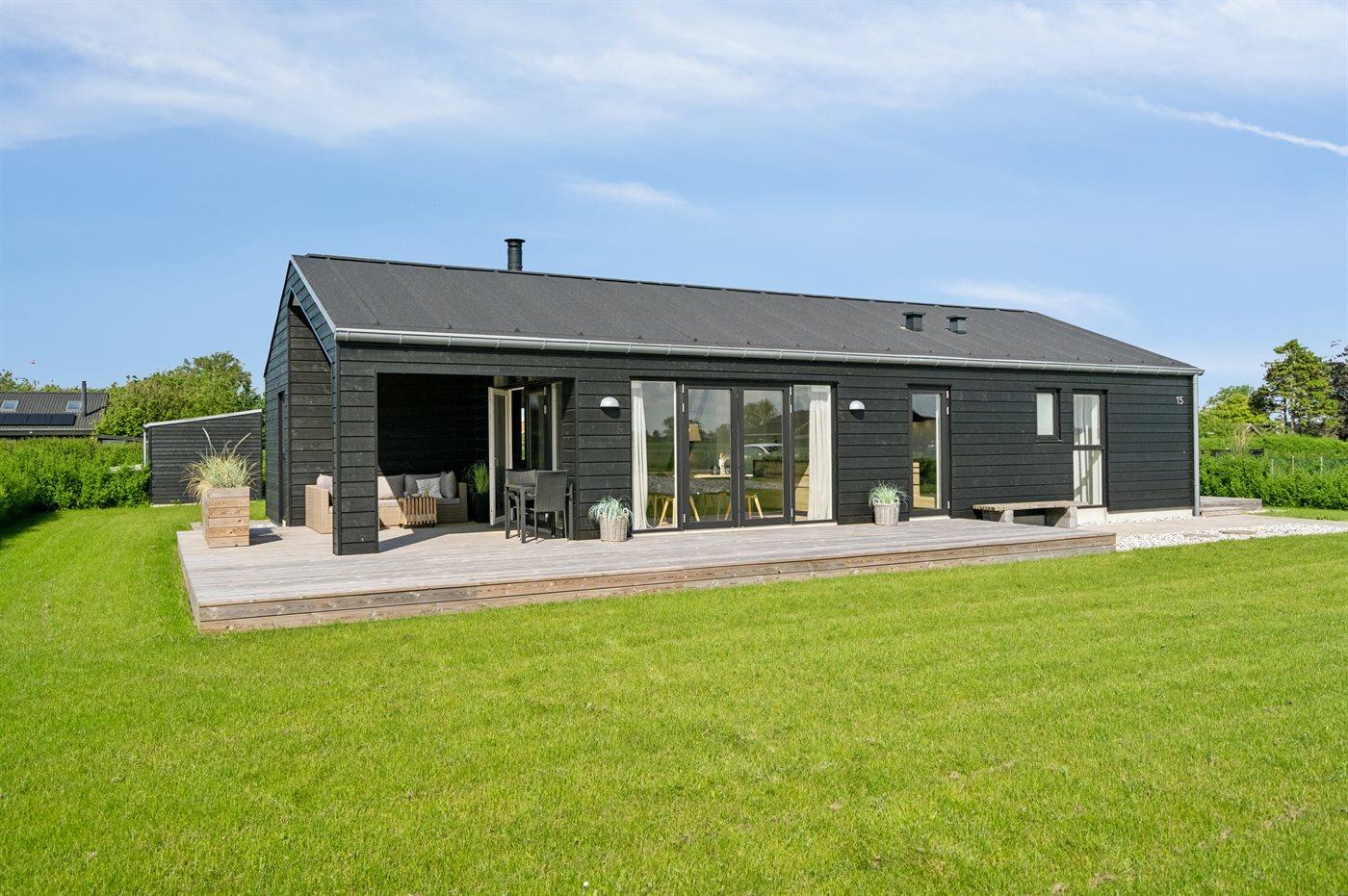 Moderne sommerhus fra 2022 med flere terrasser, tæt på strand og badebro, perfekt til familieferien ved Otterup.