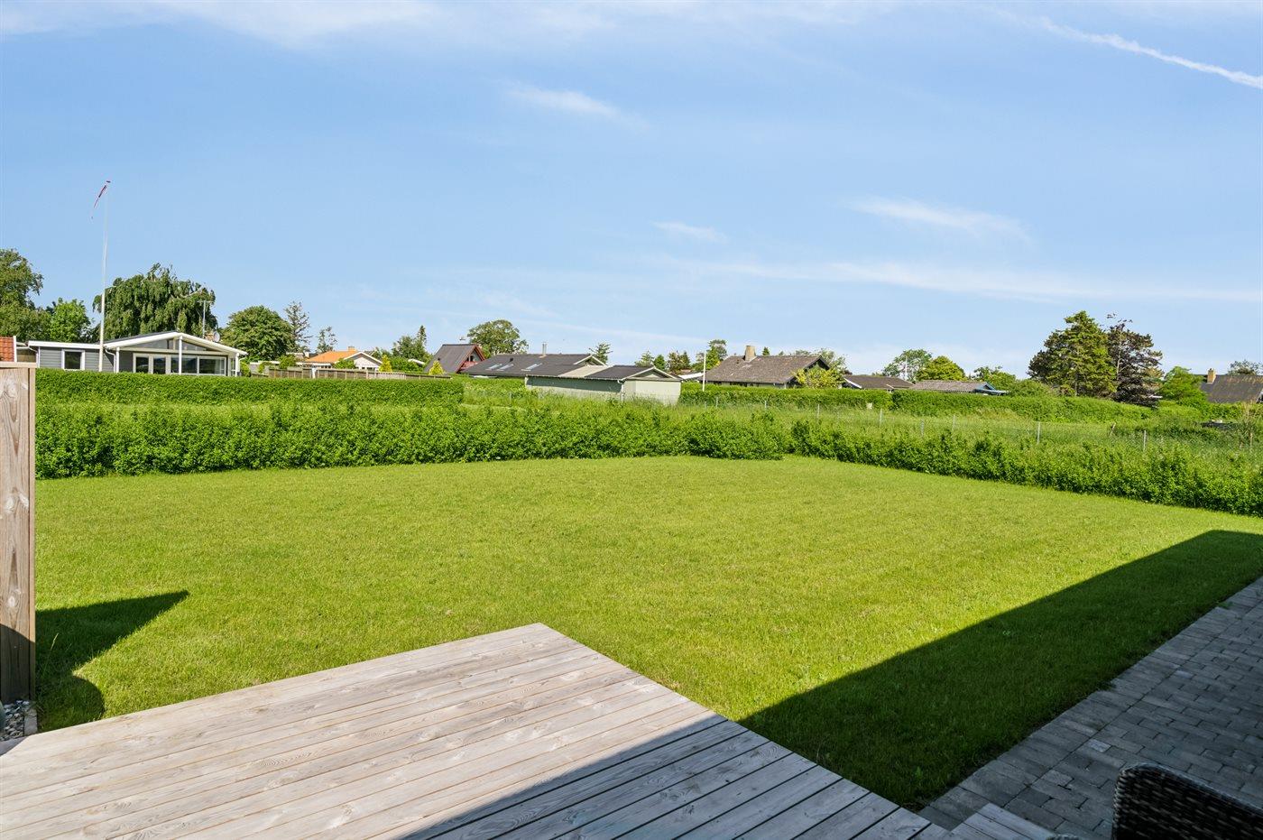 Fra stuen er der udgang til den delvist overdækkede, sydvestvendte terrasse, hvor der er lagt op til mange hyggelige timer. Ved den nærliggende strand er der opsat badebro i sommerperioden.