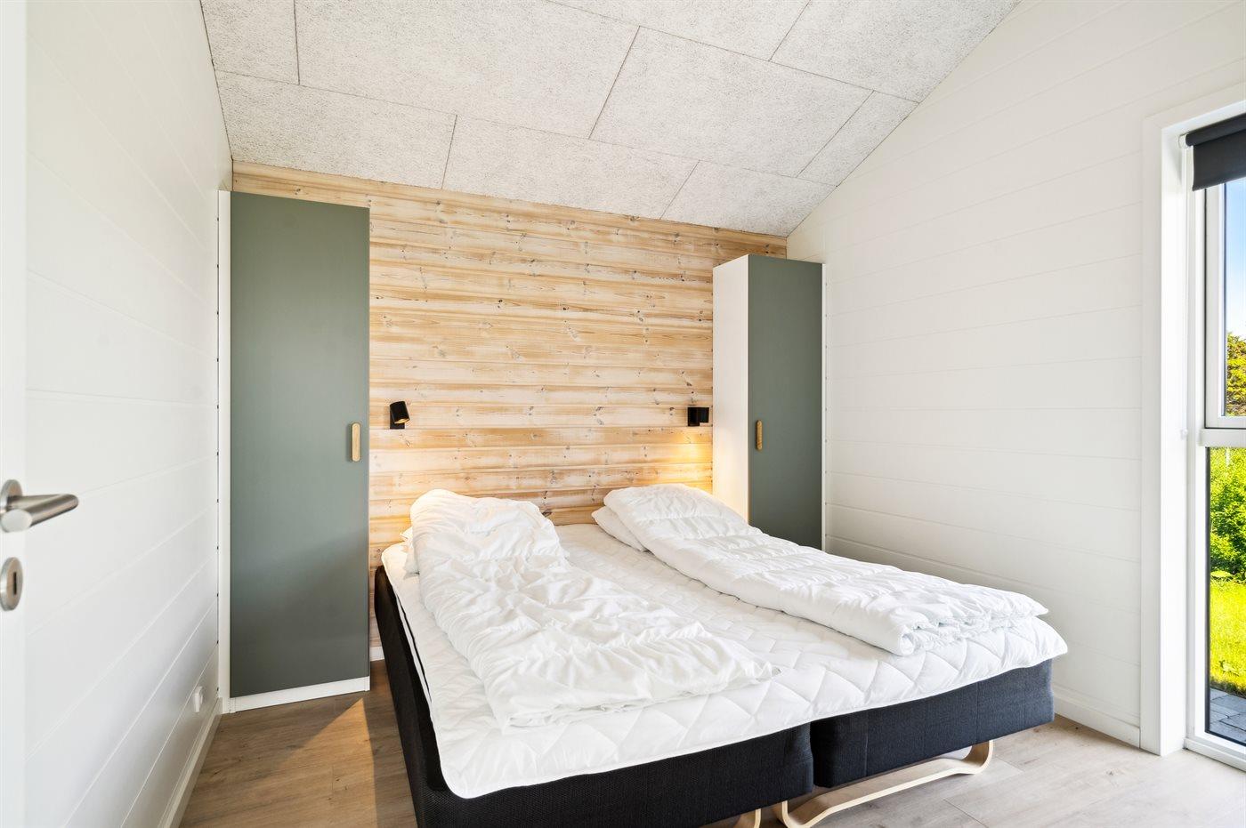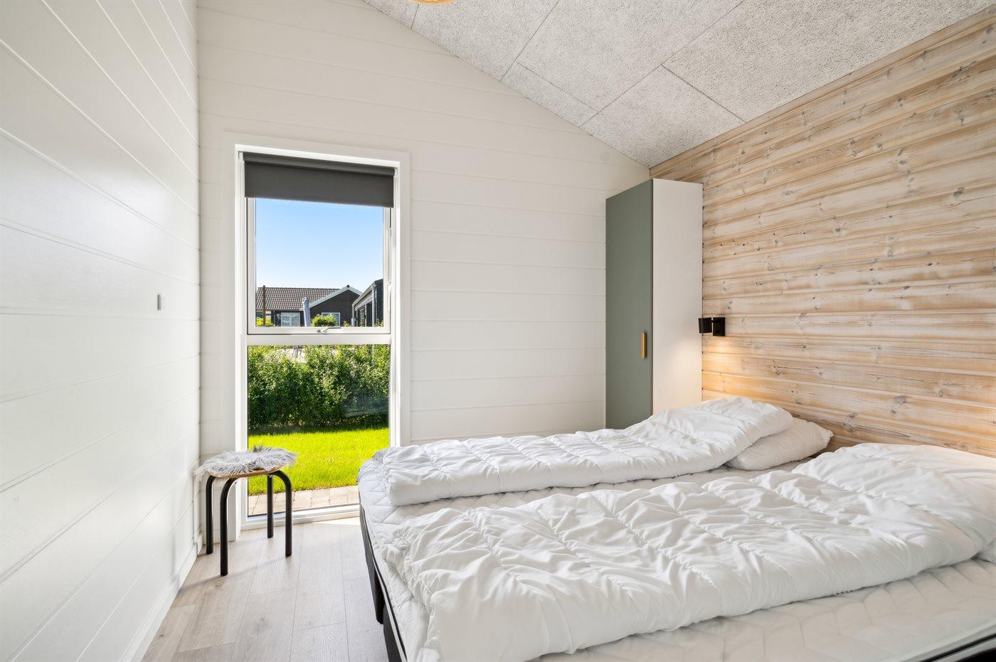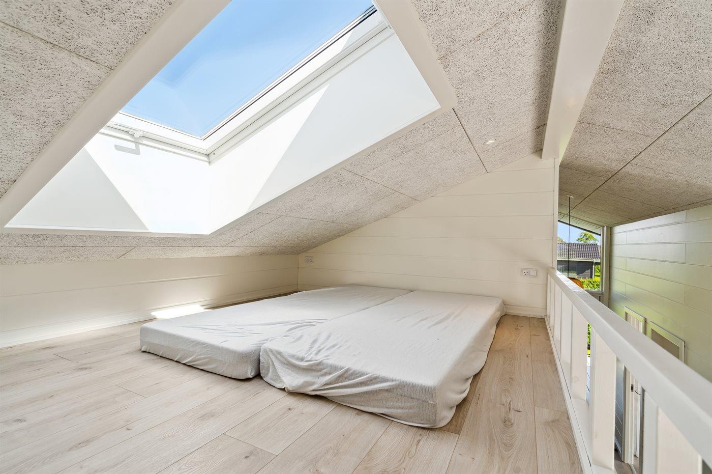 Der er i alt 3 soveværelser. Sovepladserne fordeler sig på: 4 sovepladser i dobbeltsenge. 2 sovepladser i enkeltsenge. 2 sovepladser på madrasser. 2 af disse sovepladser befinder sig på husets hems. Derudover er der 1 stk. barneseng.