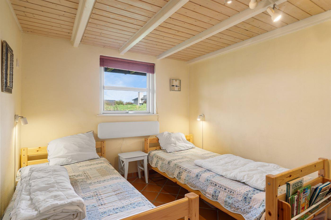 Der er i alt 2 soveværelser. Sovepladserne fordeler sig på: 2 sovepladser i dobbeltseng. 2 sovepladser i enkeltsenge. Derudover er der 1 stk. barneseng.