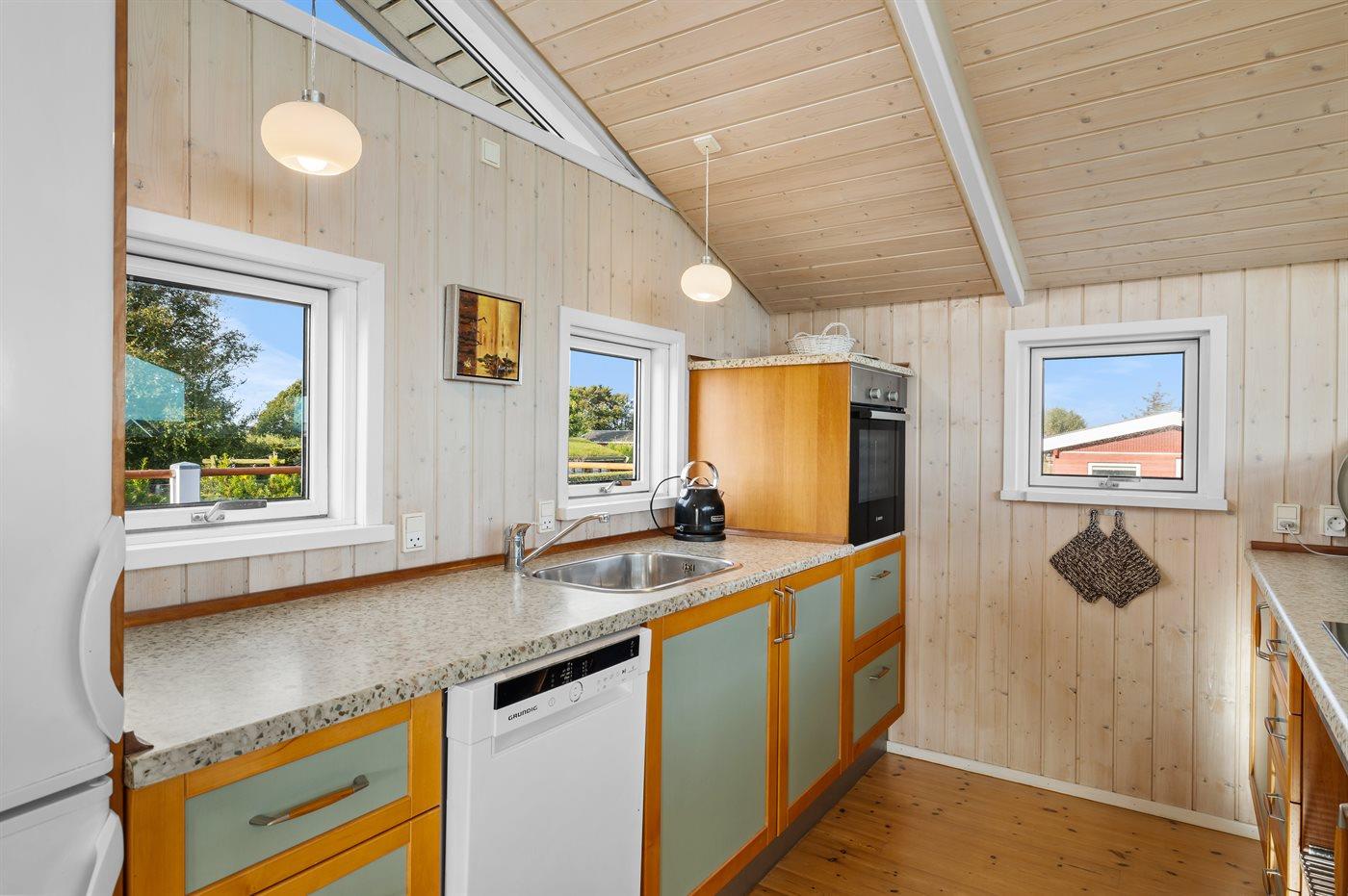 Køkkenet er udstyret med 1 køleskab. Der er 4 keramiske kogeplader, varmluftovn, mikrobølgeovn samt opvaskemaskine.