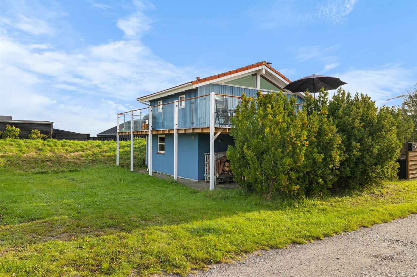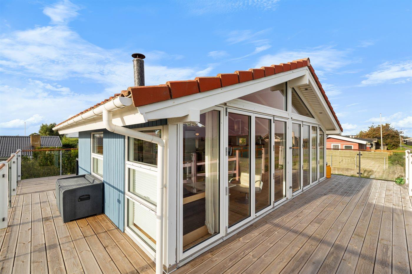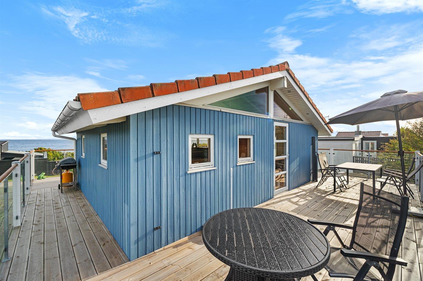 Fra både husets øverste etage og den dejlige terrasse foran huset, er der udsigt ud over vandet. Terrassen går hele vejen rundt om huset, så der altid mulighed for læ på selv blæsende dage.