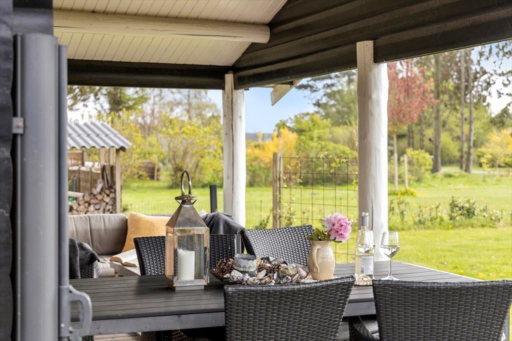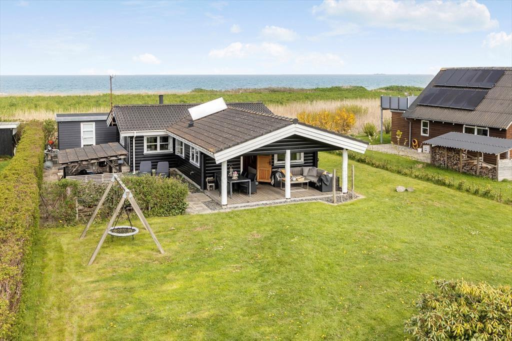 Feriehuset er beliggende i 1. række til vandet og kun 50 meter fra en børnevenlig badestrand, i det lille sommerhusområde Tofteløkken ved Tørresø. Her er desuden en badebro til fælles brug med områdets andre gæster. Til huset er en stor velplejet have med gyngestativ samt en dejlig terrasse med havemøbler, grill og liggestole.