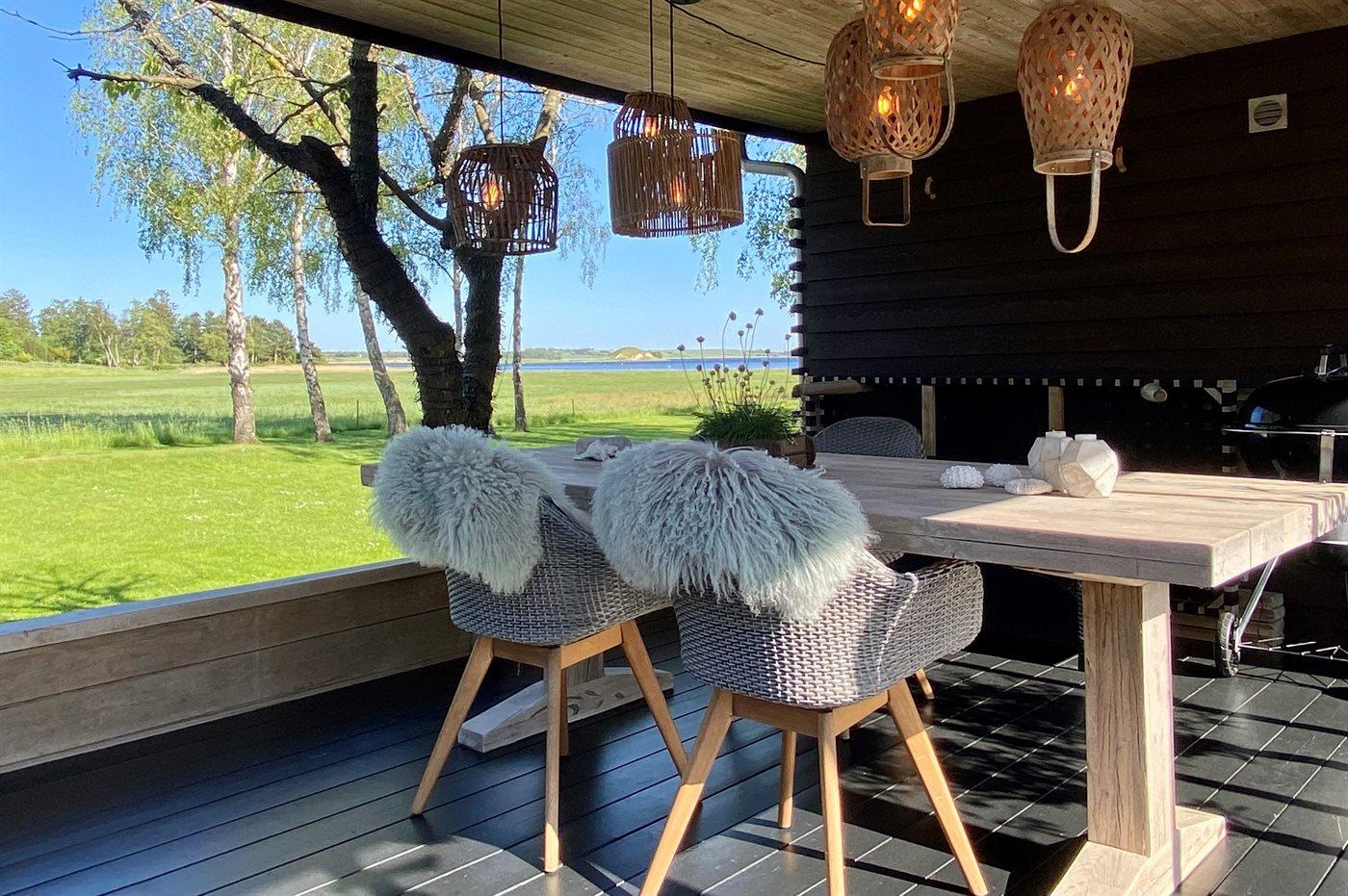 Fra terrassen er der åben udsigt til fjorden, og her finder du også et lækkert vildmarksbad – perfekt til afslappende stunder under åben himmel året rundt.