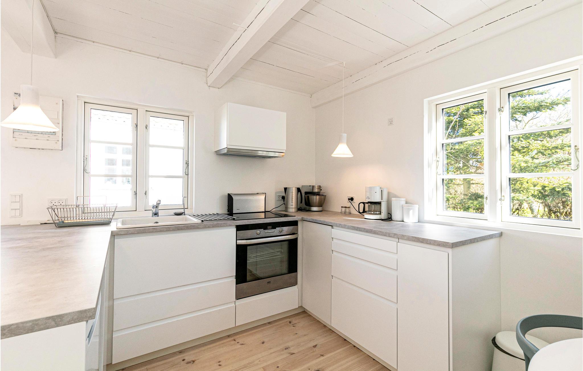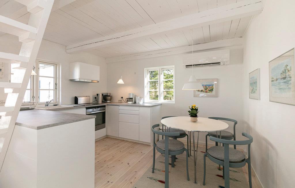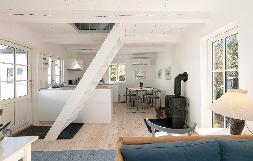 Indvendigt i dette nydelige feriehus fører en robust trappe op til soveområdet, som en slags repos og med 2 små sengeafdelinger. Utroligt charmerende, men med lidt lav loftshøjde på grund af de skrå lofter. Her er varmepumpe og gratis internet. Fra huset er der ikke langt til den smukke kyst, cykelstier og indkøbsmuligheder, og er I til en tur på stranden, så ligger den hyggelige strand kaldet "Lille Sandkås" ikke så langt fra huset. Husets høje komfort og beliggenhed gør det velegnet til ferieophold året rundt.