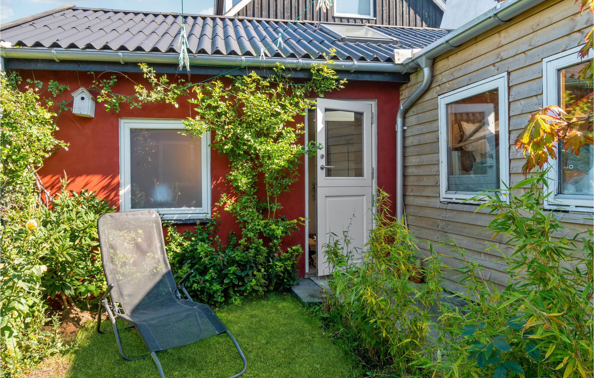 Charmerende ferielejlighed i åbent plan med terrasse og den skønneste fælleshave.
