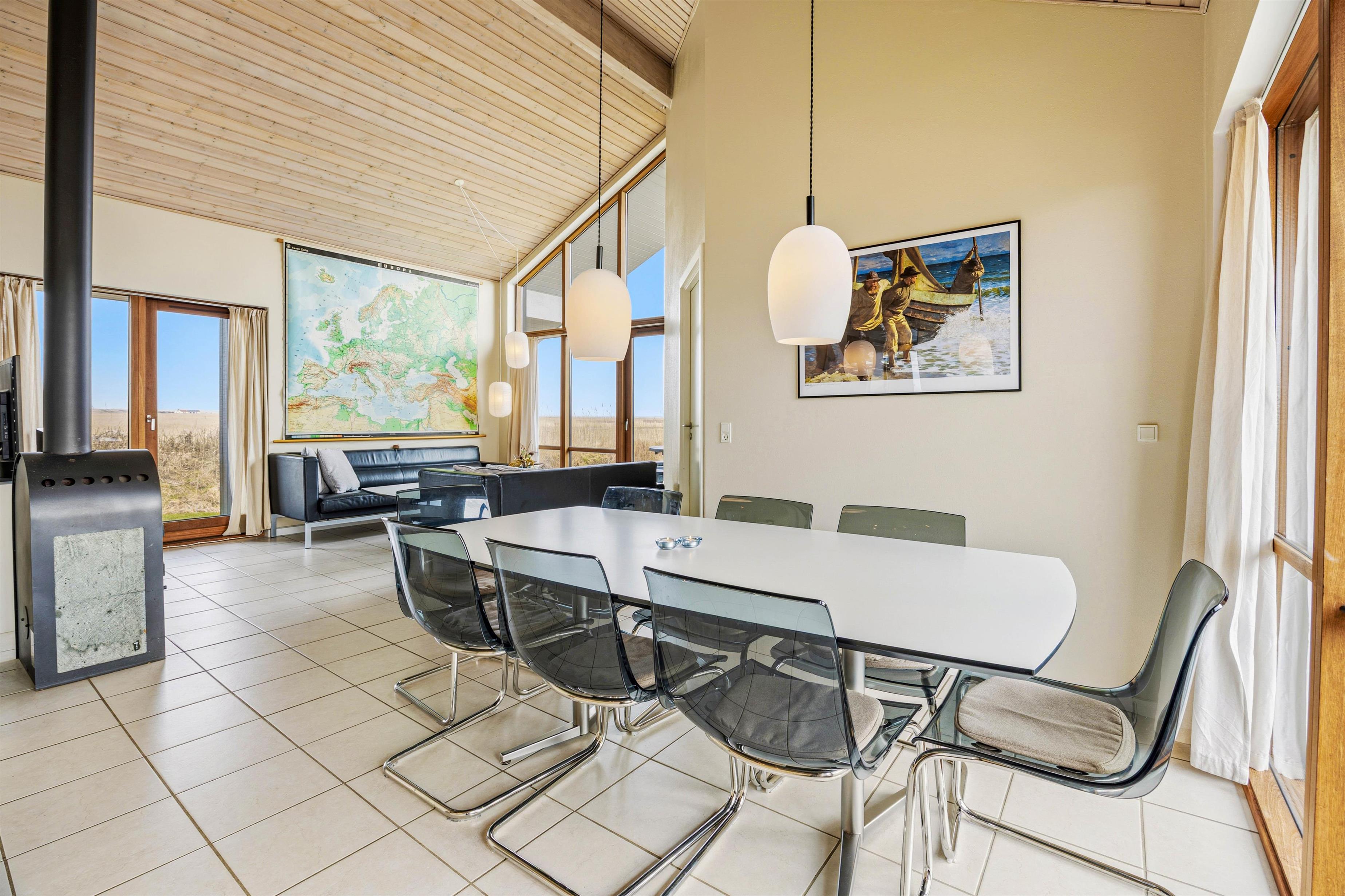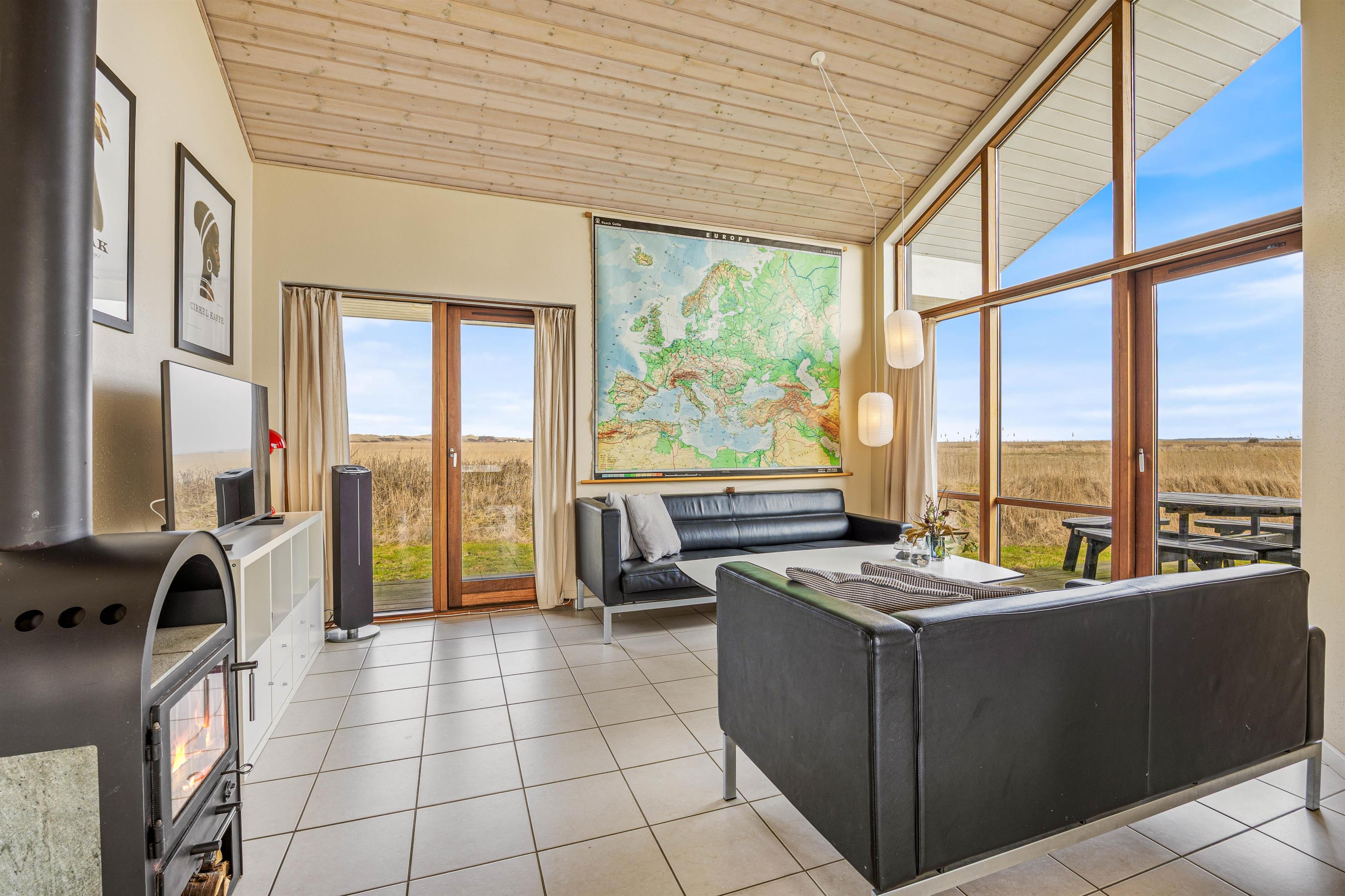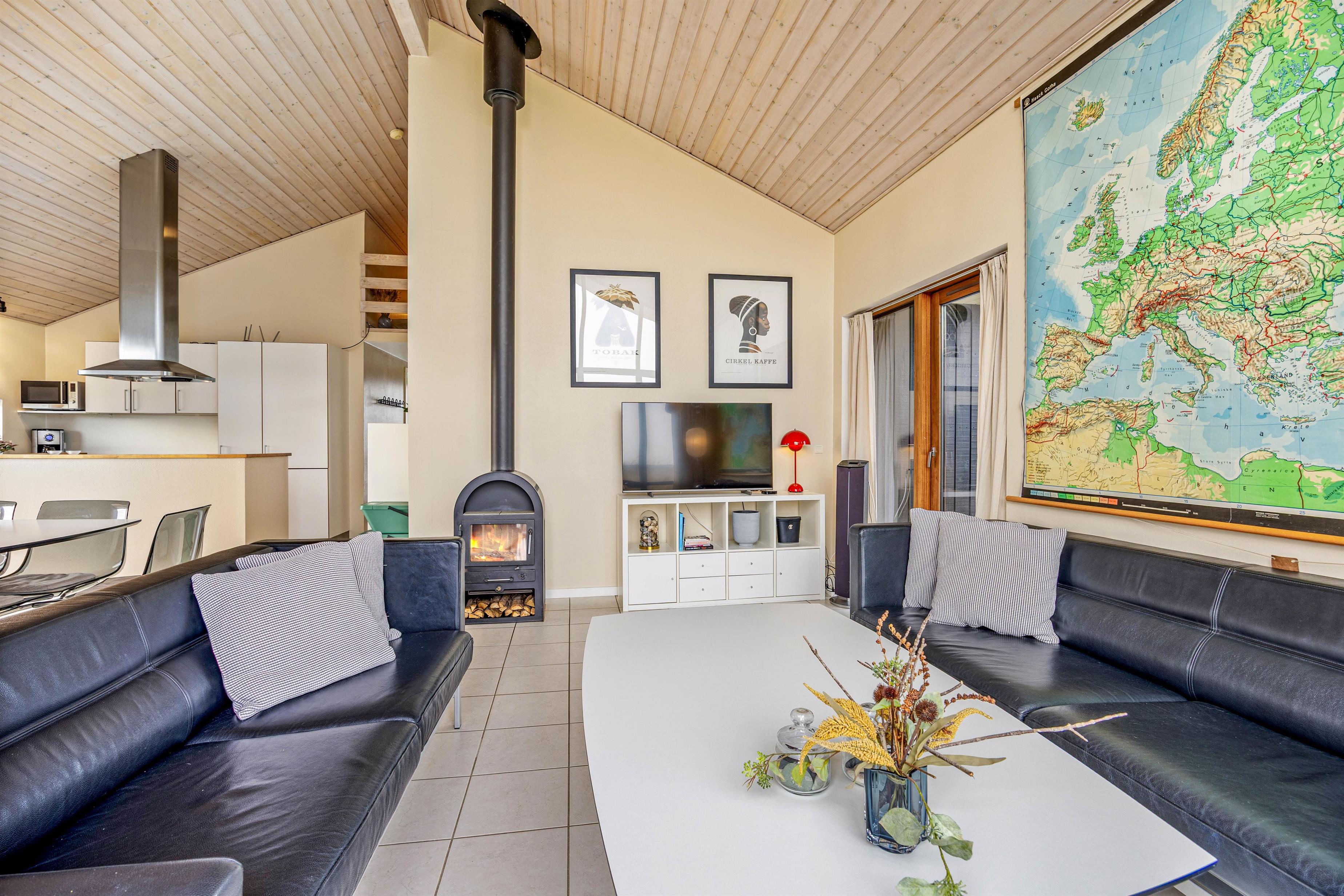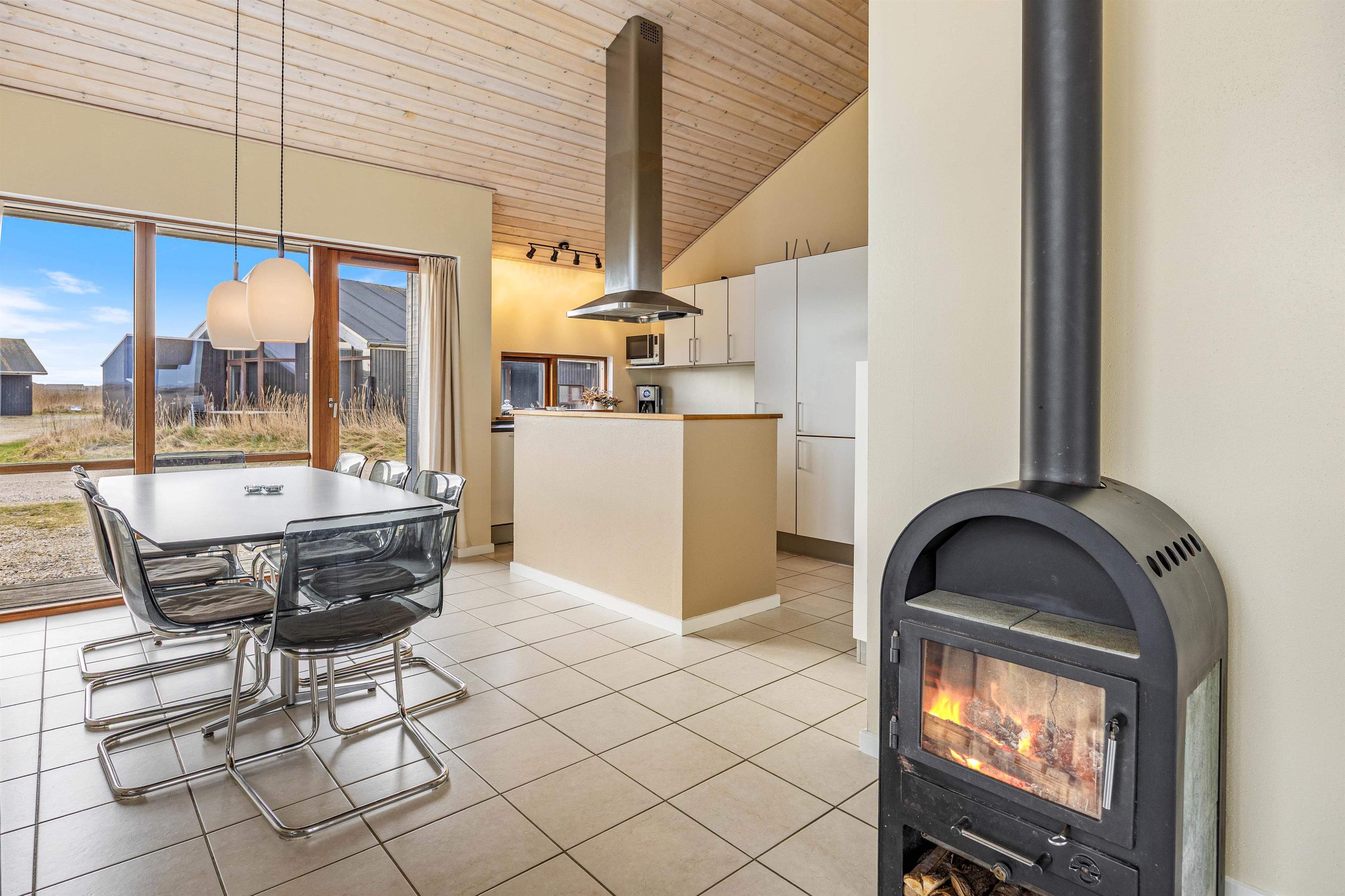 Når I træder ind i feriehuset, bliver I mødt af et åbent opholdsrum med gulvvarme, som sikrer en behagelig temperatur året rundt. Her er der god plads til at slappe af i sofaen, se en film eller nyde rolige aftener sammen efter en dag ved havet. Til underholdning er der Apple TV, så I kan se film eller serier, hvis I ønsker en rolig aften. Den hyggelige brændeovn skaber en varm og afslappet stemning, især på køligere dage, hvor det er rart at samles indenfor.