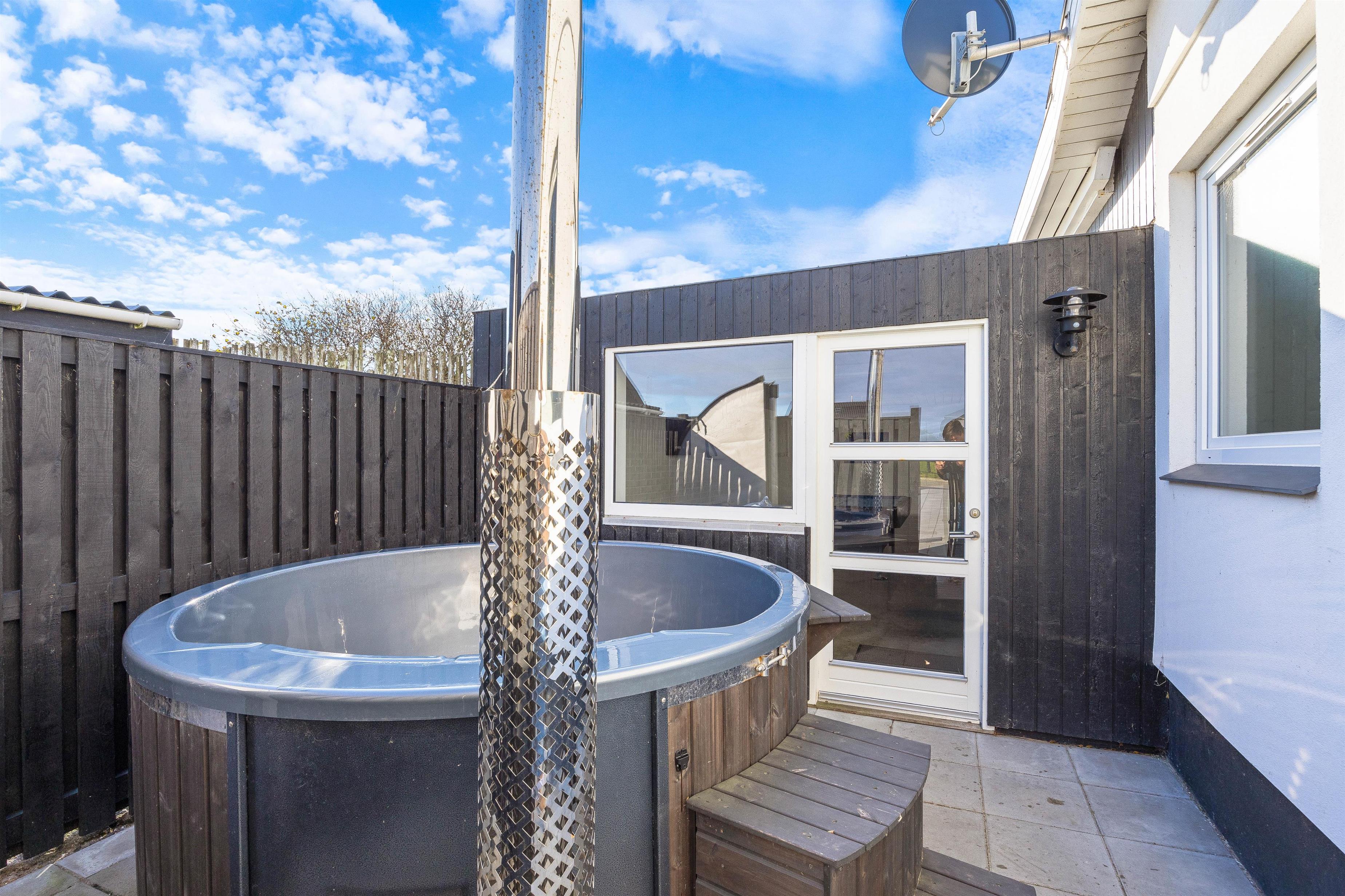 På de lidt varmere dage, er det oplagt at sætte sig ud på en af feriehusets 2 terrasser, og nyde solens varme stråler. Det er også udenfor, I finder vildmarksbadet, hvor I rigtig kan blive varmet godt igennem og bare nyde, at I har ferie og kan slappe helt af.