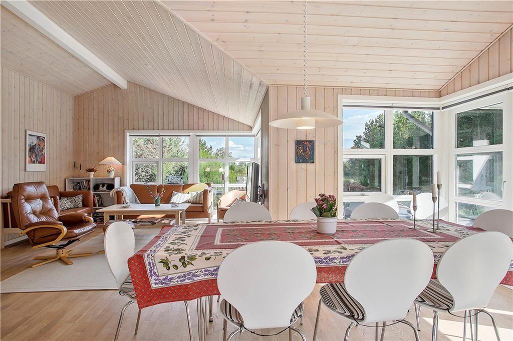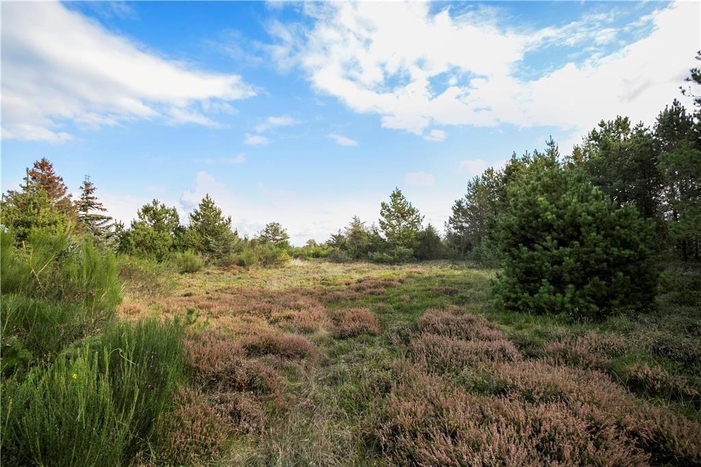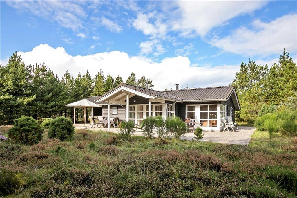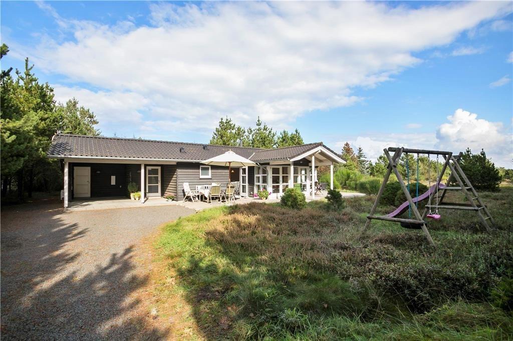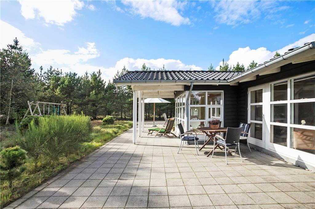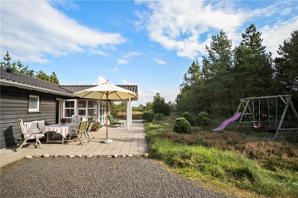 En stor, solbeskinnet og delvist overdækket terrasse er godt integreret, for der er nemlig intet mindre end fem terrassedøre i sommerhuset. Det er med andre ord særdeles nemt at smutte udenfor, når det gode sommervejr lægger op til grillmiddage, solbadning og leg i sandkassen og gyngestativet. Den 2.426 m2 store naturgrund smelter nærmest sammen med de flotte omgivelser, og her i det lyng- og fyrretræsklædte landskab vil udelivet foregå på fredelig og ugeneret vis.