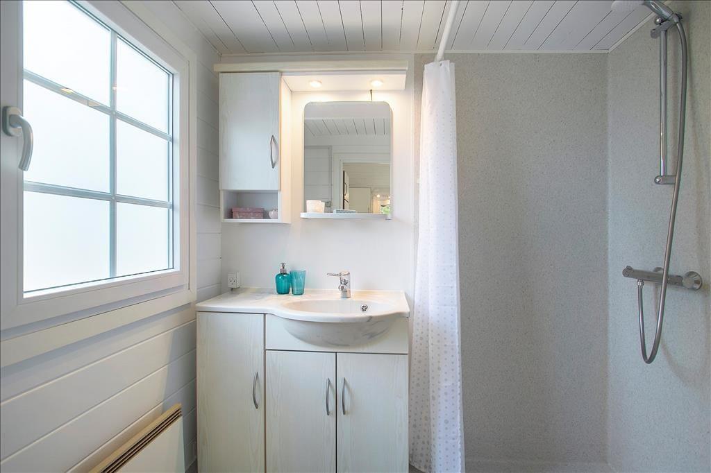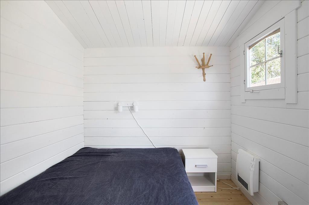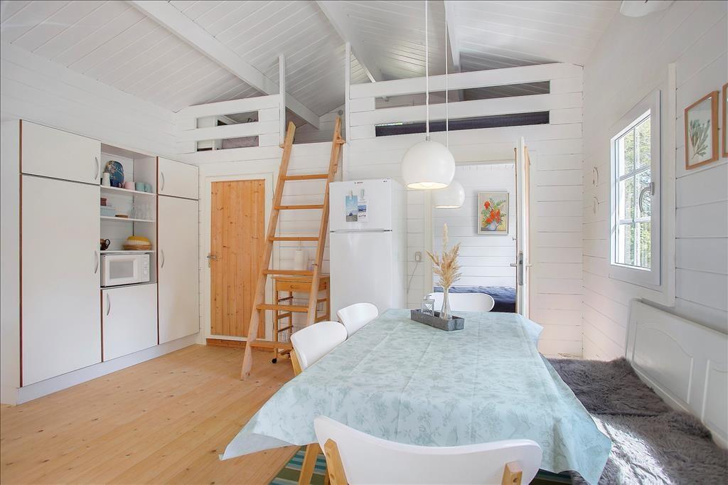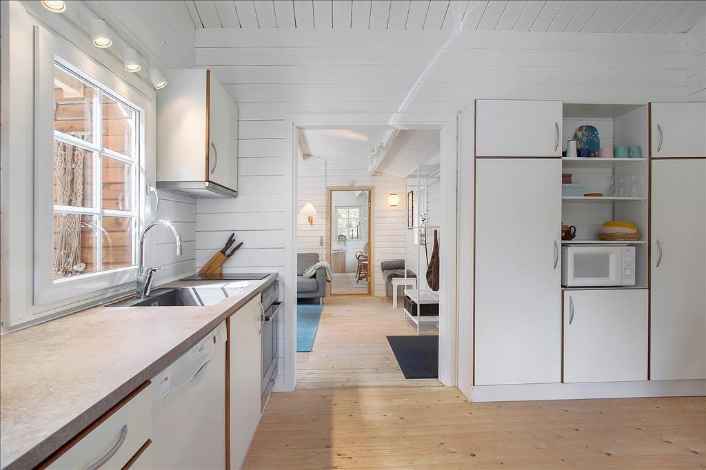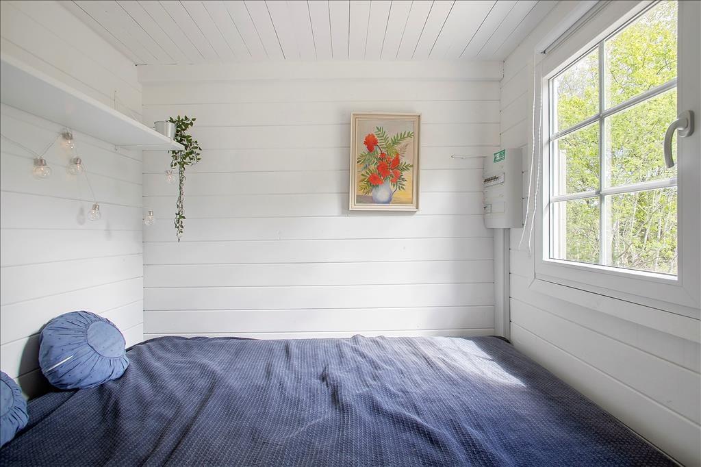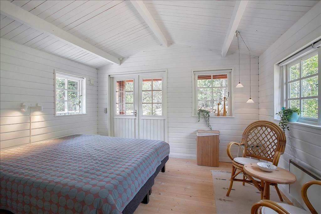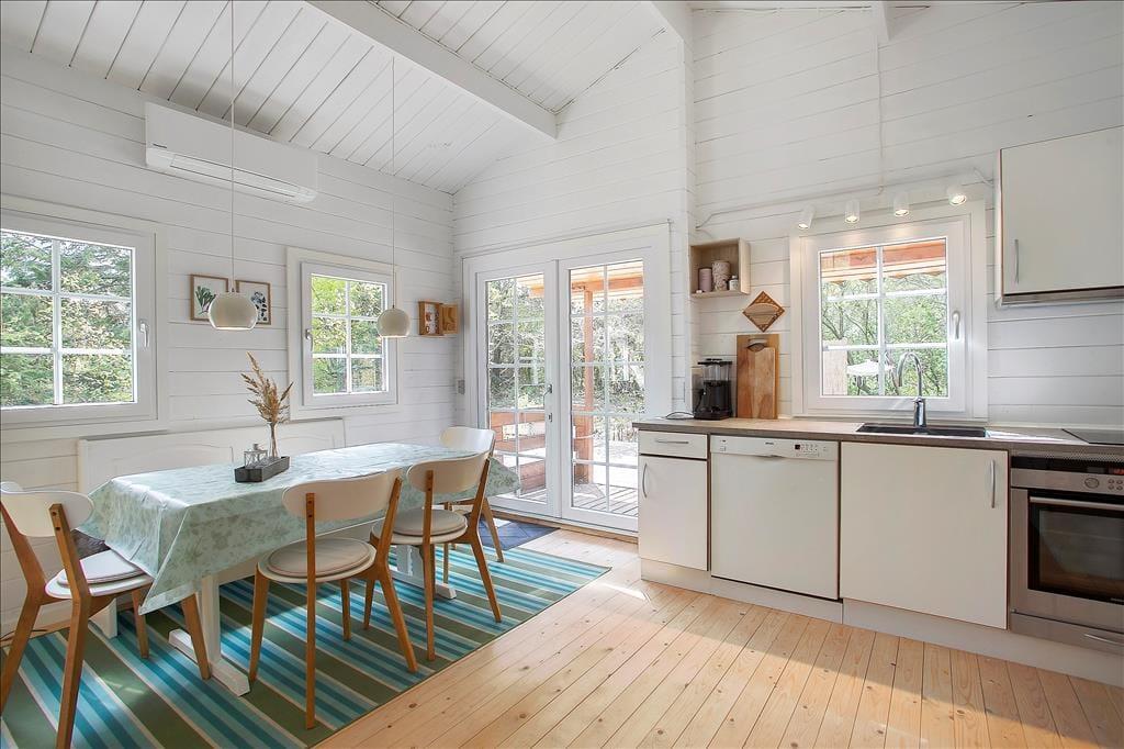 Der er en lys og indbydende stemning i huset, som har loft til kip og hvidmalede vægge og lofter. Lyset strømmer ind fra de mange vinduespartier, hvor sprossevinduerne tilfører ekstra charme. Husets naturlige hjerte er det hyggelige køkken-alrum med åbent køkken, slagbænk og spisebord. I forlængelse af alrummet er der en stue med fint lysindfald fra begge sider. Soverum er der to af; det ene er stort og rummeligt med god skabsplads og udgang til overdækket terrasse. Det andet indeholder kun en seng, som fylder hele rummet. De sidste sovepladser findes i annekset hvor familiens teenager kan finde ro og fred. Endelig er der et badeværelse med brus.