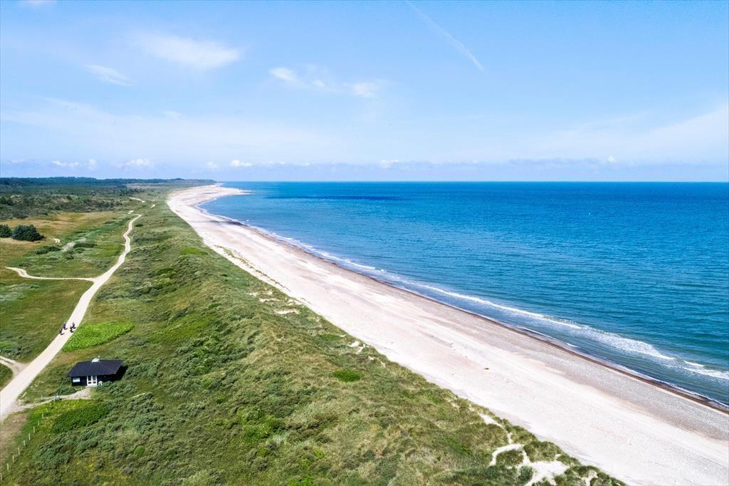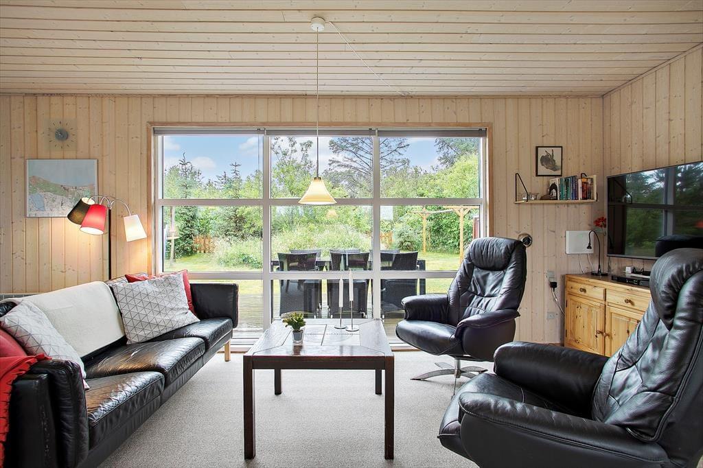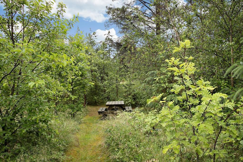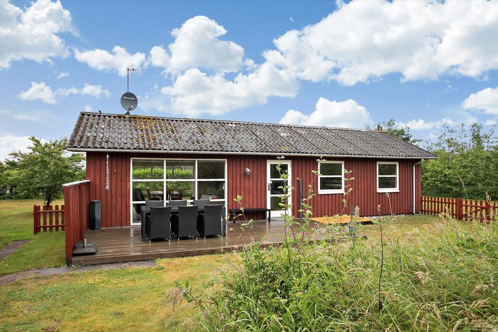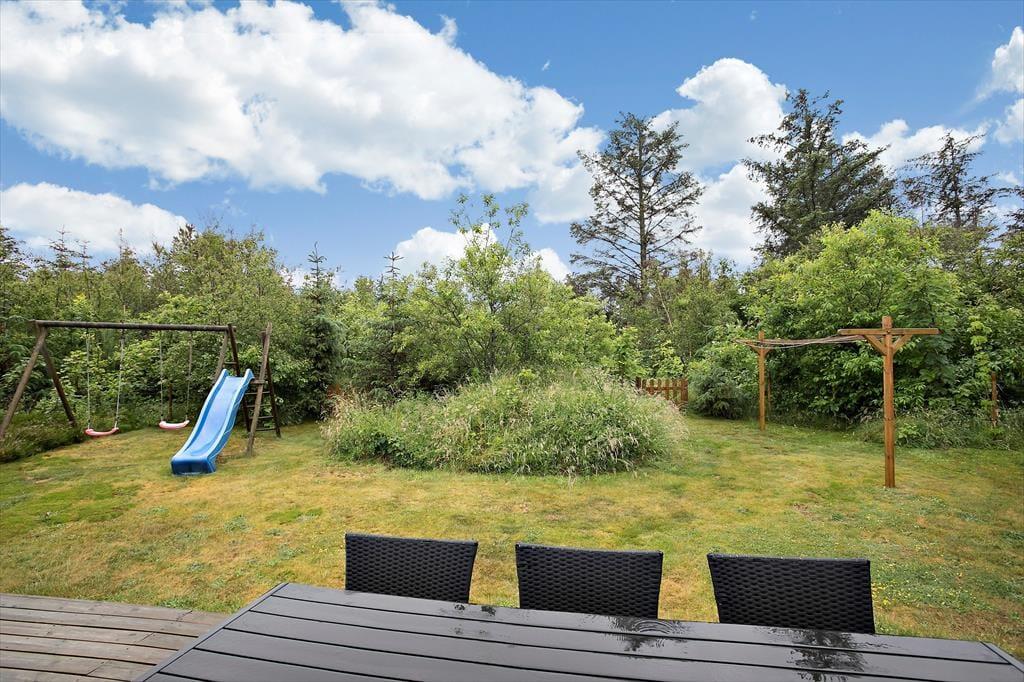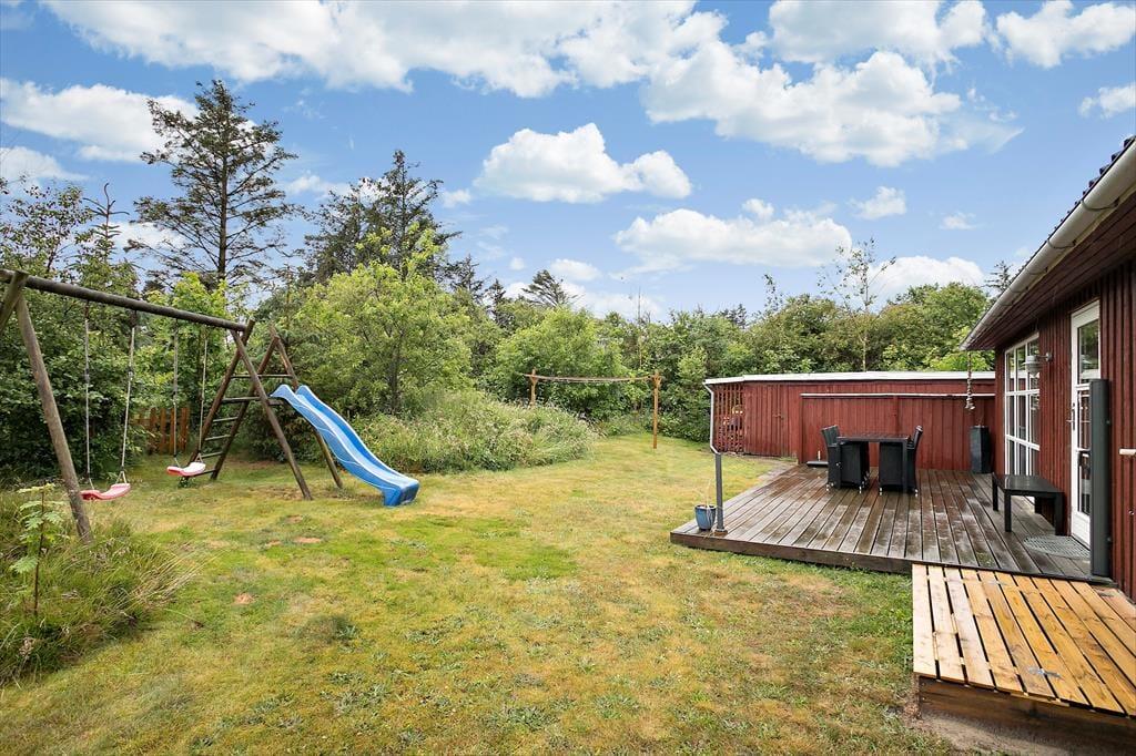 På begge sider af sommerhuset ligger fine terrasser, hvor man kan nyde den danske sommer i fulde drag. Her er både mulighed for at grille og solbade, og børnene kan lege i sandkassen og gyngerne. Grunden er omgivet af træer, buske og små klitter, så omgivelserne er helt i top ved dette hus.