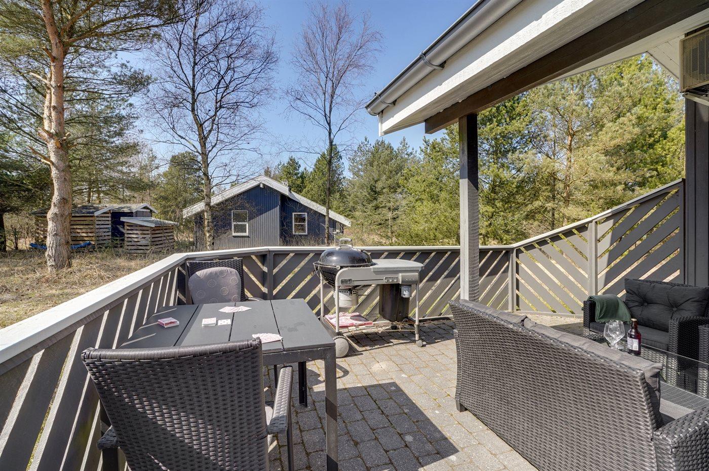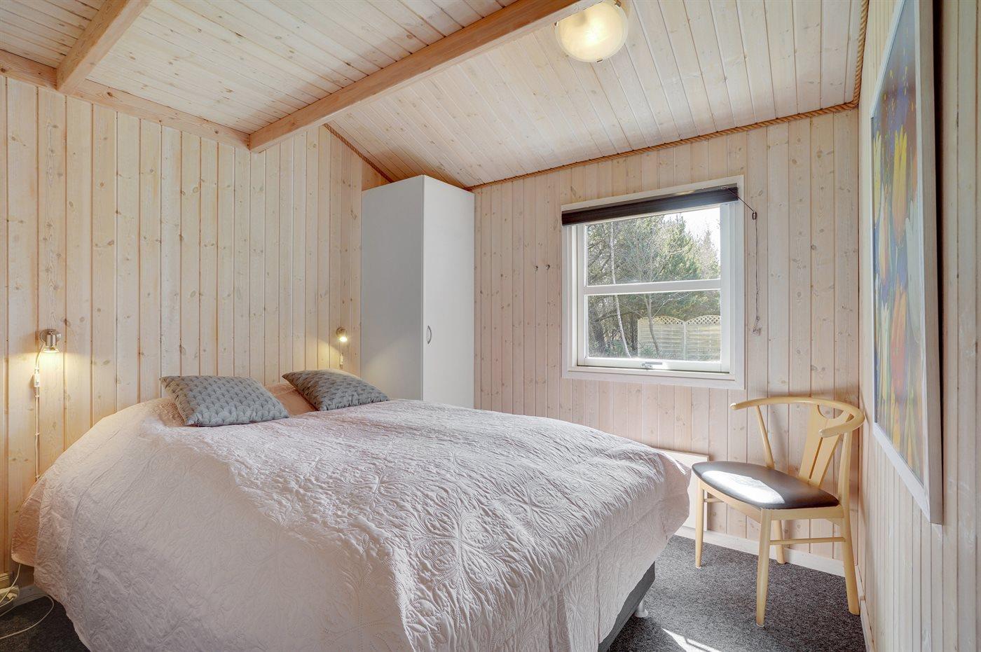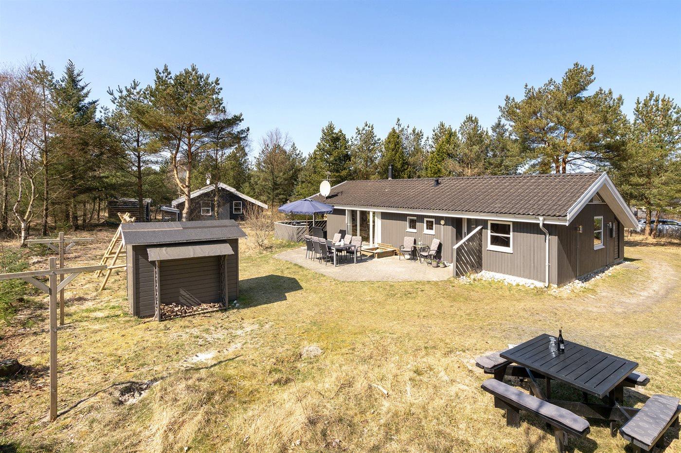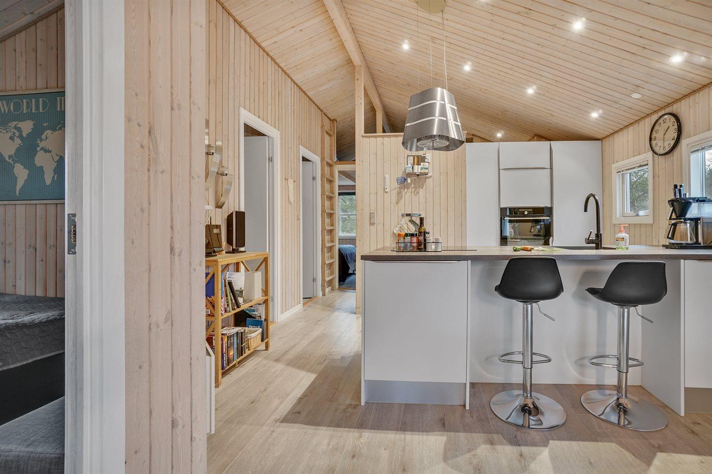 Et virkelig dejligt, veludstyret sommerhus, bygget i træ 2000 og løbende vedligeholdt. Åben såvel som overdækket terrasse med pæne havemøbler. Indvendigt er vægge og lofter beklædt med lyst træ, trægulv i stue og tæpper på værelser. 2 pæne badeværelser med bruseniche og gulvvarme; det ene har ligeledes lækker 2-pers. spa og adgang til sauna. Køkkenet er i åben forbindelse med stuen og indeholder bl.a. komfur med keramiske kogeplader, varmluftovn, fryser, mikrobølgeovn og opvaskemaskine. Dejlig, stor stue med bl. a. brændeovn, TV med parabol (digital), video, DVD-afspiller og stereoanlæg med CD-afspiller. Gratis ADSL-internetforbindelse (egen computer skal medbringes). Hems med TV til spil. Huset er indrettet med 4 soveværelser: 2 med dobbeltseng og 2 med hver 2 enkeltsenge. Desuden findes der 2 sovepladser på madrasser på husets hems. Af yderligere udstyr kan vaskemaskine, tørretumbler og 2 ekstra TV nævnes. Til de mindste feriegæster er der gynge, sandkasse, barneseng og høj barnestol til rådighed. Huset fremstår som et særdeles lækkert sommerhus for såvel 1 som 2 familier, der ønsker en ferie i et naturskønt område med mulighed for mange spændende ture i den storslåede natur enten i skovområdet eller ved havet, hvor man om aftenen kan se fiskerne trække deres både på land. Der er særdeles gode bade- og fiskemuligheder i gåafstand fra huset. I den nærliggende by Fjerritslev er der masser af aktivitetsmuligheder, bl. a. svømmehal, bowling eller shopping.