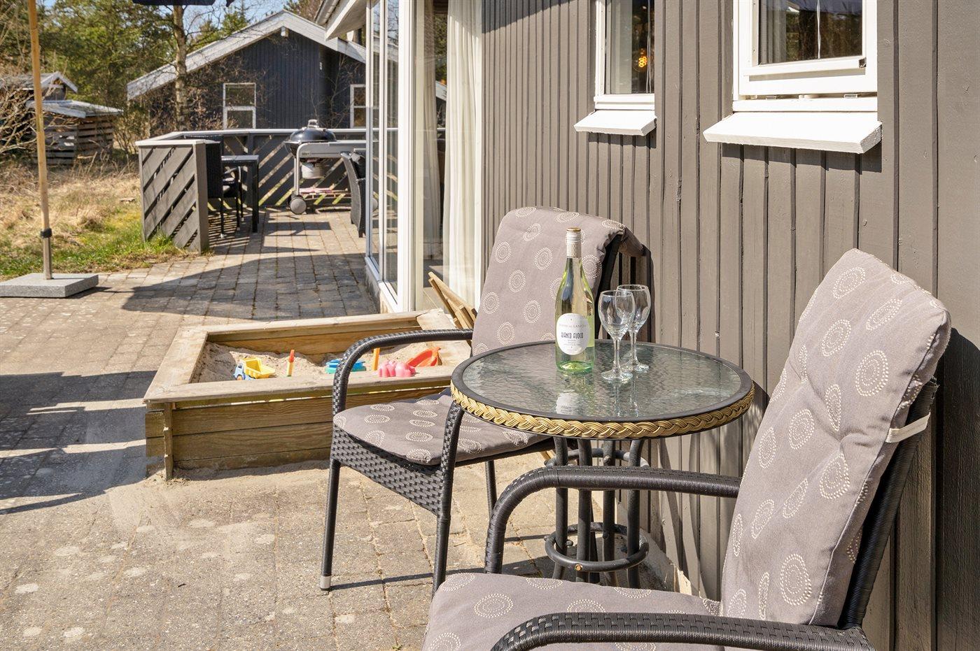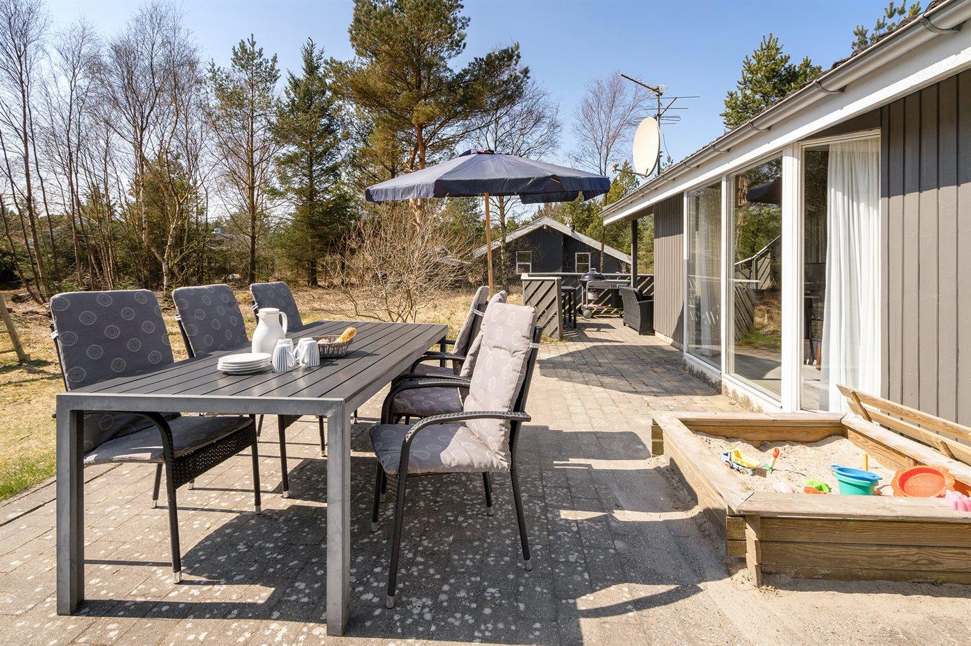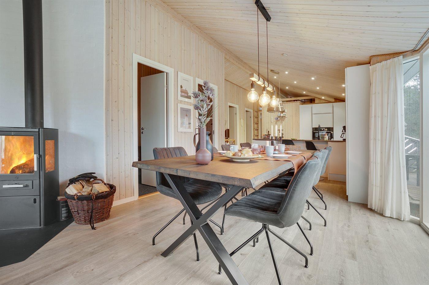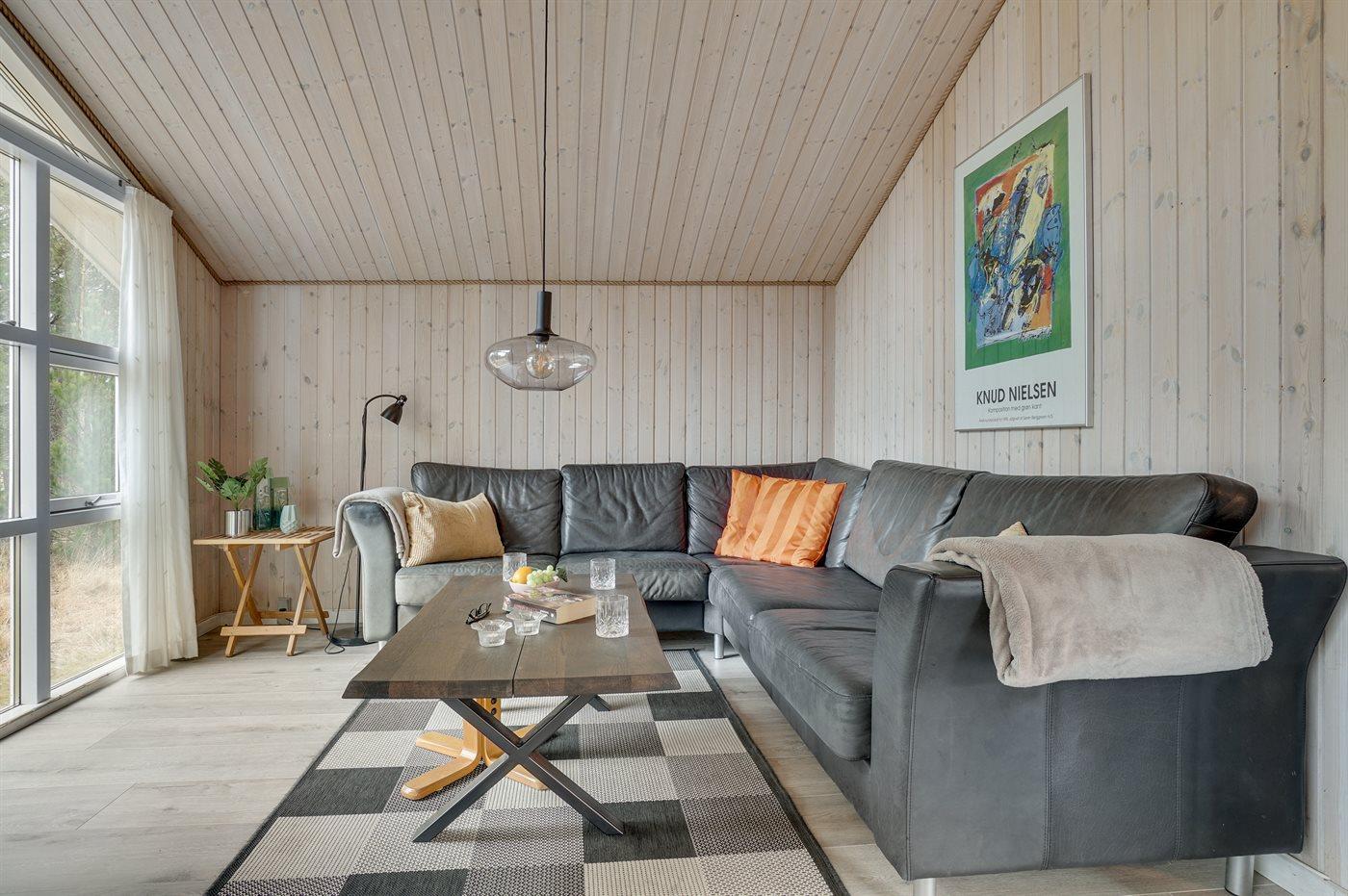 Et virkelig dejligt, veludstyret sommerhus, bygget i træ 2000 og løbende vedligeholdt. Åben såvel som overdækket terrasse med pæne havemøbler. Indvendigt er vægge og lofter beklædt med lyst træ, trægulv i stue og tæpper på værelser. 2 pæne badeværelser med bruseniche og gulvvarme; det ene har ligeledes lækker 2-pers. spa og adgang til sauna. Køkkenet er i åben forbindelse med stuen og indeholder bl.a. komfur med keramiske kogeplader, varmluftovn, fryser, mikrobølgeovn og opvaskemaskine. Dejlig, stor stue med bl. a. brændeovn, TV med parabol (digital), video, DVD-afspiller og stereoanlæg med CD-afspiller. Gratis ADSL-internetforbindelse (egen computer skal medbringes). Hems med TV til spil. Huset er indrettet med 4 soveværelser: 2 med dobbeltseng og 2 med hver 2 enkeltsenge. Desuden findes der 2 sovepladser på madrasser på husets hems. Af yderligere udstyr kan vaskemaskine, tørretumbler og 2 ekstra TV nævnes. Til de mindste feriegæster er der gynge, sandkasse, barneseng og høj barnestol til rådighed. Huset fremstår som et særdeles lækkert sommerhus for såvel 1 som 2 familier, der ønsker en ferie i et naturskønt område med mulighed for mange spændende ture i den storslåede natur enten i skovområdet eller ved havet, hvor man om aftenen kan se fiskerne trække deres både på land. Der er særdeles gode bade- og fiskemuligheder i gåafstand fra huset. I den nærliggende by Fjerritslev er der masser af aktivitetsmuligheder, bl. a. svømmehal, bowling eller shopping.