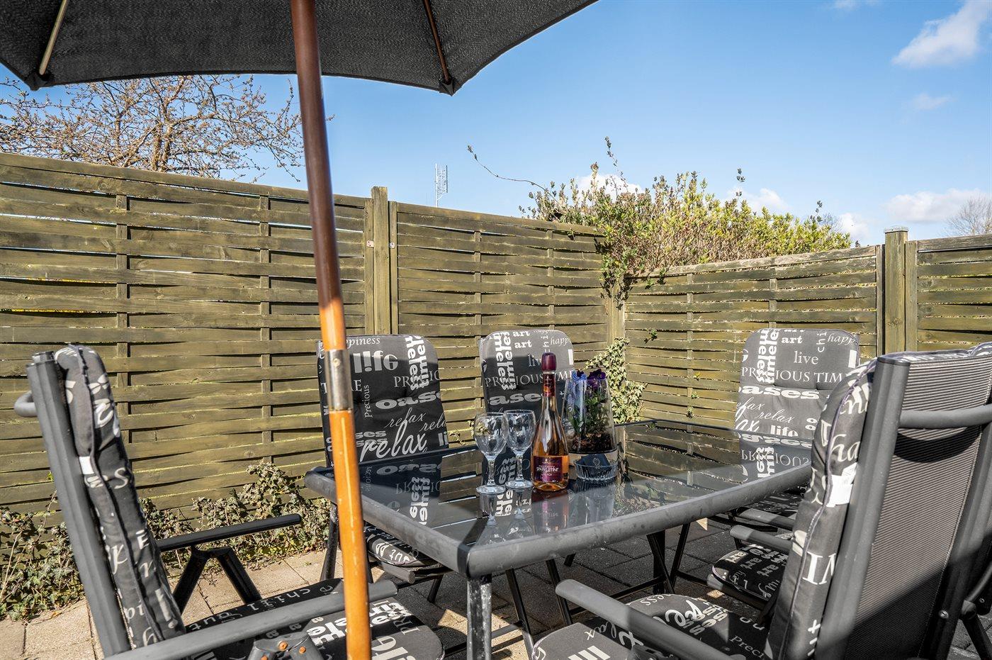På den 149 m² fuldt indhegnede havegrund findes et 20 m² åbent terrasseareal med gasgrill. Der er kun 50 m til en fælles parkeringsplads.