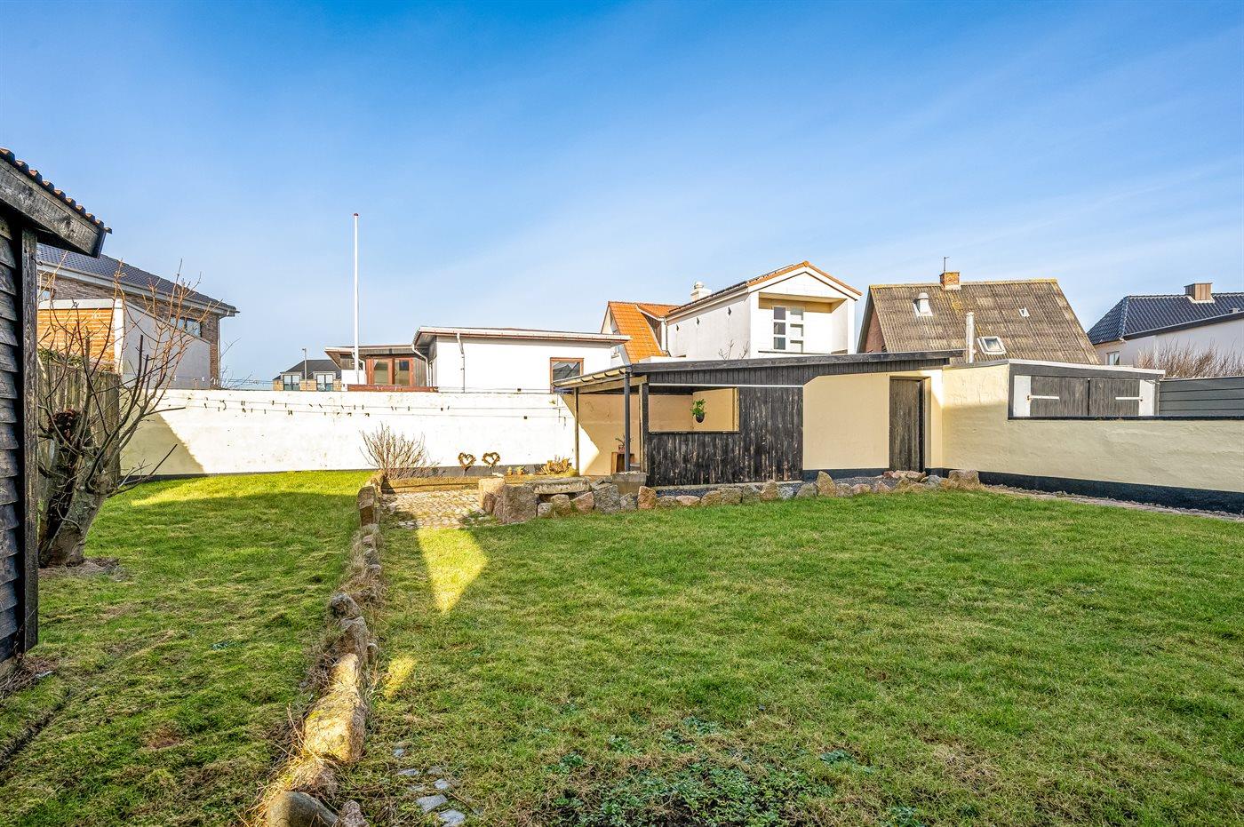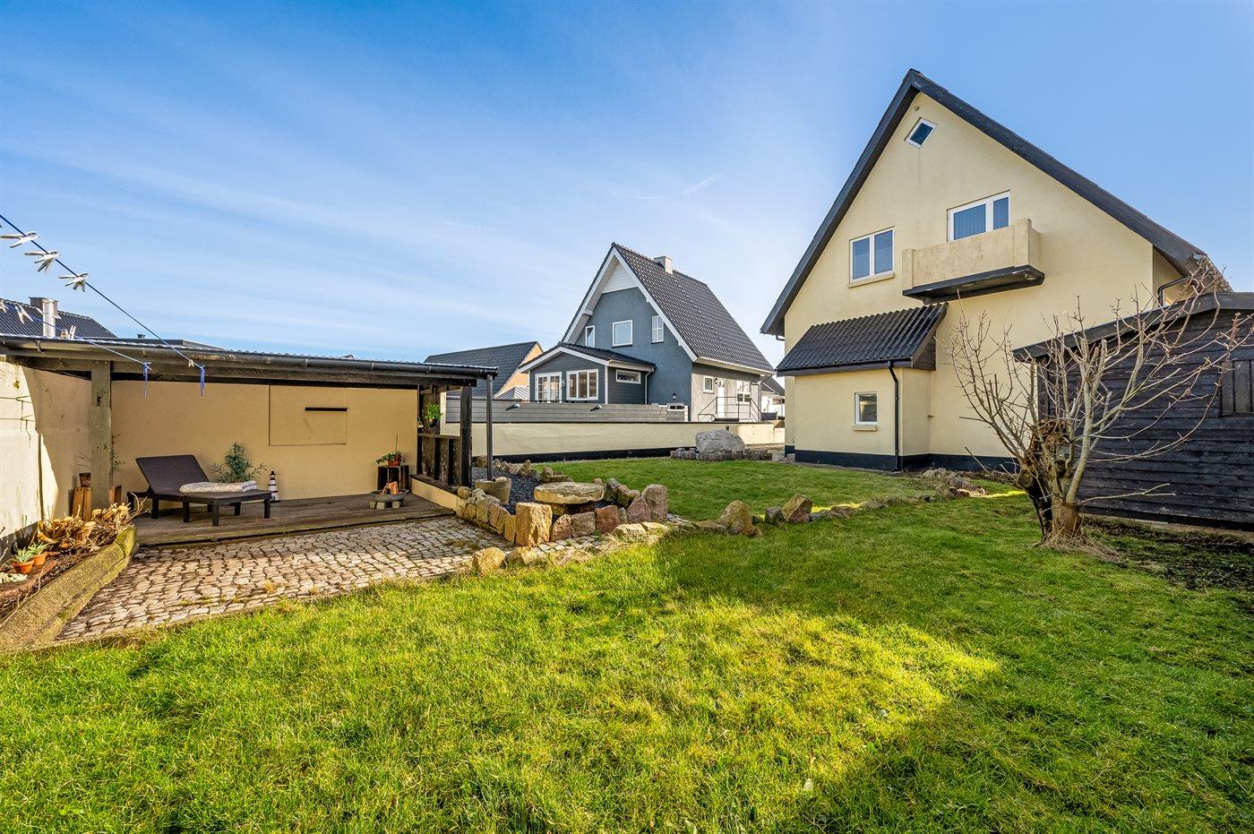 Ferieboligen er beliggende på en 337 m² stor havegrund. Der er 200 m til havet. Der er 200 m til fjorden. Nærmeste forretning er beliggende i en afstand af 125 m. Desuden er der overdækket terrasse. Der er redskabsrum. Der ligger en legeplads i en afstand af 75 m. Grill til rådighed. Parkering ved ferieboligen.