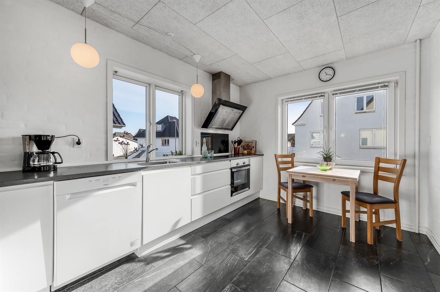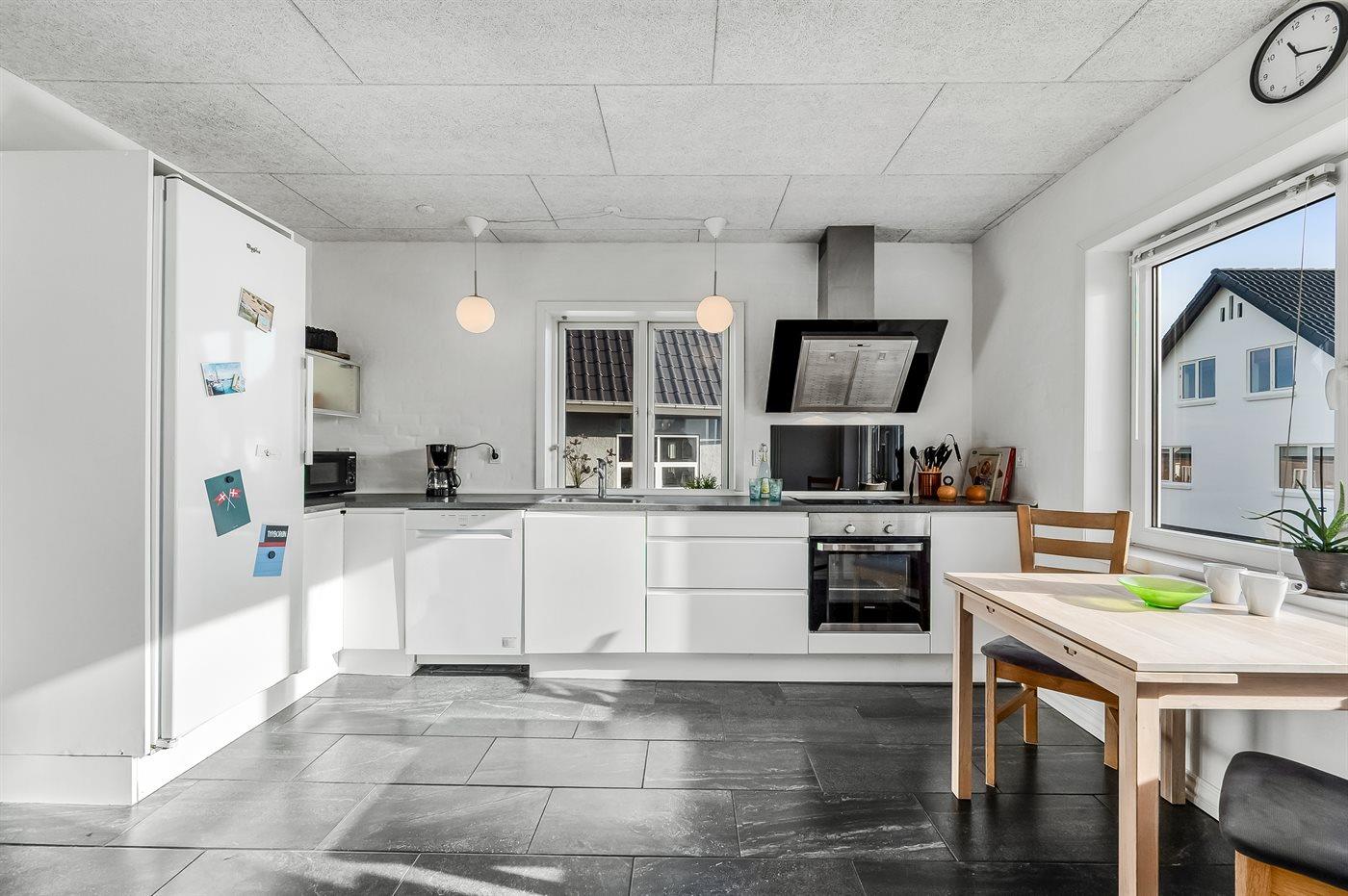 Køkkenet er udstyret med 1 køleskab. Der er 4 induktionskogeplader, varmluftovn, mikrobølgeovn samt opvaskemaskine.