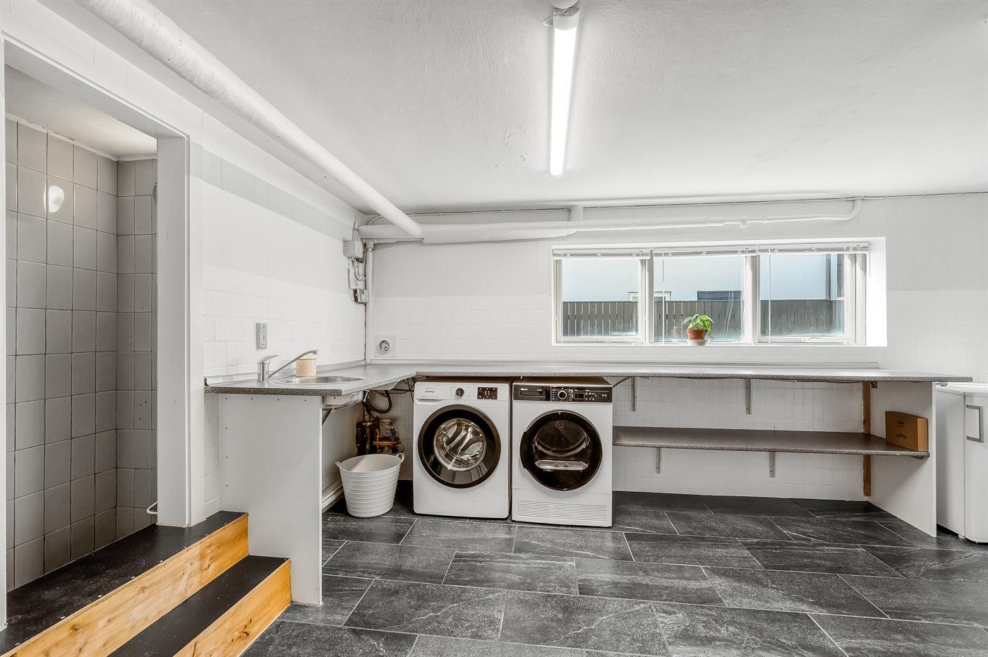 Der er 2 badeværelser med bruseniche og 2 toiletter. Der er gulvvarme på 1 badeværelse.. Badekar. I saunaen er der mulighed for afslapning.
