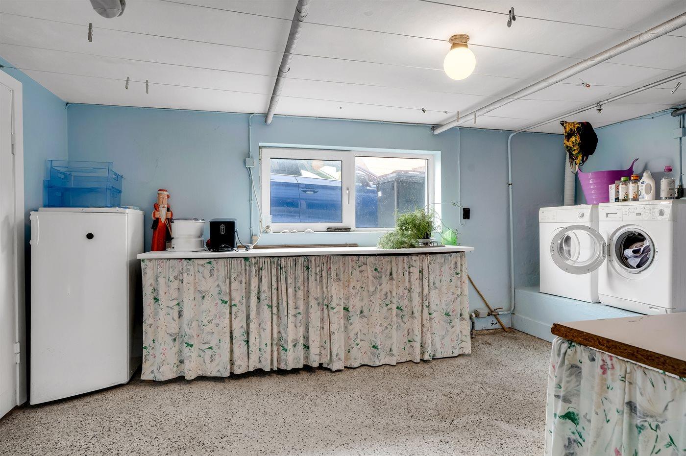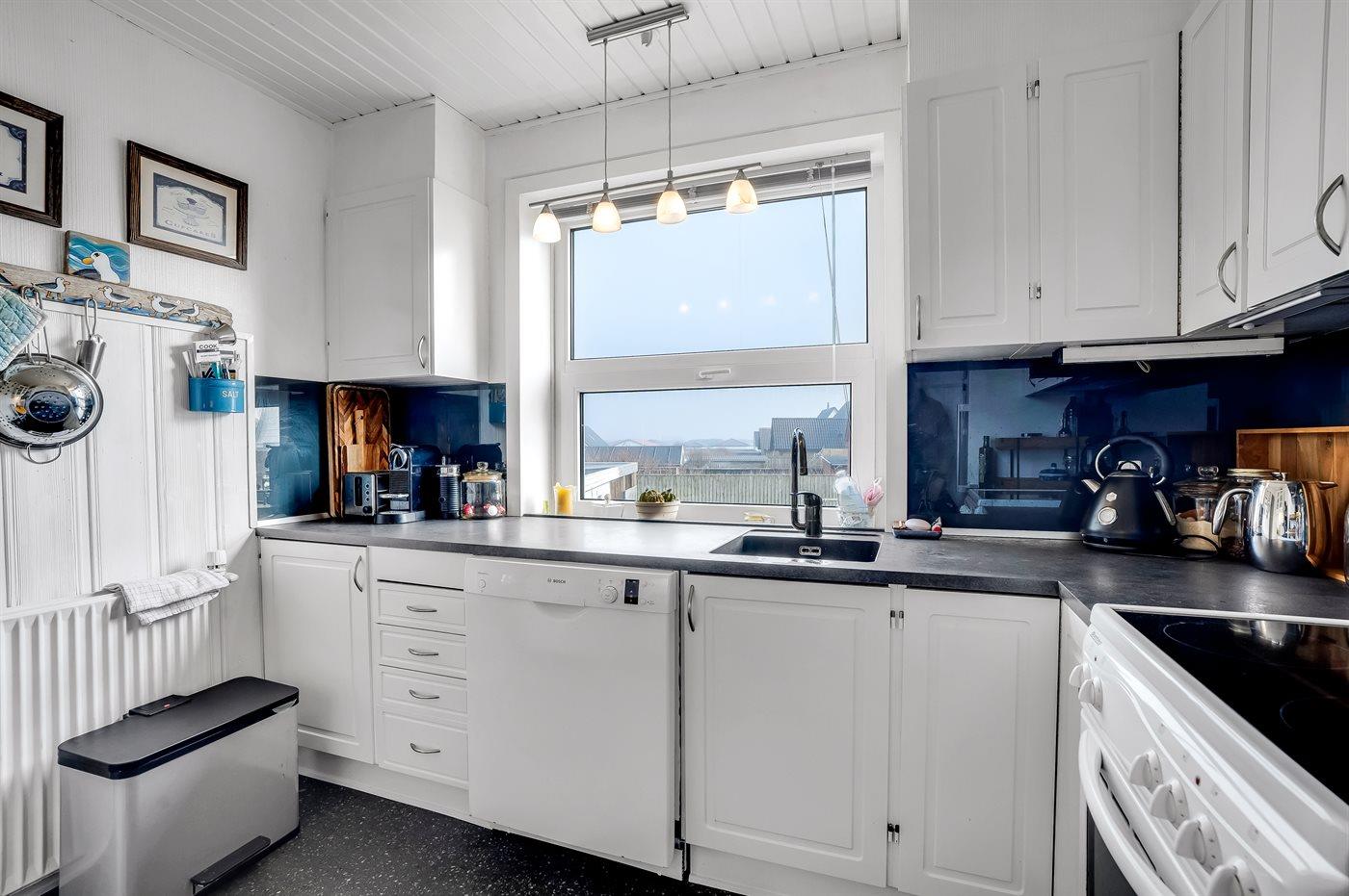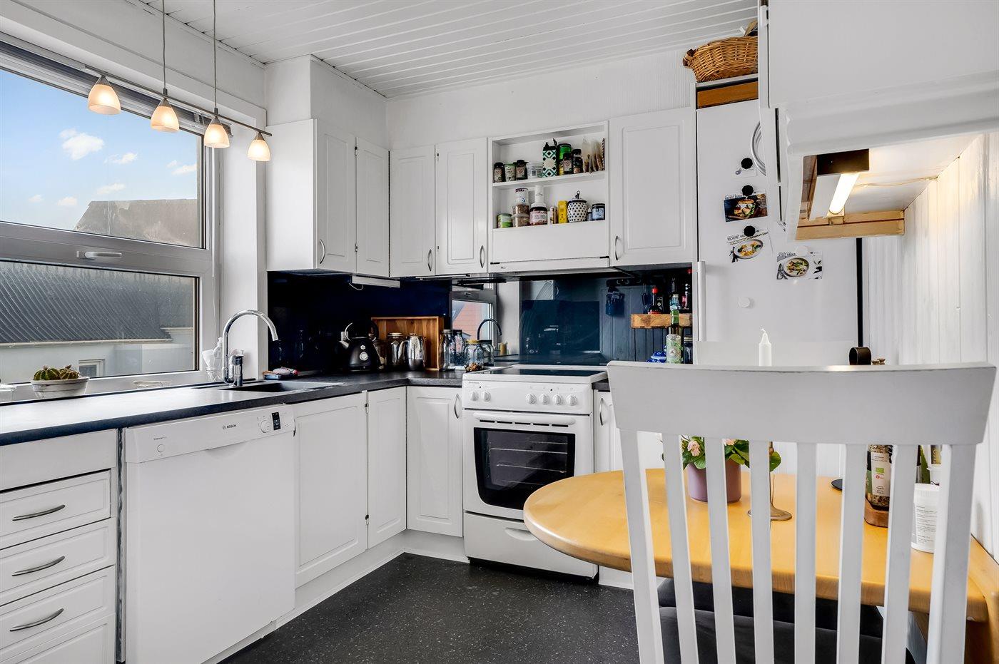 Køkkenet er udstyret med 1 køleskab. Der er 4 elkogeplader, varmluftovn samt opvaskemaskine.