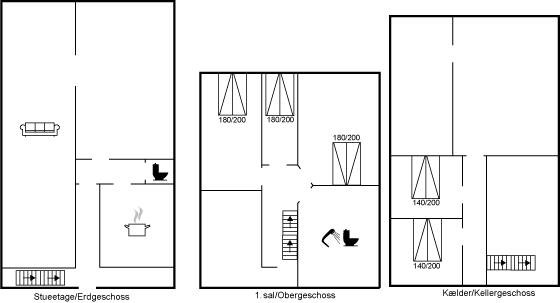 Huset er indrettet med 2 sovepladser fordelt på 2 værelser i kælderen og 6 sovepladser fordelt på 3 værelser på 1. sal.