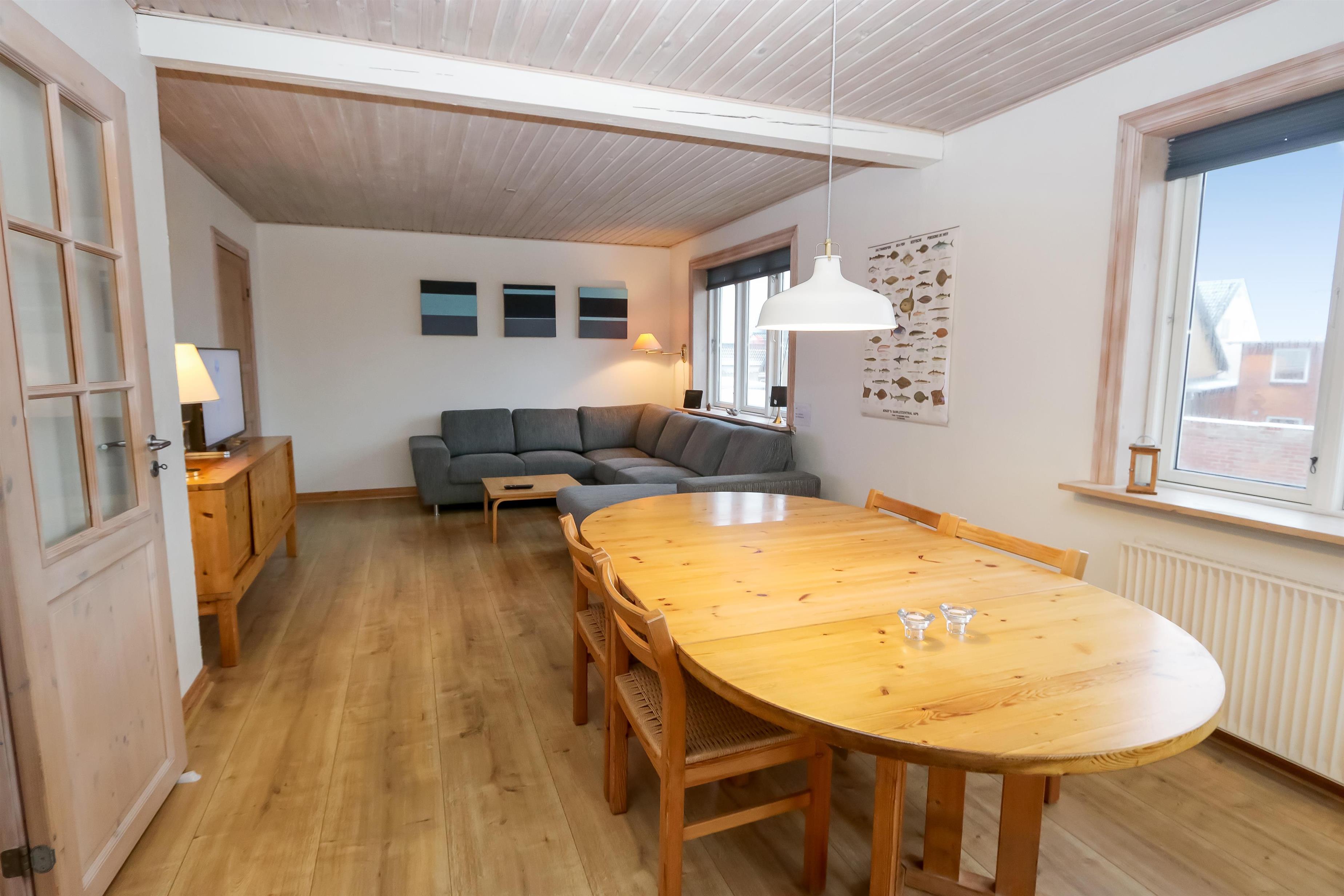 En lille entre med adgang til mindre badeværelse med toilet, håndvask og bruser. Flot, nyere køkken med spiseplads, opvaskemaskine, keramisk komfur, indbygningovn, mikrovn, køleskab med fryseboks og flot udsigt til de høje klitter ved Vesterhavet. Flot nyrenoveret opholdsstue med 2 siddehjørner. Den ene med lædermøbler og det andet med flot ny polsterhjørnesofa. I stuen er der også TV med danske og tyske progammer samt mulighed for streaming af TV / radio / Apps . Så har du en mobiltelefon eller et andet device med kan du streame hvad du nu har abonnement. , DVD-afspiller, stereoanlæg med radio og CD-afspiller. Fra køkkenet går det en trappe ned til en stor nyistandsast kælder med 2 soveværelse (1DS+1ES, 1DS), badeværelse med toilet, håndvask, bruser og gulvvarme. Dejlig bryggers med vaskemaskine og tørretumbler samt afliggeplads. Barneseng og højstol til børnene. Ikke rygerhus. 1 husdyr tilladt.