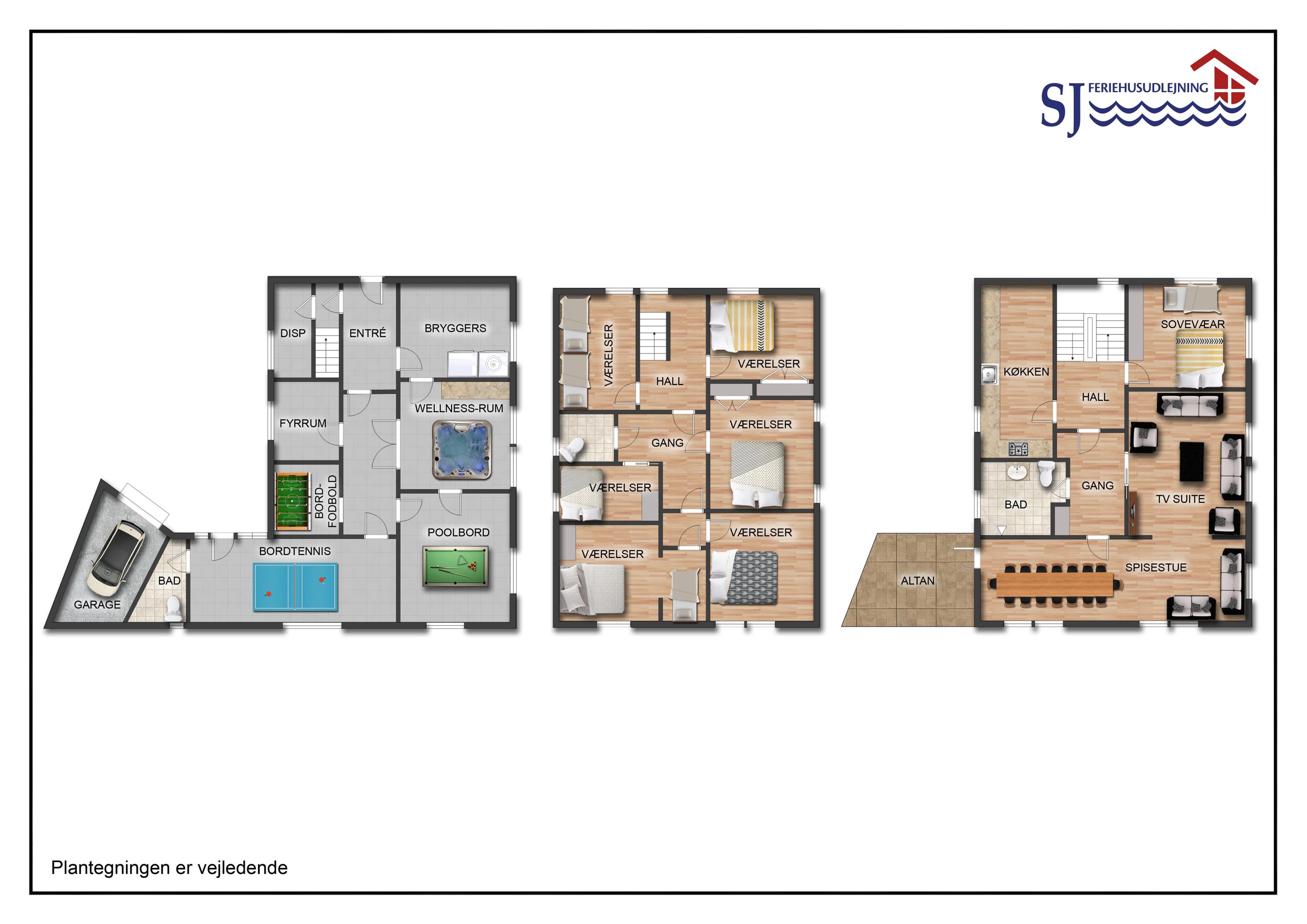 Huset har i alt 7 soverum indeholdende 6 dobbeltsenge og 4 enkeltsenge. Feriehuset er 354 m2 stort fordelt på 3 etager. Husets nederste etage er med gulvvarme og rummer aktivitetsafdelingen, som indeholder bordfodbold, bordtennis og poolbord. Desuden forefindes wellnessafdeling. Her kan man sætte sig i den 5 personers store spa, hvor man har muligheden for at få en gang let massage, eller man kan benytte husets sauna. Der er ligeledes mulighed for at tage et koldt eller varmt bad, inden man skal i gang med wellness. Separat badeværelse og vaskerum med fryseskab. Den midterste etage indeholder separat køkken, som er veludstyret med bl.a. dobbelt op af ovne, induktionskogeplader og opvaskemaskiner, derudover findes et stort køleskab. Stor spiseafdeling med adgang til opholdsstuen, som er udstyret med lædermøbler og stort TV med fjernsynspakke. Husets største soveværelse og badeværelse befinder sig på denne etage. Separat badeværelse og vaskerum. Den øverste etage er husets soveafdeling med 6 soverum. Desuden er der et gæstetoilet. Til børnene er der 2 barnesenge og 2 barnestole. 2 stk. husdyr er tilladt. Huset lejes ikke ud til ungdomsgrupper. Depositum vintersæson kr. 7000 og sommersæson kr. 5000. Obligatorisk slutrengøring.