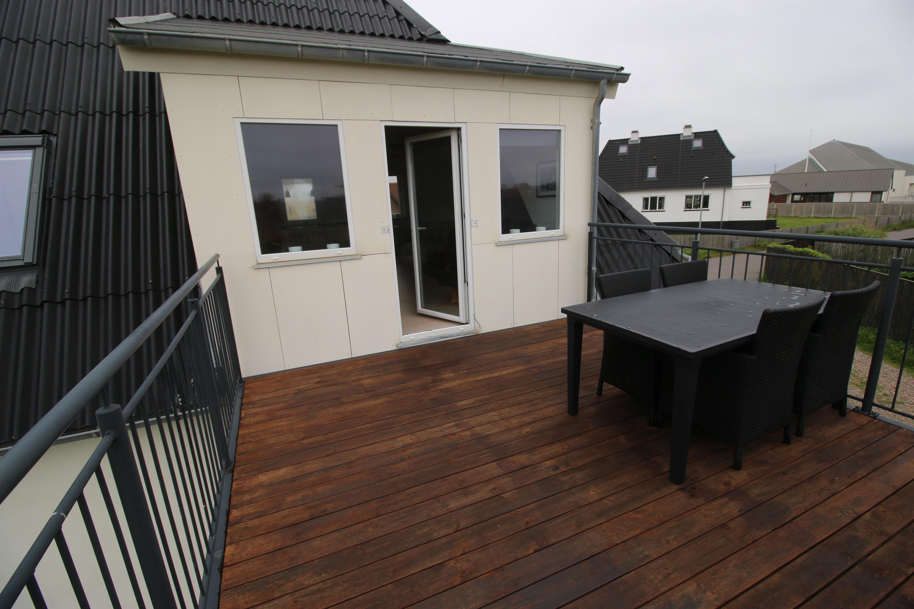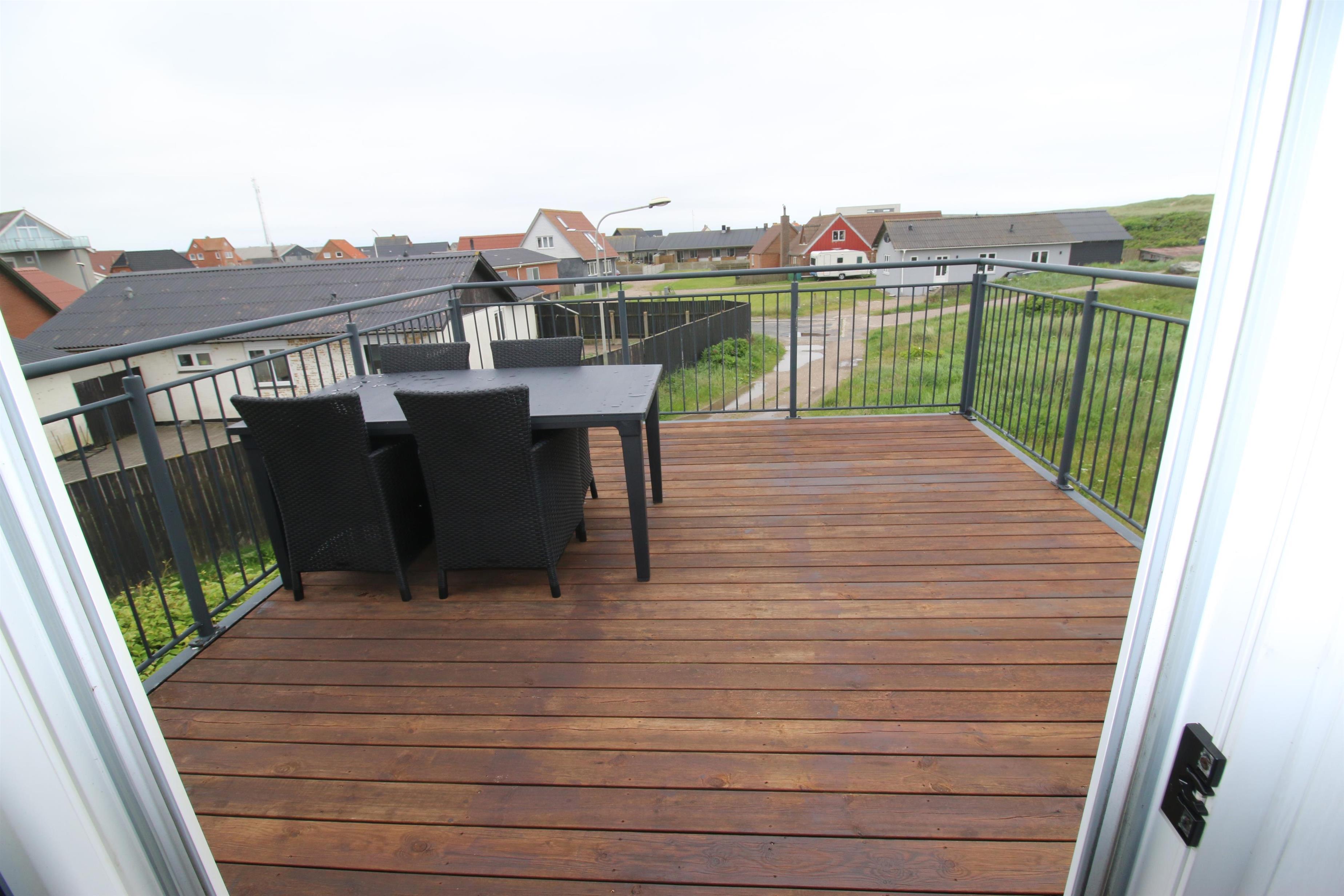 Fra opholdsstuen er der udgang til en fantastisk indhegnet balkon / terrasse med en fantastisk udsigt over til de høje klitter og Vesterhavet i Thyborøn. Havebord og havestole samt grill til en hyggelig aften nær Vesterhavet. Fra lejligheden kan alle Thyborøns attraktioner nås i gåafstand. Tag en havnerunde og nyd livet på havnen, besøg fiskeriauktionen i sæsonen eller prøv en af Vesterhavets mest børnevenlige badestrande lige før Vesterhavet bliver til Limfjord blot 1500 meter fra huset. Stranden lige op til huset udmærker sig ved at være mere egnet til lystfiskeri, snorkling og dykning samt flyve med drage og samle rav. Her kan man også i timevis studere bunkere og sågar gå ind i mange af dem - husk lommelygte. Vandrer man fra huset under 1 kilometer mod syd kommer man til et stort fuglereservat hvor man i fred og ro kan vandre rundt og betragte naturen på alle årstider.