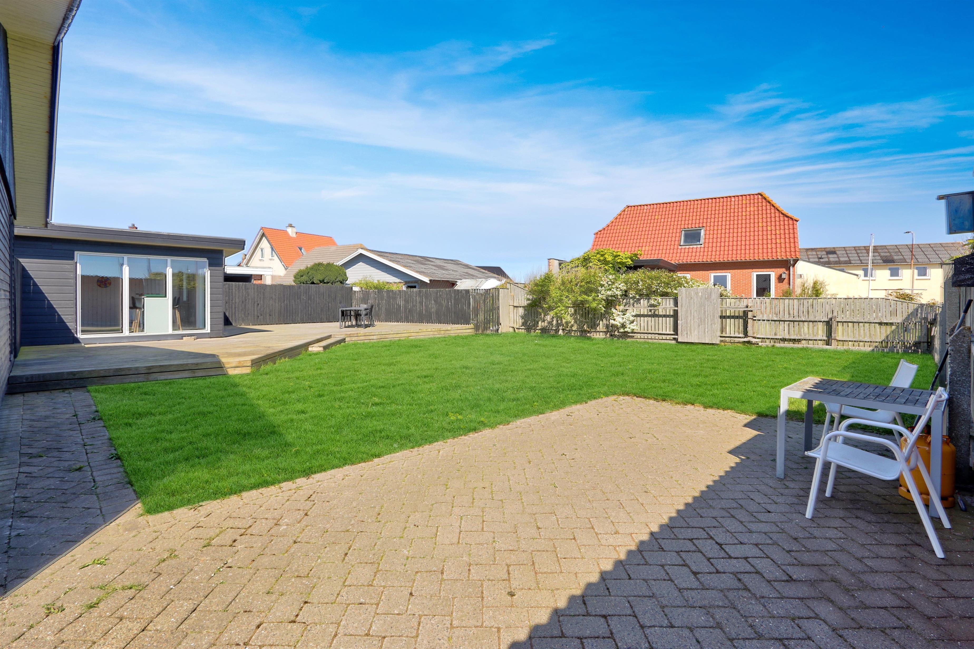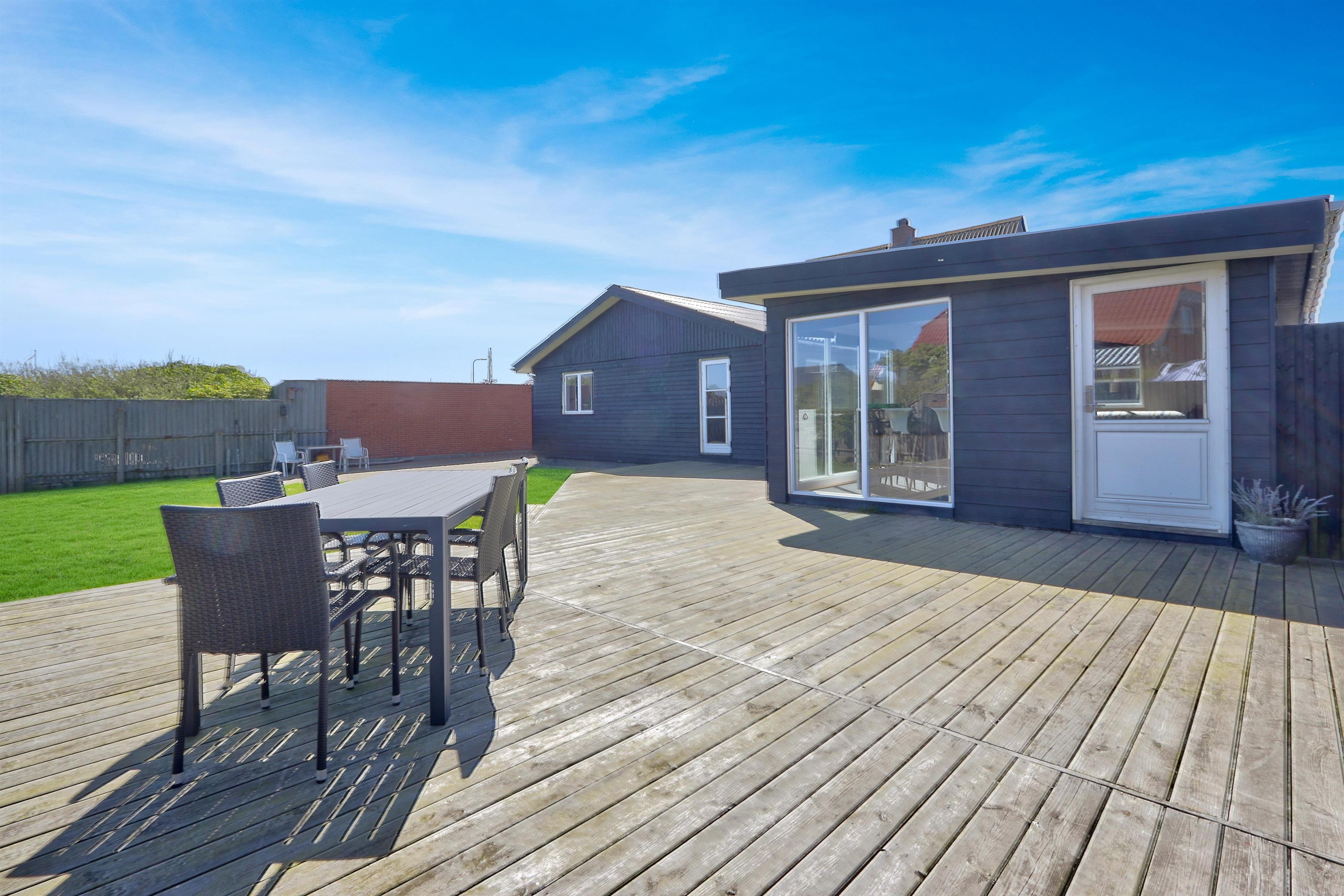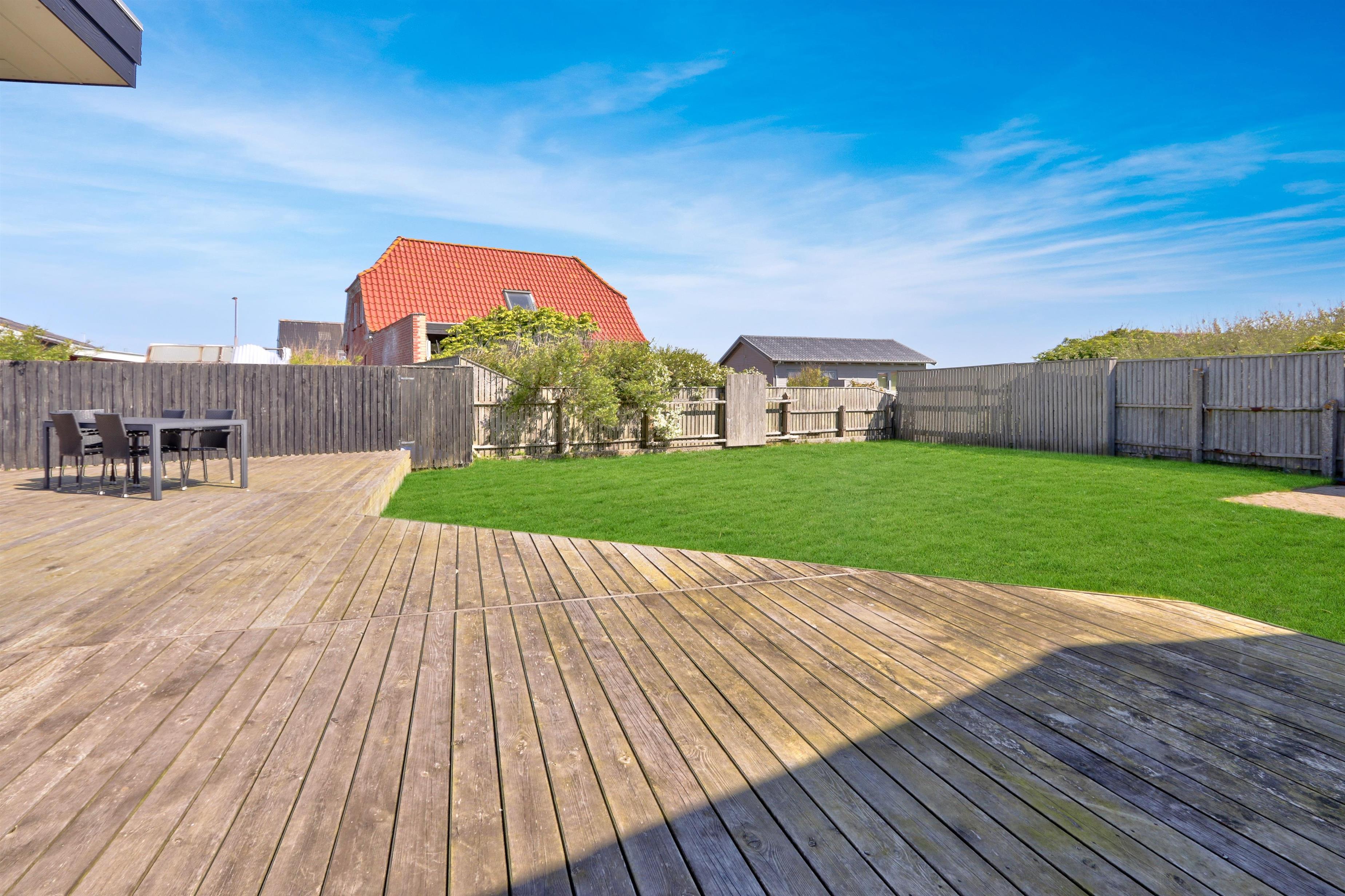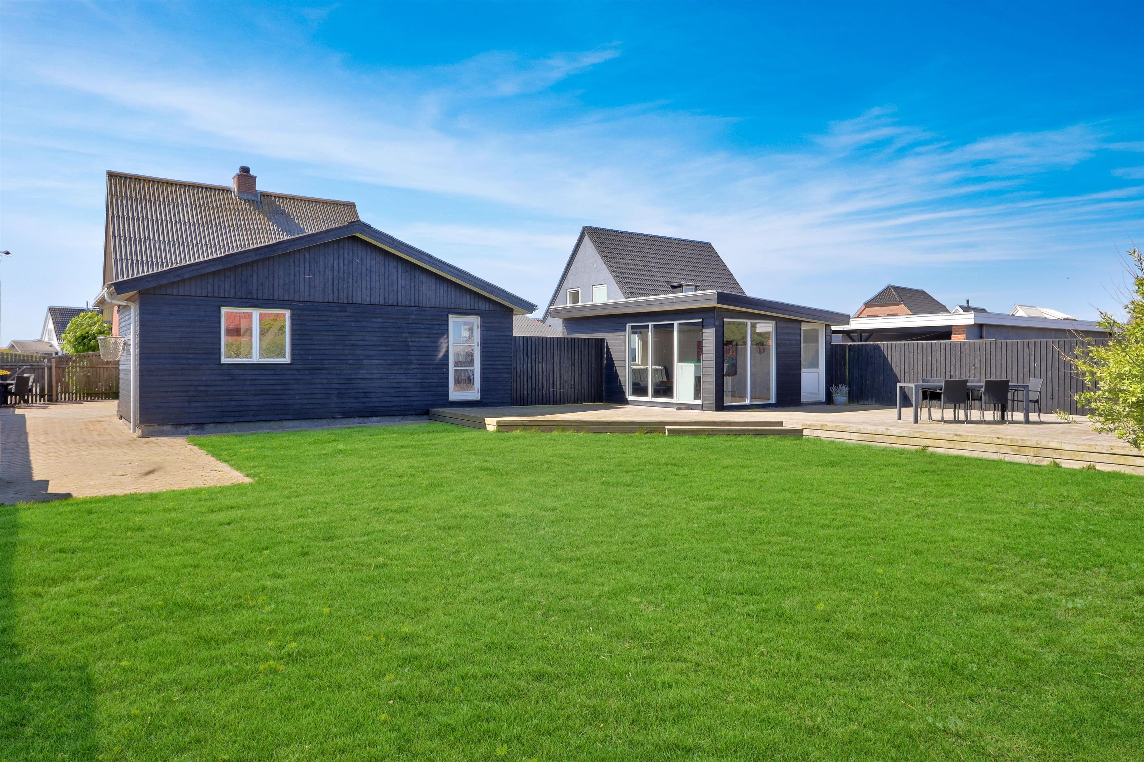 Udendørs venter en lukket og privat have på 757 m², hvor der er masser af plads til leg, afslapning og udendørs måltider. Den lyse havestue forlænger sæsonen og giver mulighed for at nyde haven i læ og varme – også uden for sommermånederne. Der er selvfølgelig havemøbler og grill til fri afbenyttelse. Ved leje af dette feriehus har I fri adgang til Værket i Thyborøn.