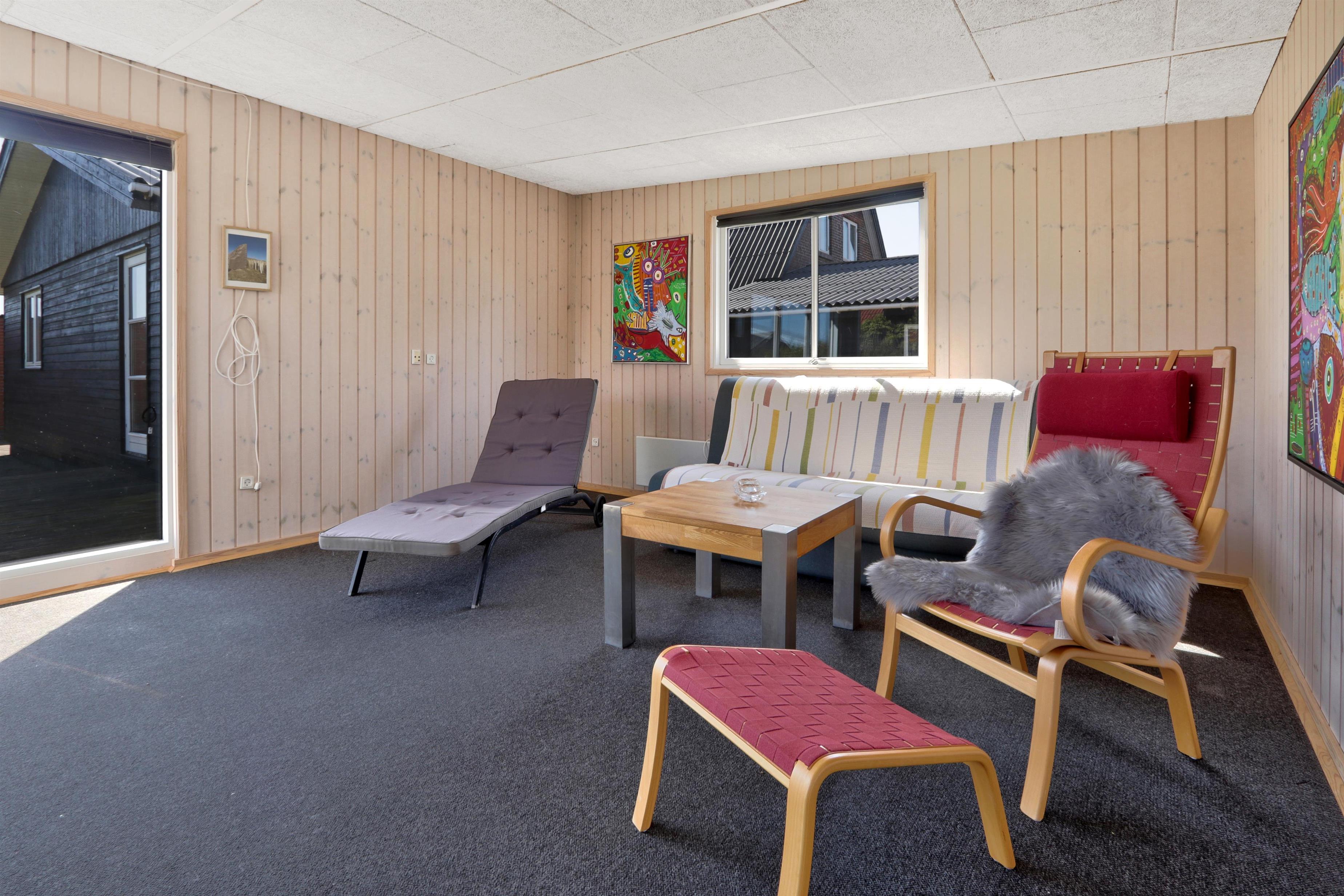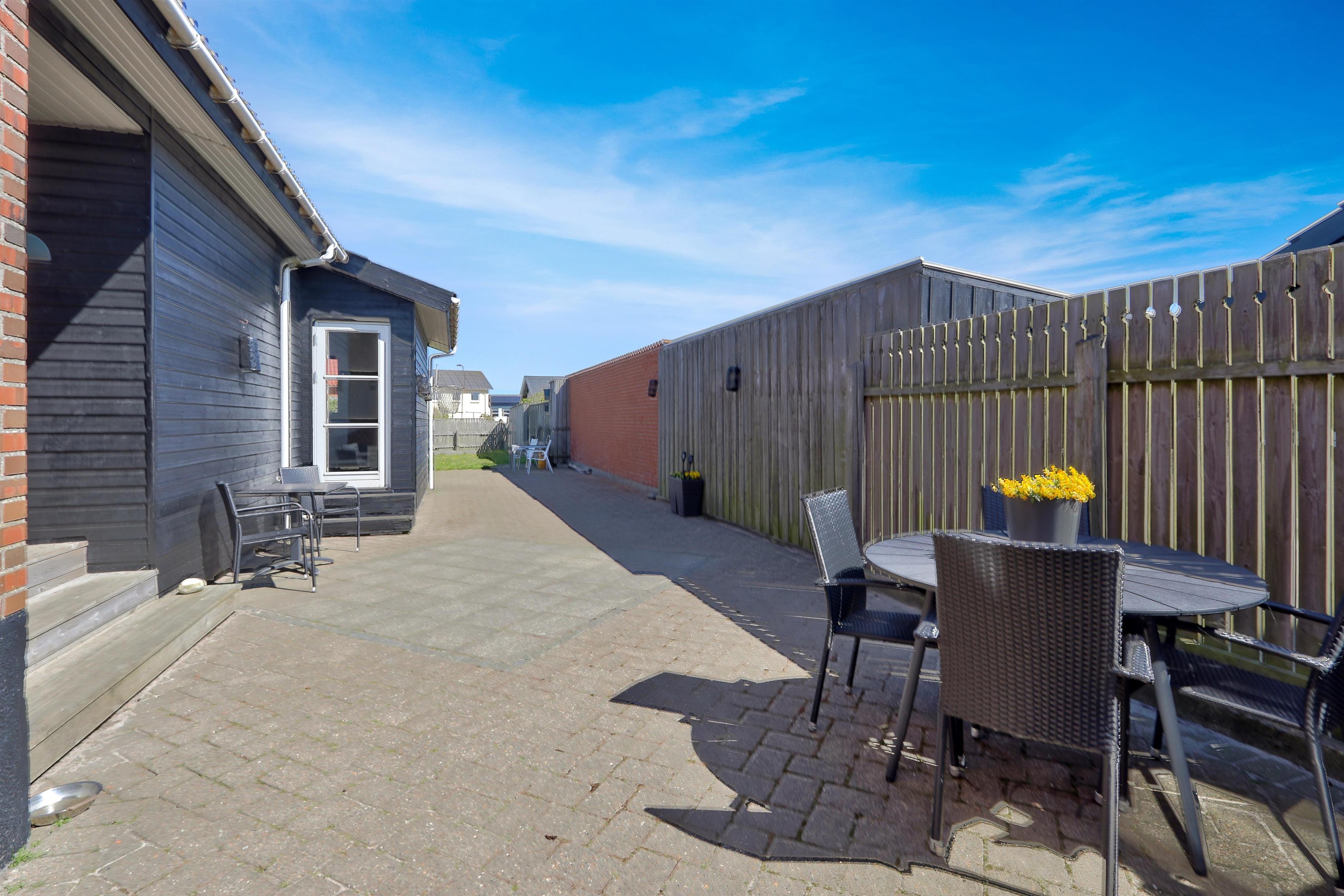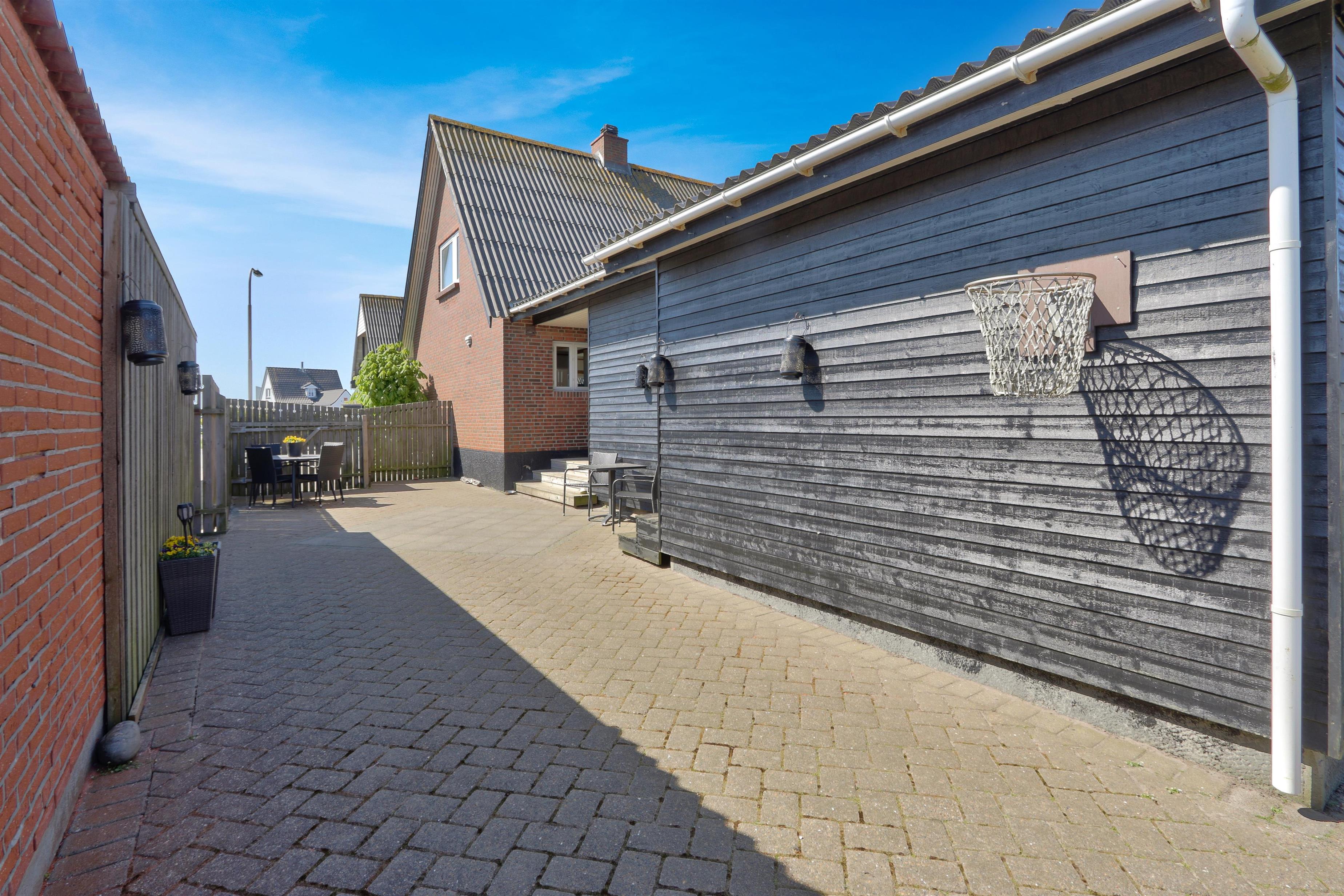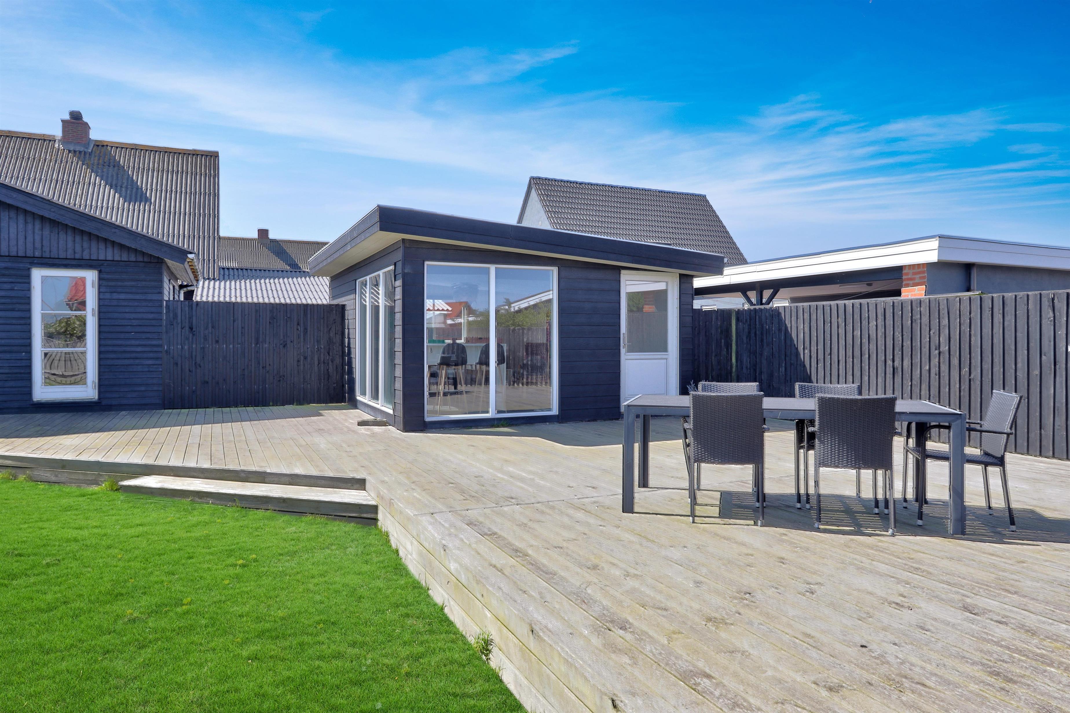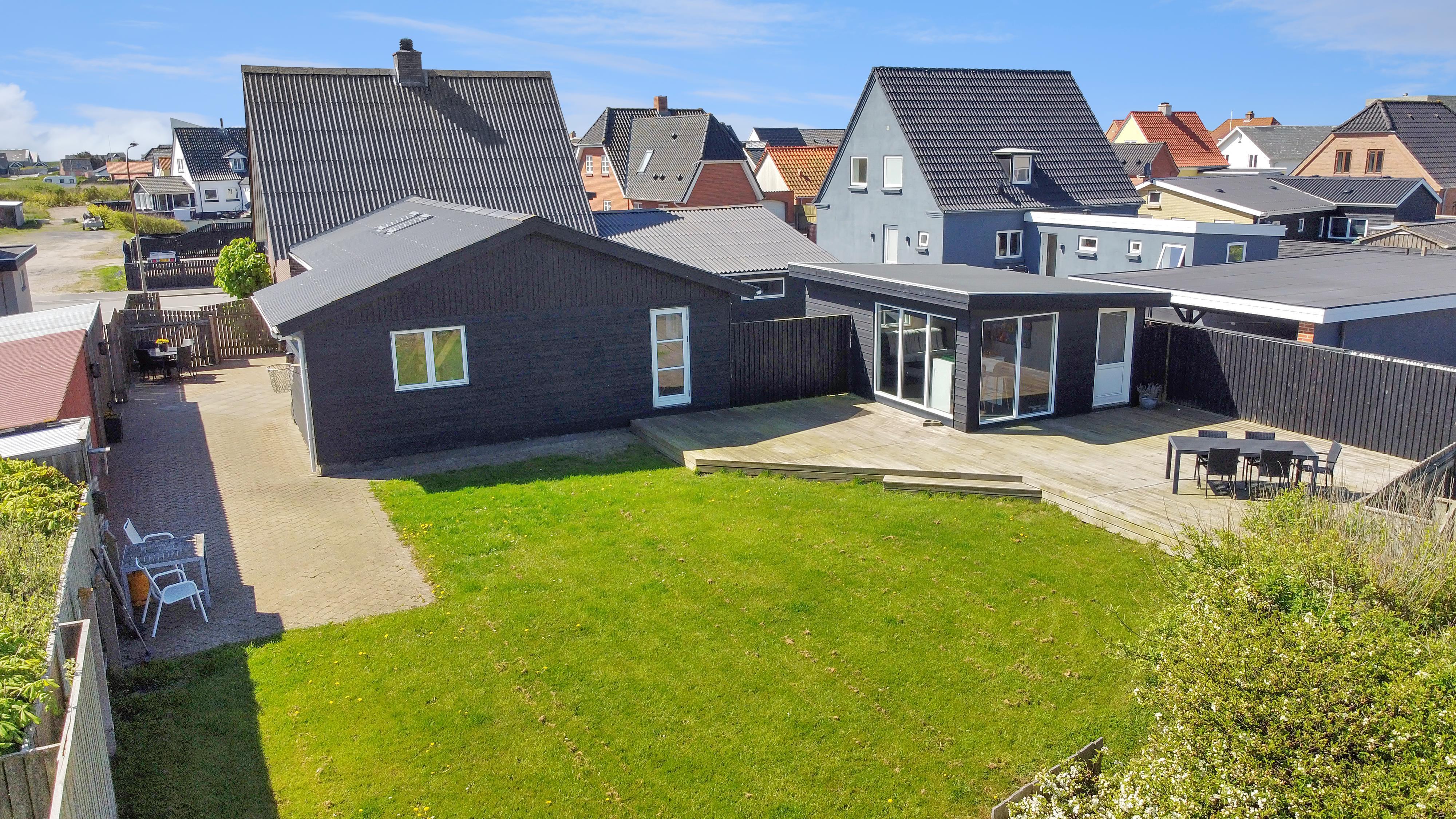 Udendørs venter en lukket og privat have på 757 m², hvor der er masser af plads til leg, afslapning og udendørs måltider. Den lyse havestue forlænger sæsonen og giver mulighed for at nyde haven i læ og varme – også uden for sommermånederne. Der er selvfølgelig havemøbler og grill til fri afbenyttelse. Ved leje af dette feriehus har I fri adgang til Værket i Thyborøn.