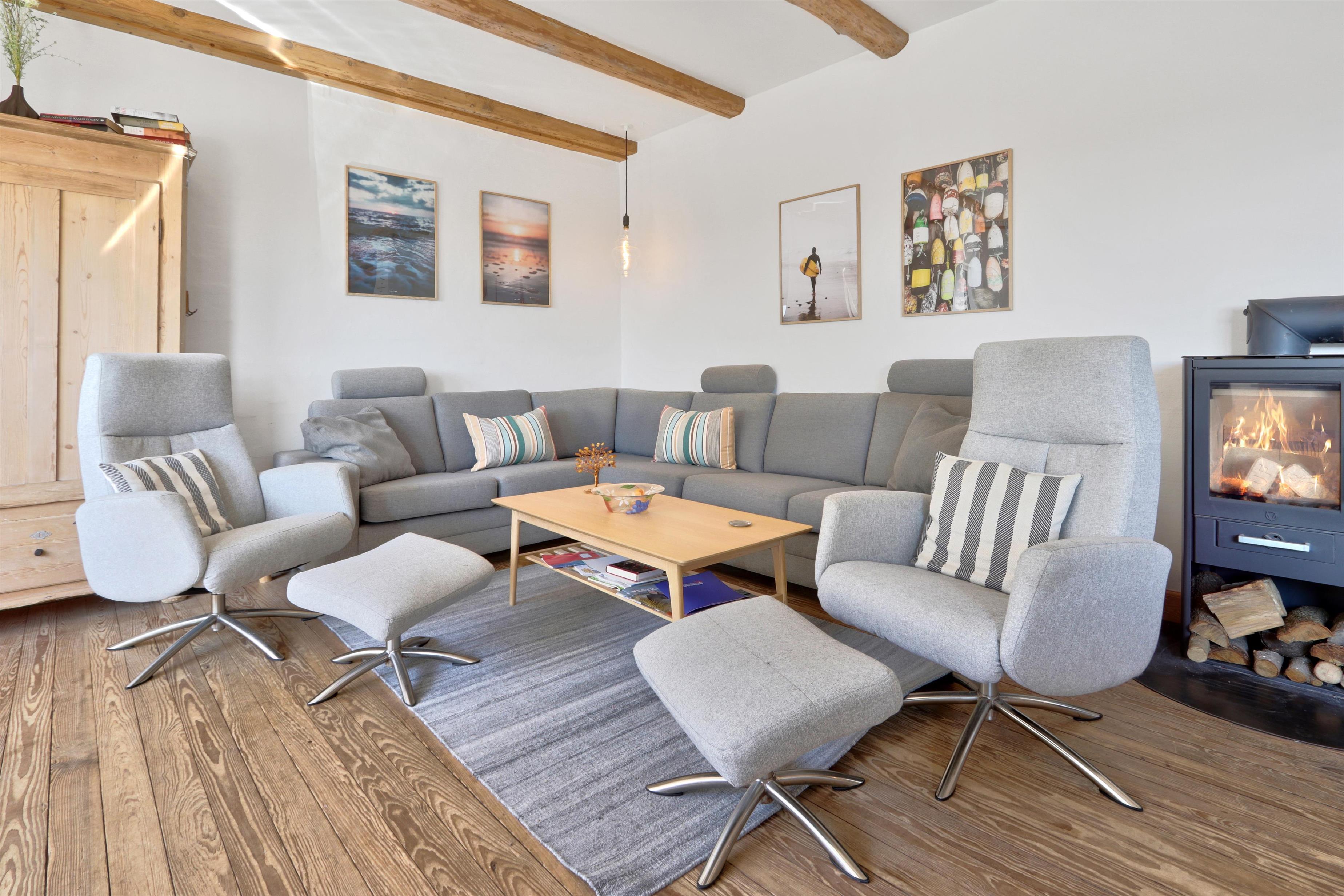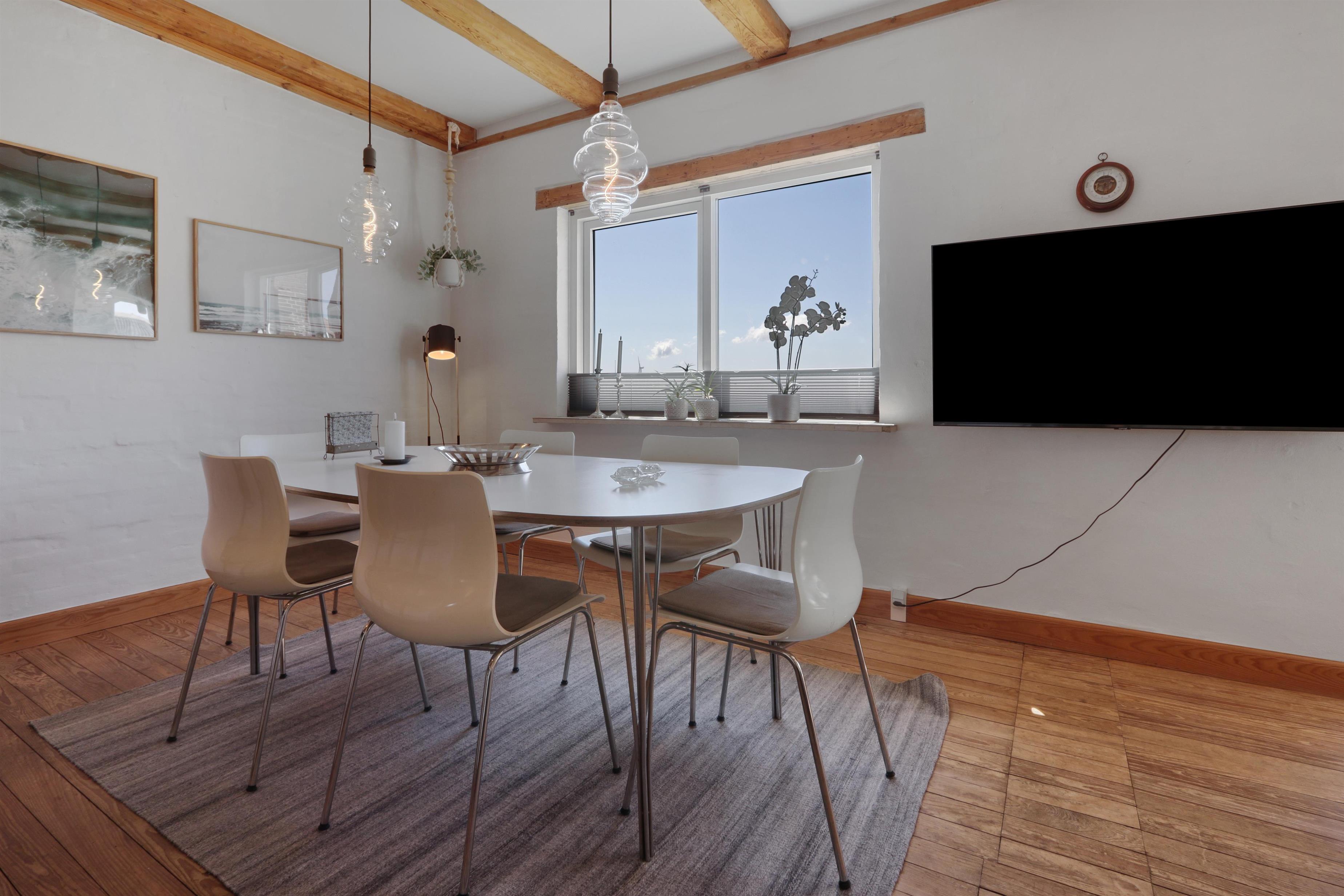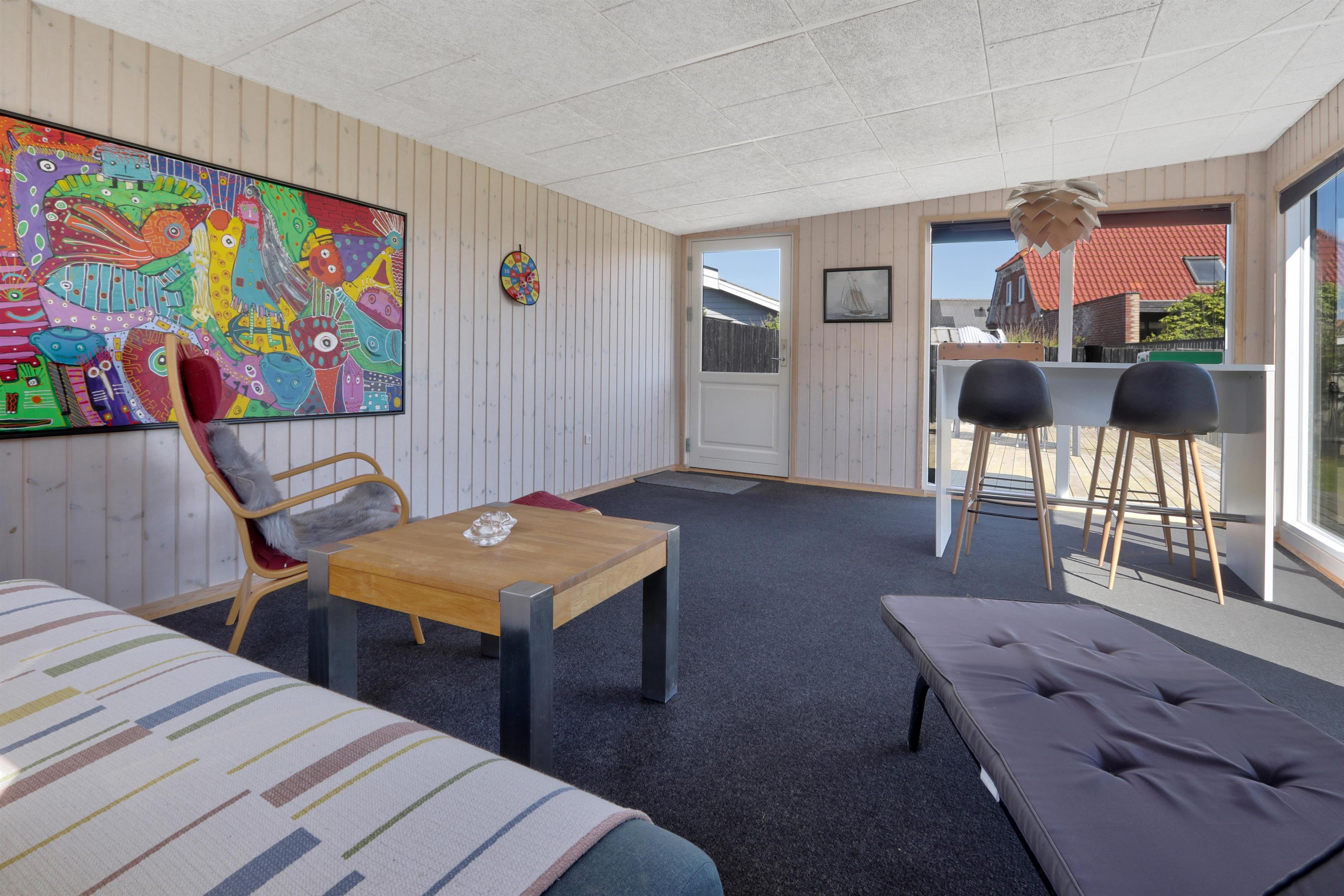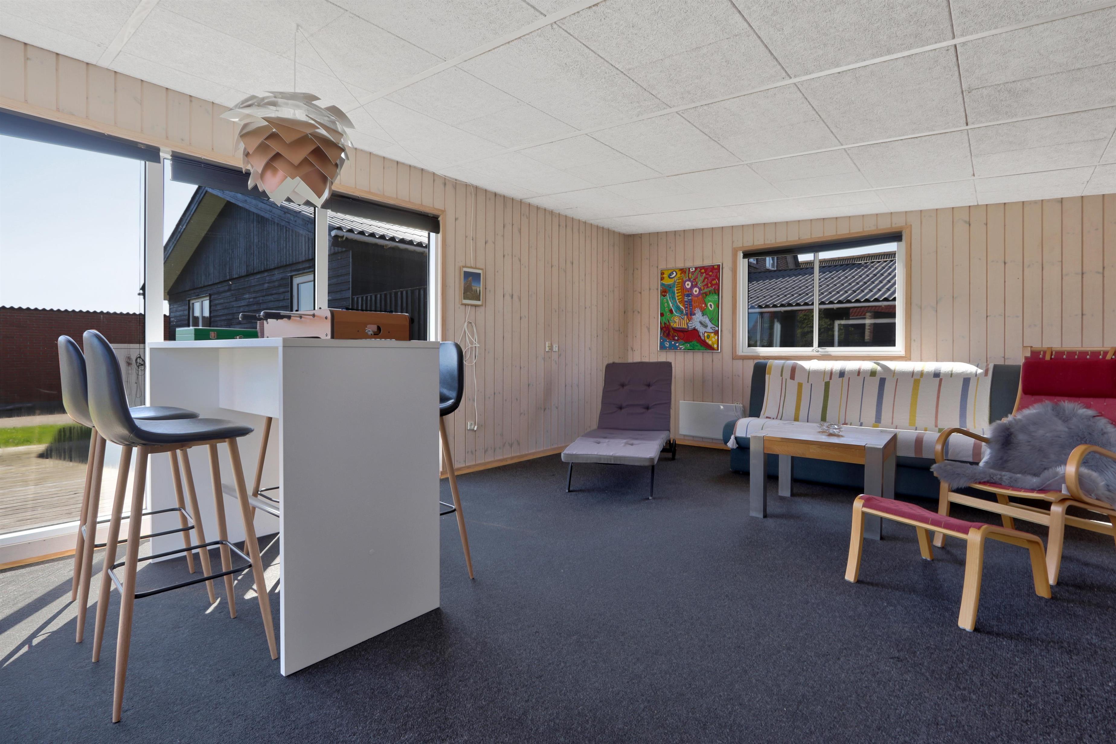 Udendørs venter en lukket og privat have på 757 m², hvor der er masser af plads til leg, afslapning og udendørs måltider. Den lyse havestue forlænger sæsonen og giver mulighed for at nyde haven i læ og varme – også uden for sommermånederne. Der er selvfølgelig havemøbler og grill til fri afbenyttelse. Ved leje af dette feriehus har I fri adgang til Værket i Thyborøn.