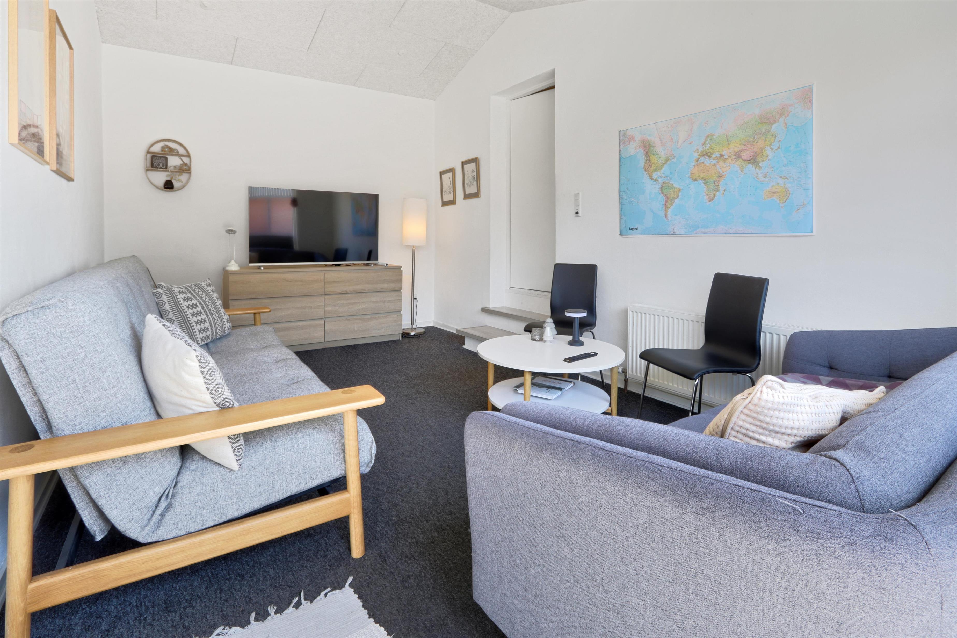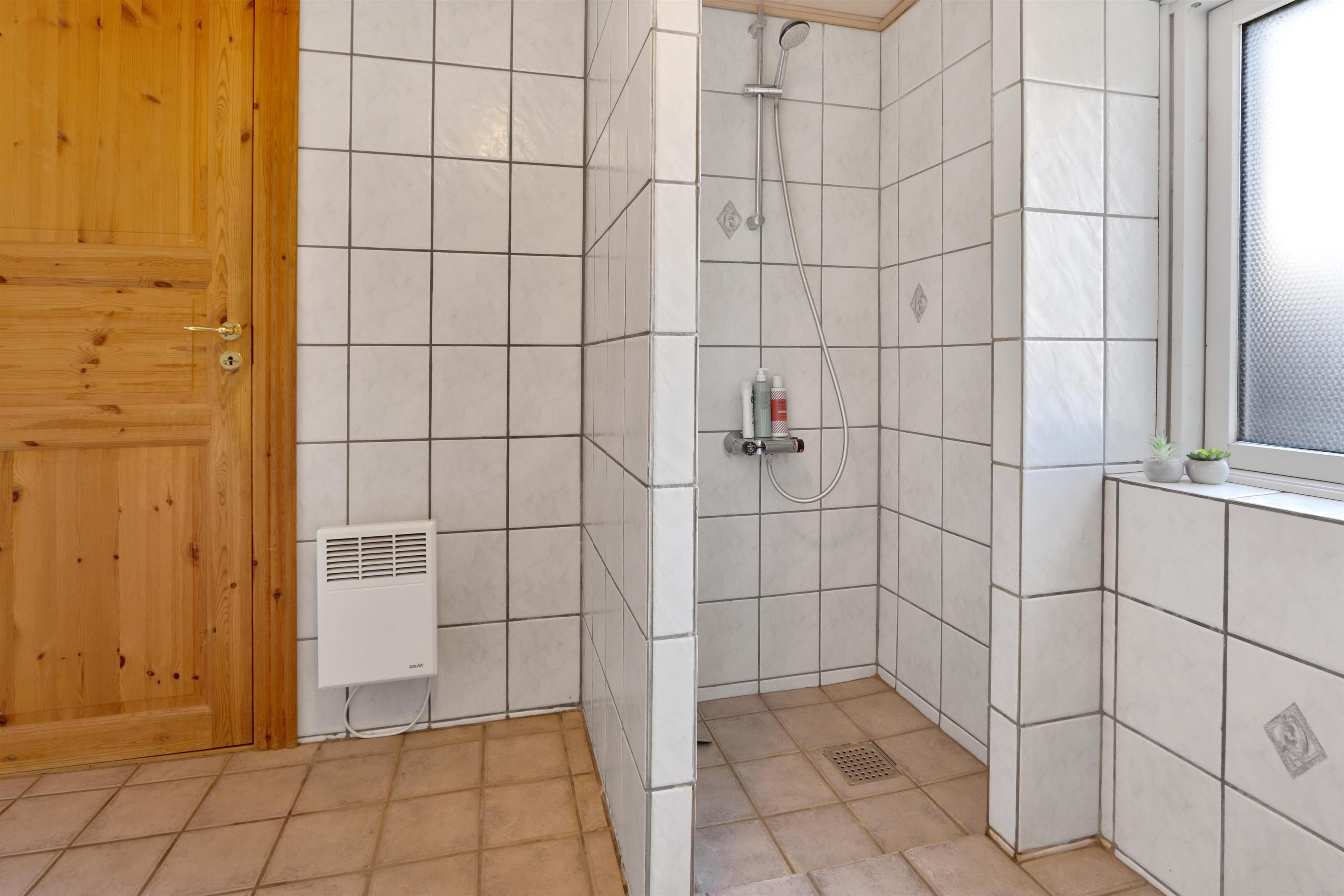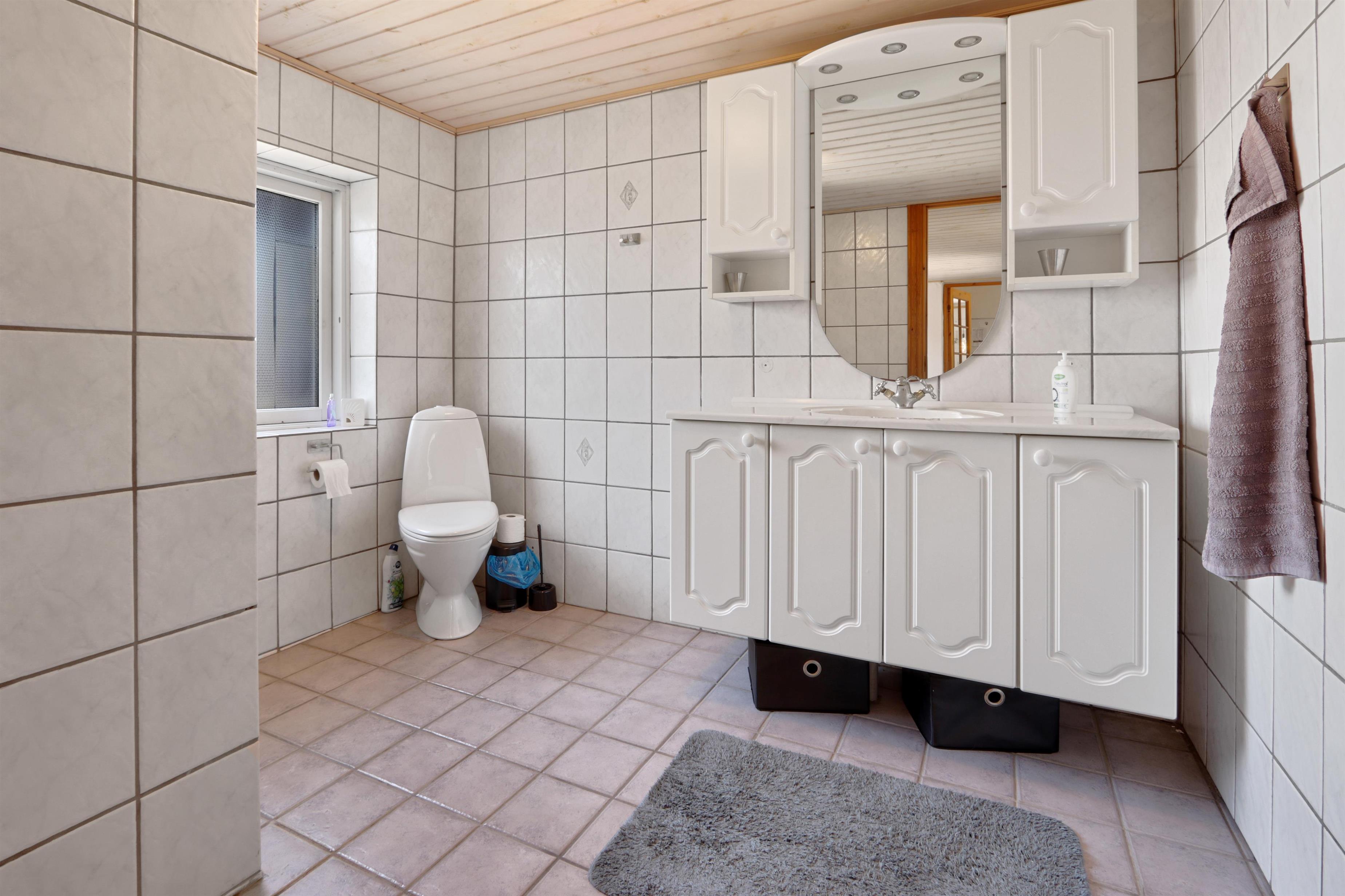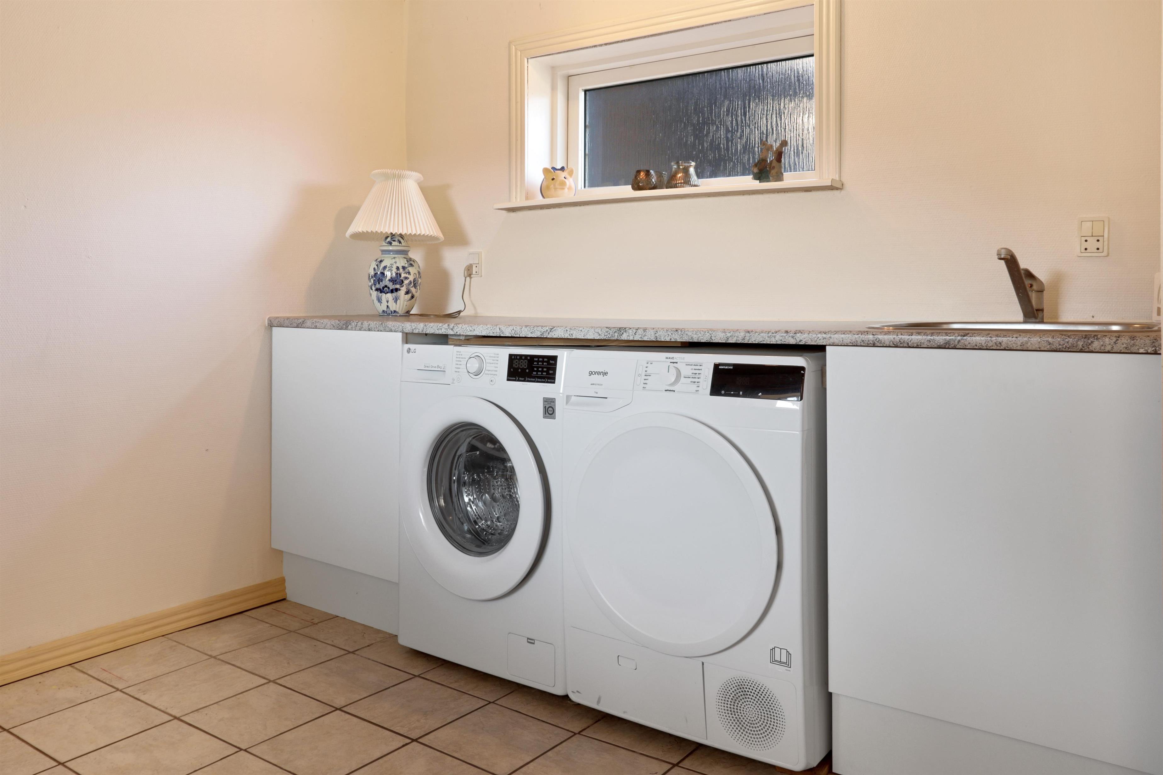 Der er både et badeværelse med bruser, toilet og håndvask, samt et ekstra gæste-WC. Til de mindste gæster er der en barneseng til rådighed. I husets entré er der god bordplads, vaskemaskine, tørretumbler og en vask. Desuden byder huset på en ekstra stue med komfortable møbler og endnu et TV.
