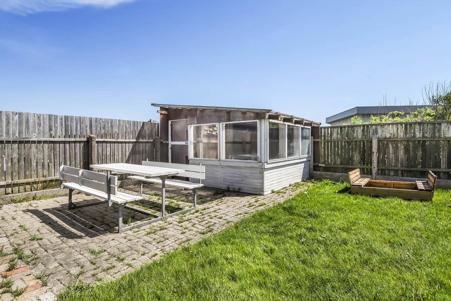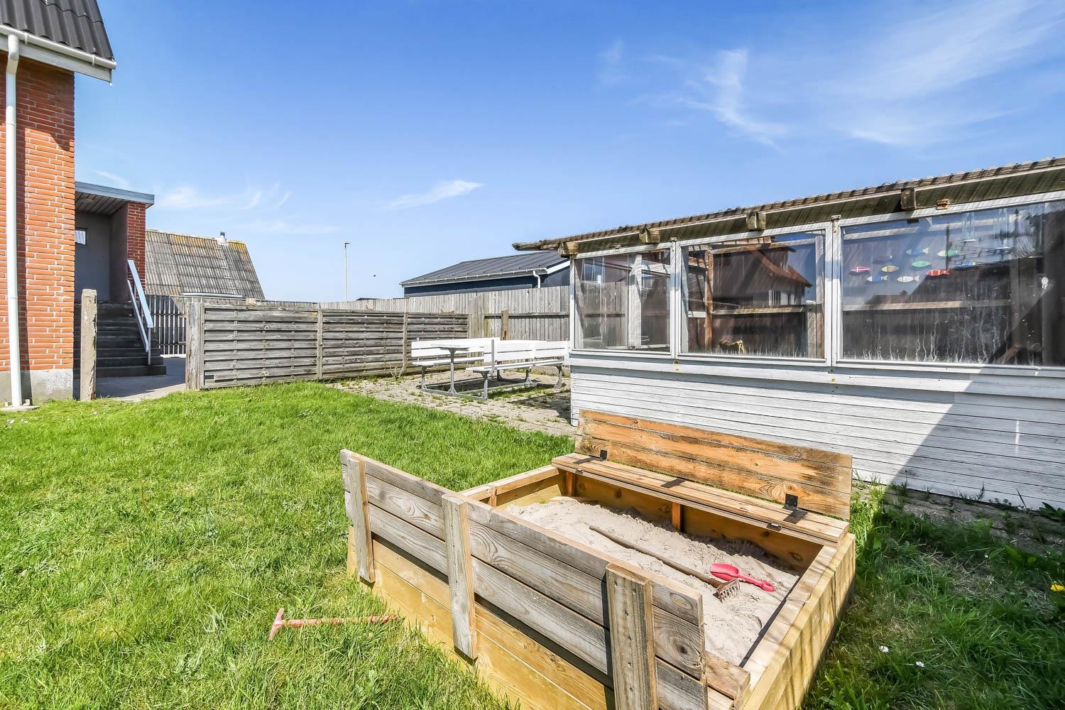 Huset ligger på en 505 m2 velholdt, indhegnet grund. Fra baggangen er der udgang til en terrassen / haven. I hjørnet af huset er der et dejligt havehus. Havehuset er ikke opvarmet – men så snart der er lidt sol på himmelen er det er pragtfuldt sted, at sidde og nyde en dejlig kop kaffe. Der er massere af havemøbler samt grill som kan flyttes rundt så man altid kan finde en plads i solen. Fra huset kan alle Thyborøns attraktioner og restauranter nås i gåafstand. Tag en havnerunde og nyd livet på havnen, besøg fiskeriauktionen i sæsonen eller prøv en af Vesterhavets mest børnevenlige badestrande lige før Vesterhavet bliver til Limfjord blot 1000 meter fra huset. Stranden som ligger 150 m fra huset udmærker sig ved at være mere egnet til lystfiskeri, snorkling og dykning samt flyve med drage og samle rav eller måske blot en fantastisk løbe eller gå en tur på diget eller ved stranden. Her kan man også i timevis studere bunkere og sågar gå ind i mange af dem - husk lommelygte. Vandrer man fra huset under 1 kilometer mod syd kommer man til et stort fuglereservat hvor man i fred og ro kan vandre rundt og betragte naturen på alle årstider. I gå afstand på 100 meter ligger en nybygget stor skaterpark ligesom det egen artige Sneglehus som er beklædt med sneglehuse også er et besøg værd.