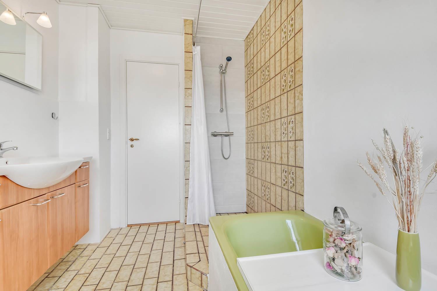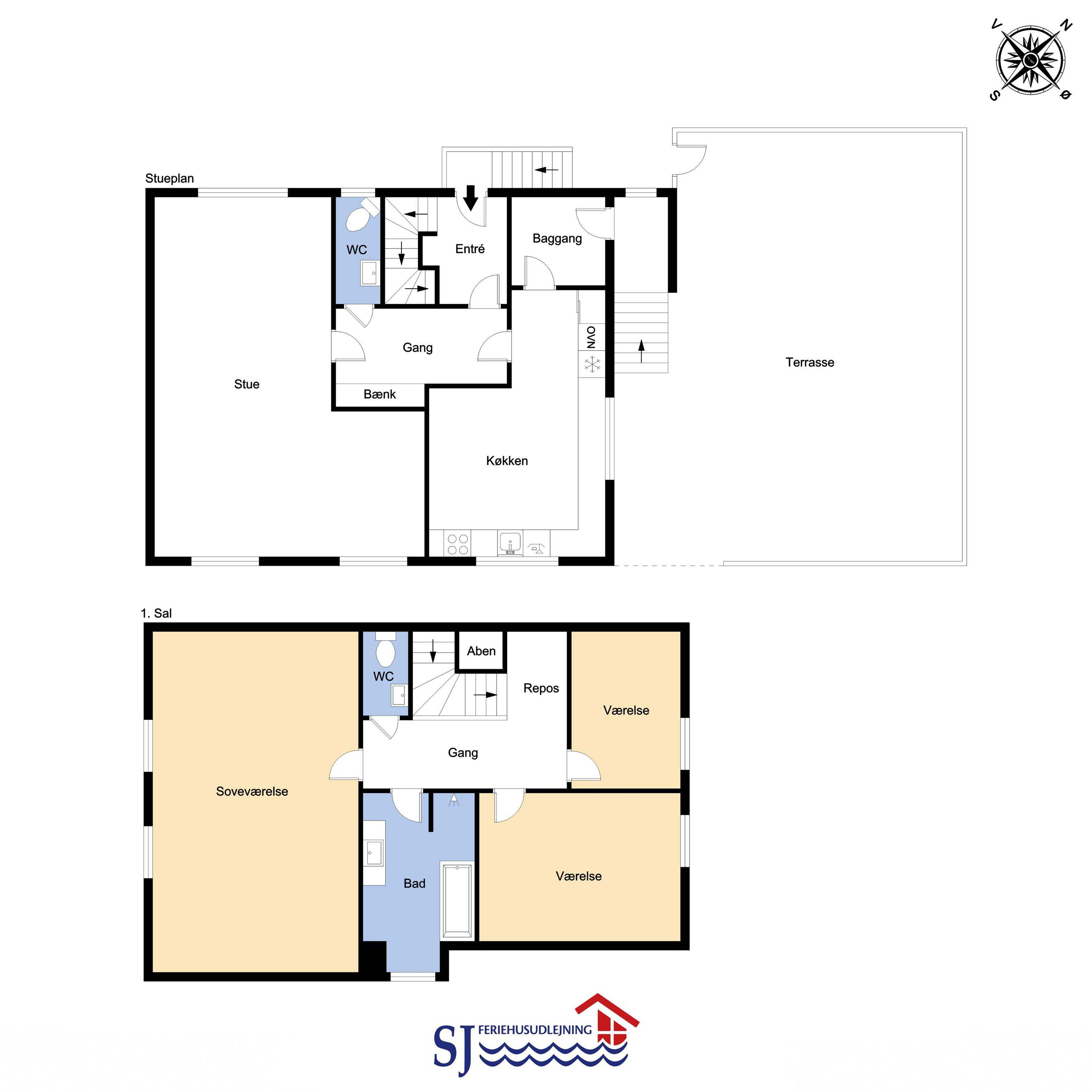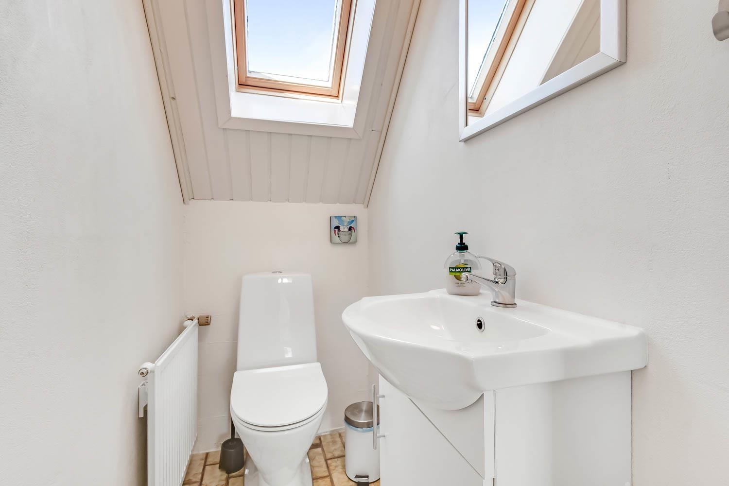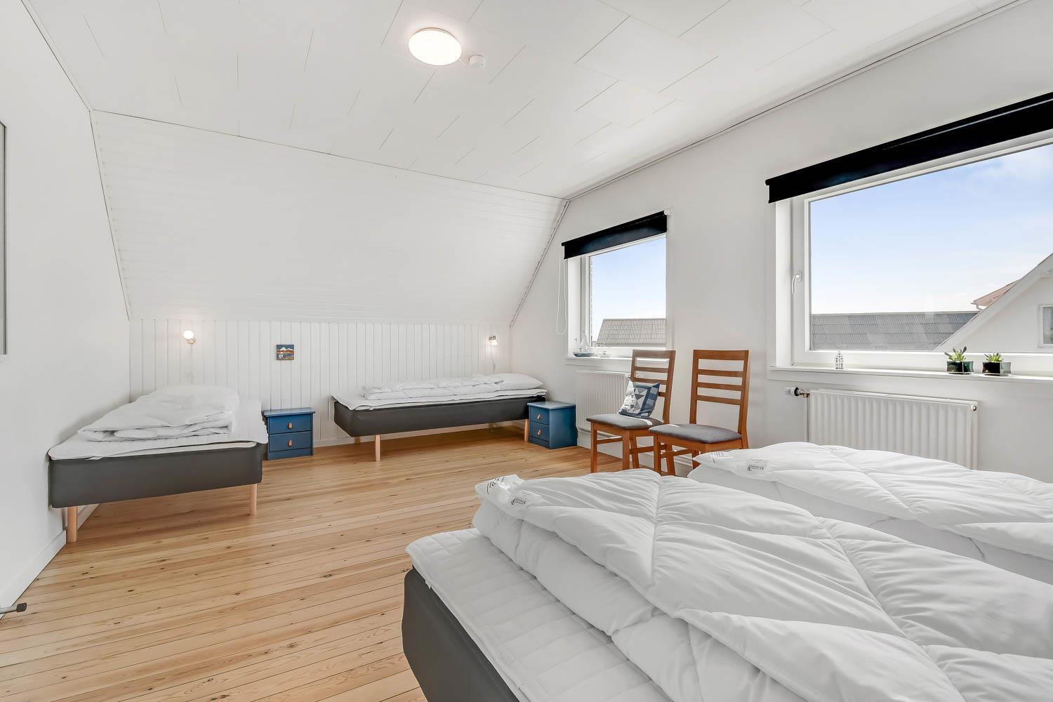 På første sal, tilgået via trappen i entréen, er der 3 soveværelser. 1 stort værelse med 4 sovepladser (1DS + 2 ES). Herudover er der 2 soveværelser med hver en dobbeltseng (1DS) + (1DS). Der er også et lille toilet med håndvask samt seperat badeværelse med badekar og bruser på 1. sal.