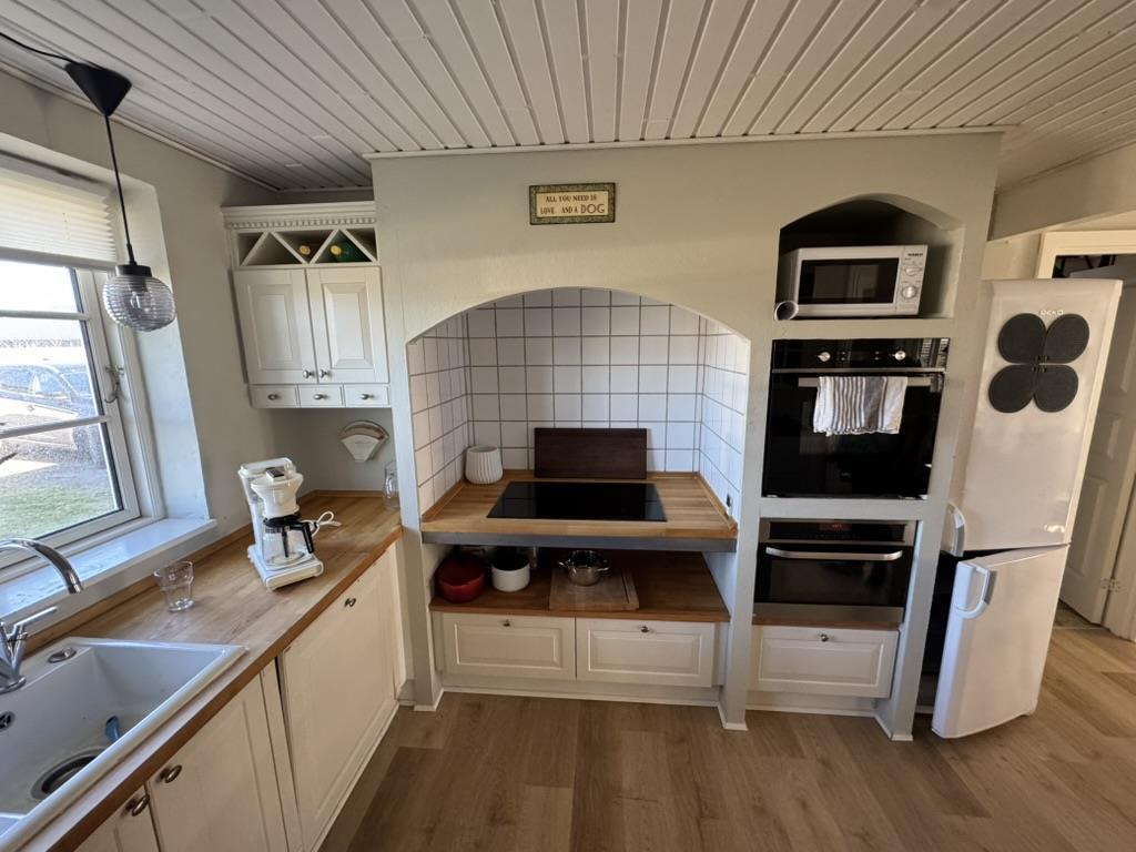 Køkkenet ligger i forbindelse med stuen, og her finder I alt, hvad I har brug for. Det er et dejligt, stort spisebord med plads til alle.