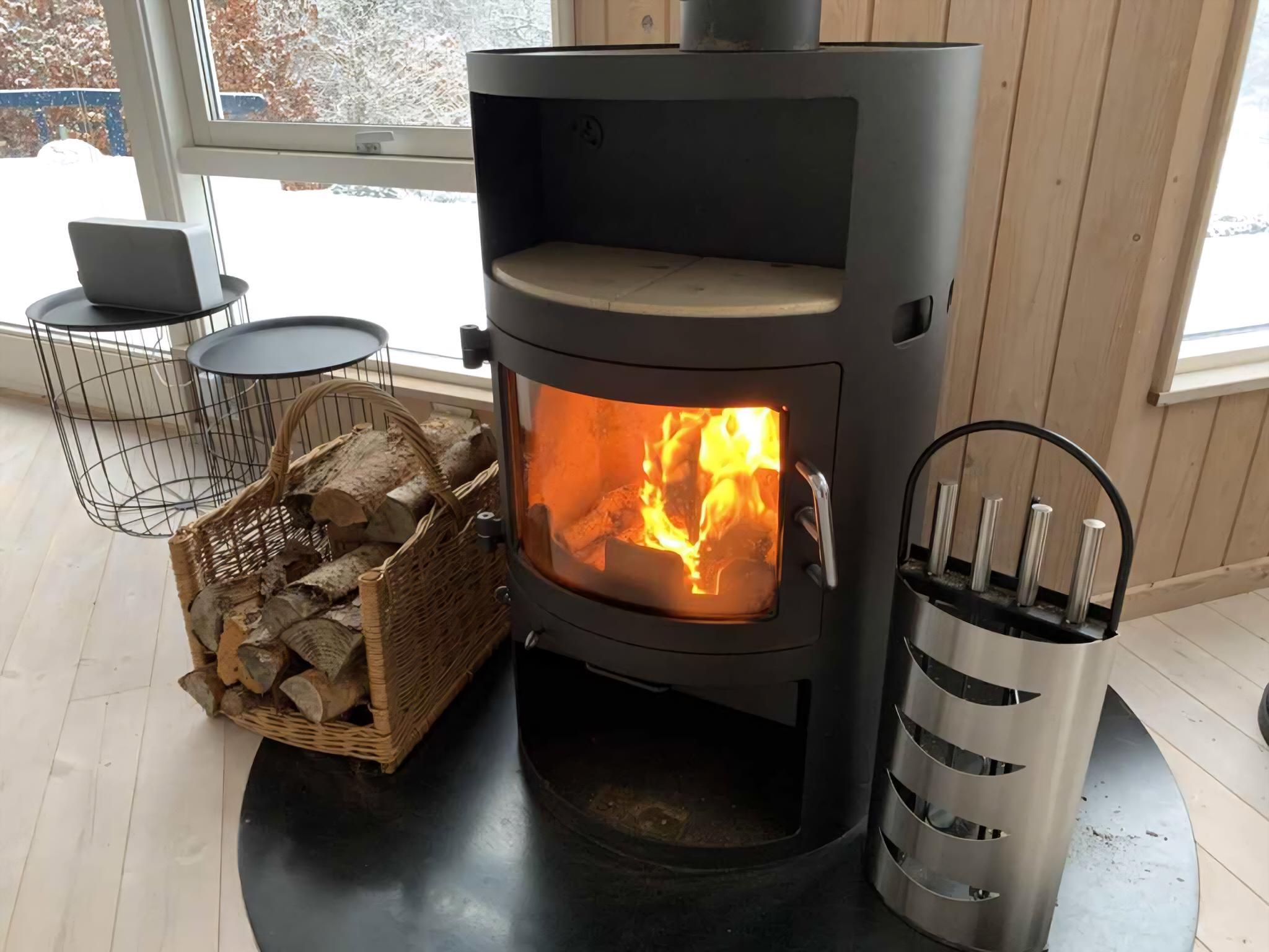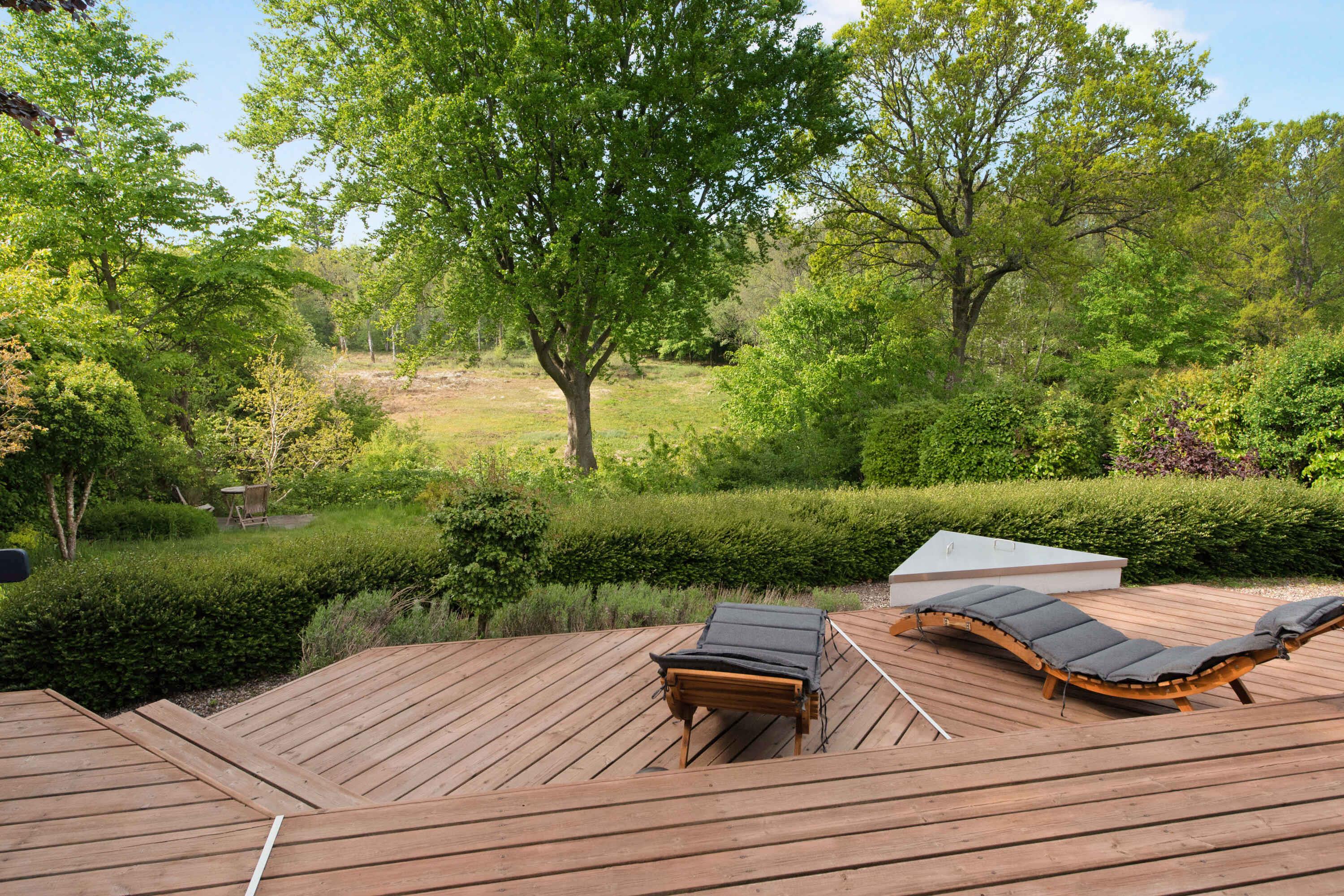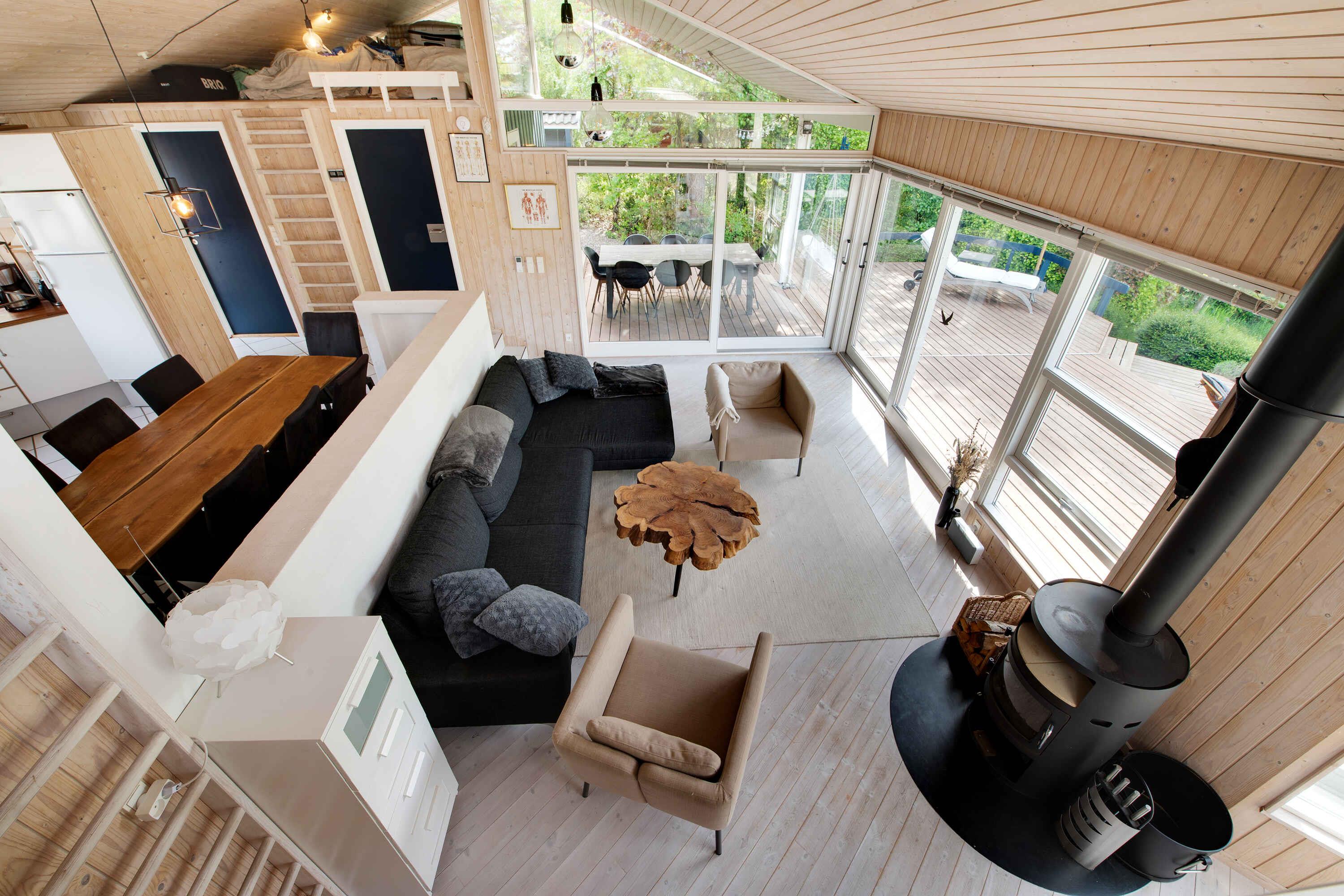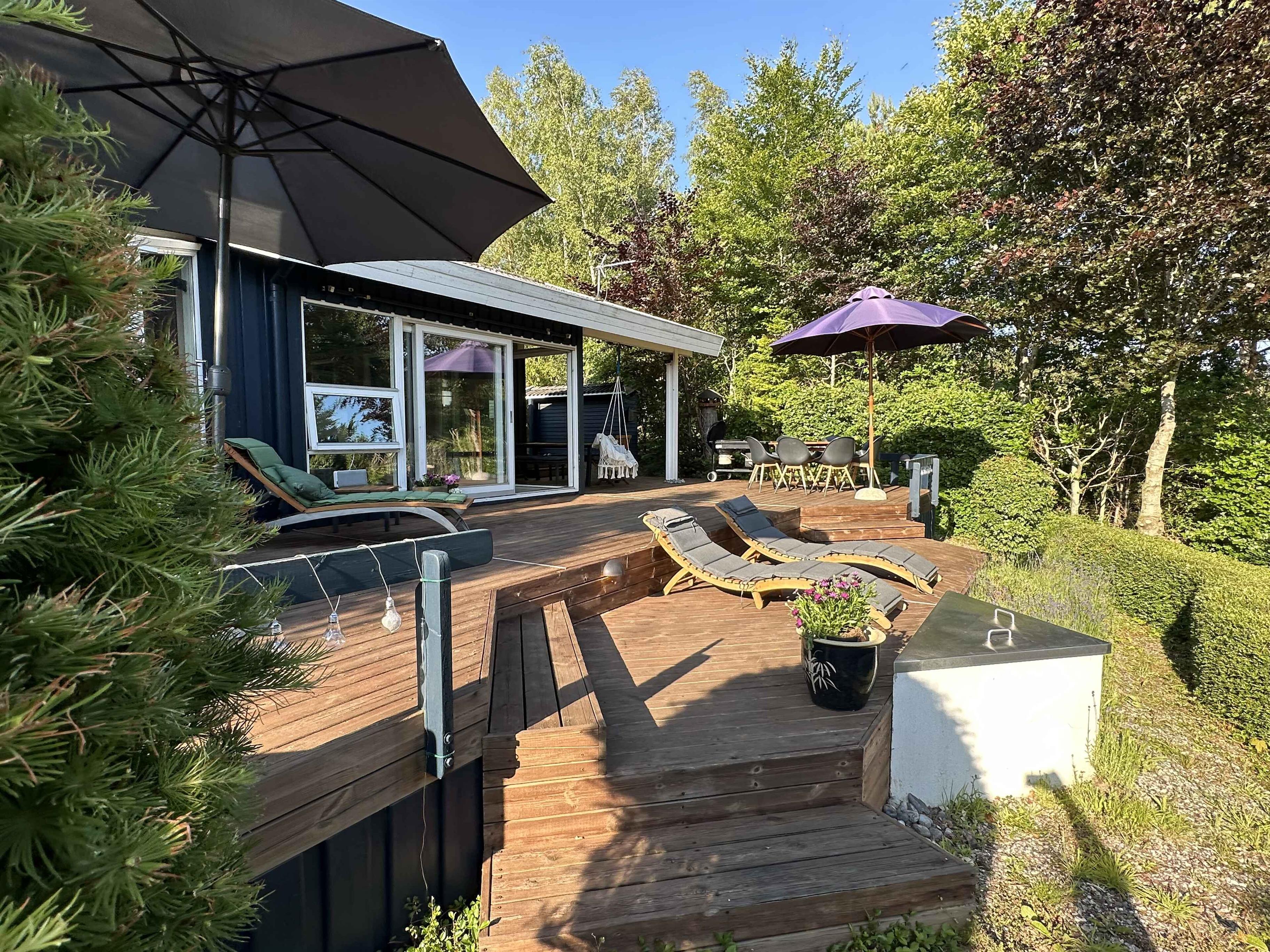 Hyggeligt sommerhus i Nordsjælland med panoramaudsigt over natur, spa, brændeovn og stor terrasse tæt på strand og byliv.